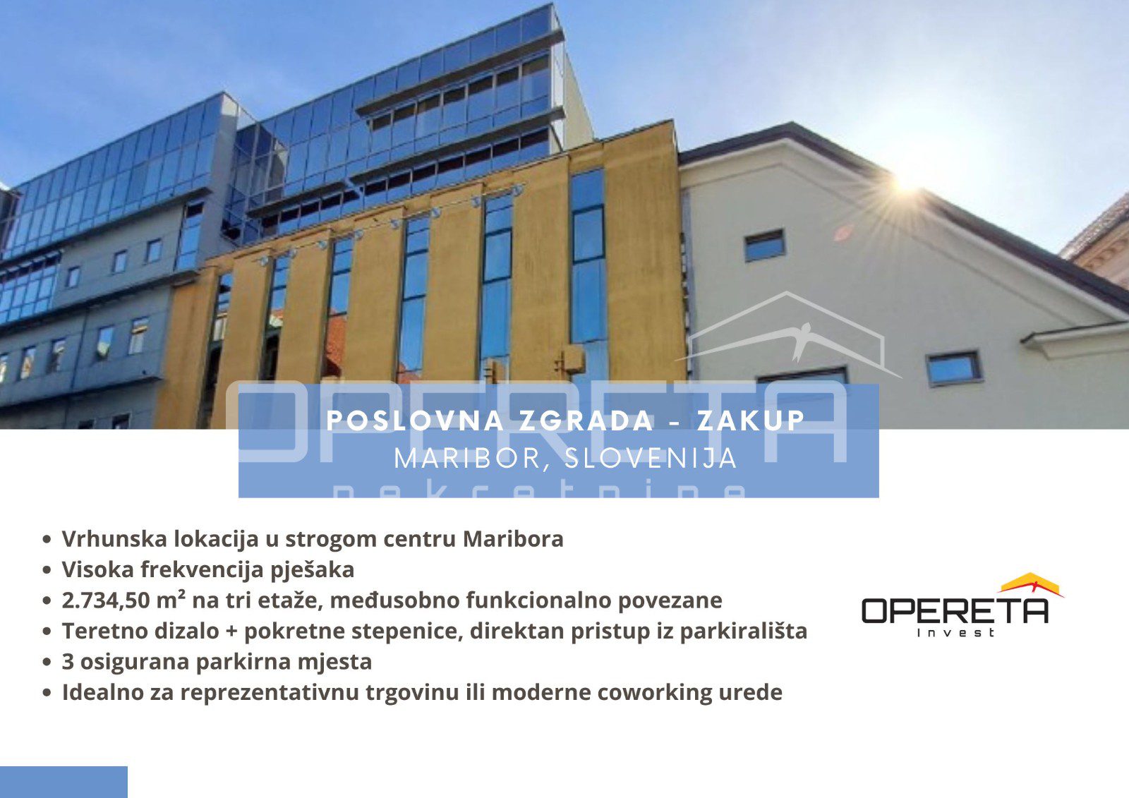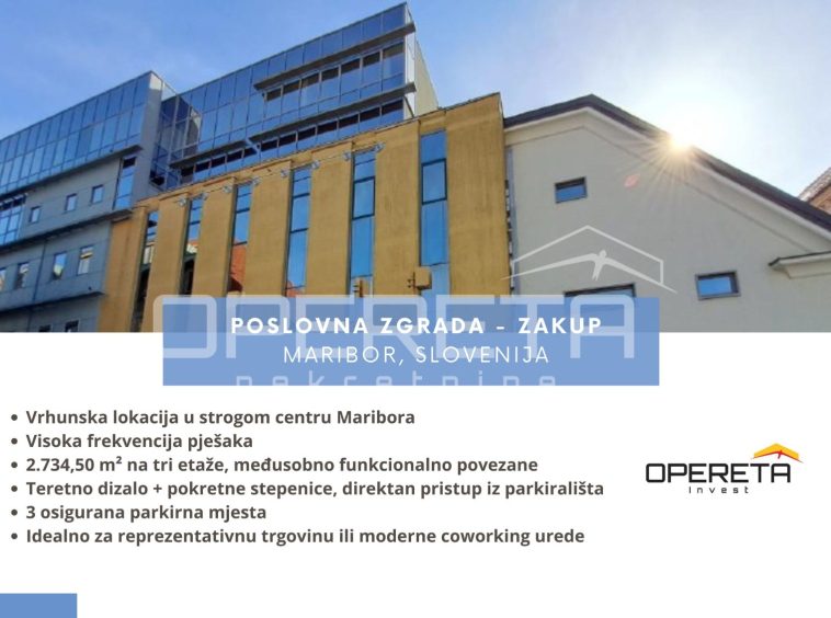 At an exceptional location in the very historical and business center of Maribor, a representative office building intended for various commercial activities is offered for lease. The property is located in an area of extremely high pedestrian traffic and is characterized by excellent visibility, ease of access, and immediate proximity to shops, hospitality establishments, cultural institutions, and business facilities, ensuring a constant flow of visitors and strong business potential.