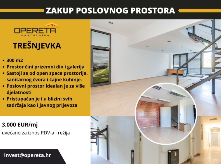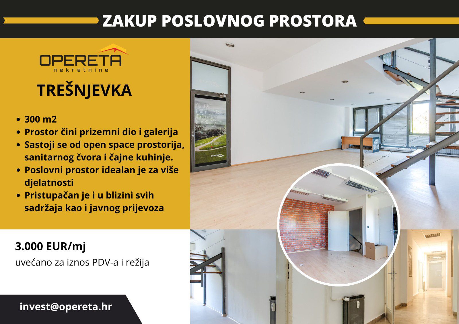 Business premises for rent in Trešnjevka with a total area of approximately 300 m2. The premises consist of a ground floor and a gallery. It consists of open space rooms, a toilet and a kitchenette.