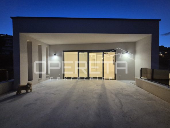 The entire southern façade opens up to the terrace through sliding glass doors, bringing in abundant daylight and offering uninterrupted sea views – especially prominent in autumn and winter when the tree canopies thin out. The 37 m² stone terrace serves as an extension of the living space and is surrounded by lush Mediterranean vegetation: fig trees, bougainvillea, palms, lemons, and maples. In addition, there is a small private garden of 10 m², all situated on a plot of 486 m².