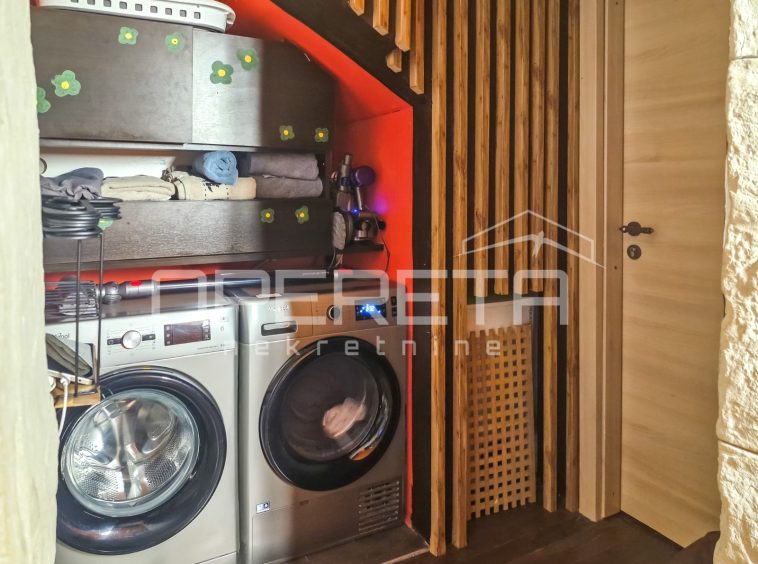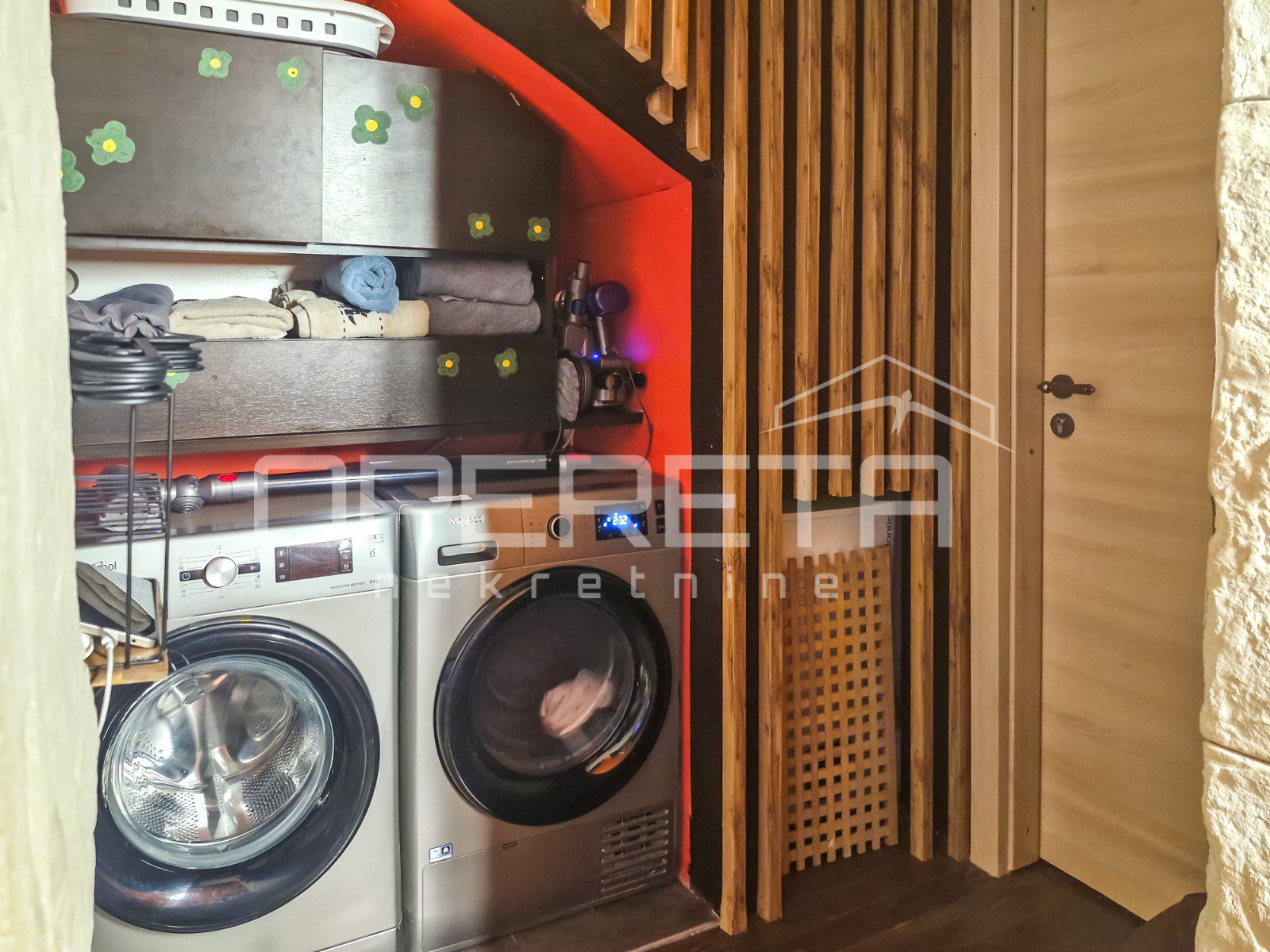 The two apartments, which feel more spacious than their registered surface in the land registry, are separated by a small entrance staircase, hallway, and a practical laundry room.