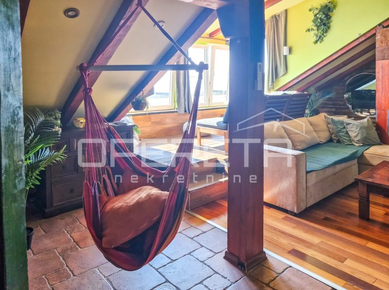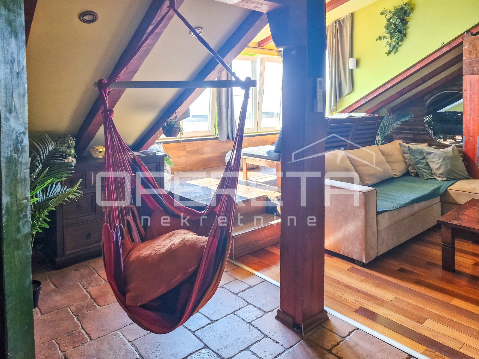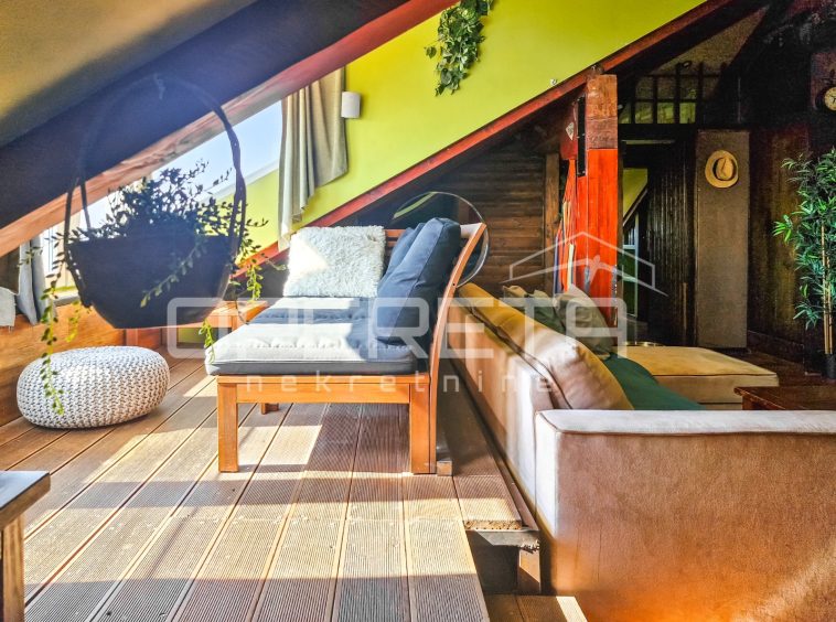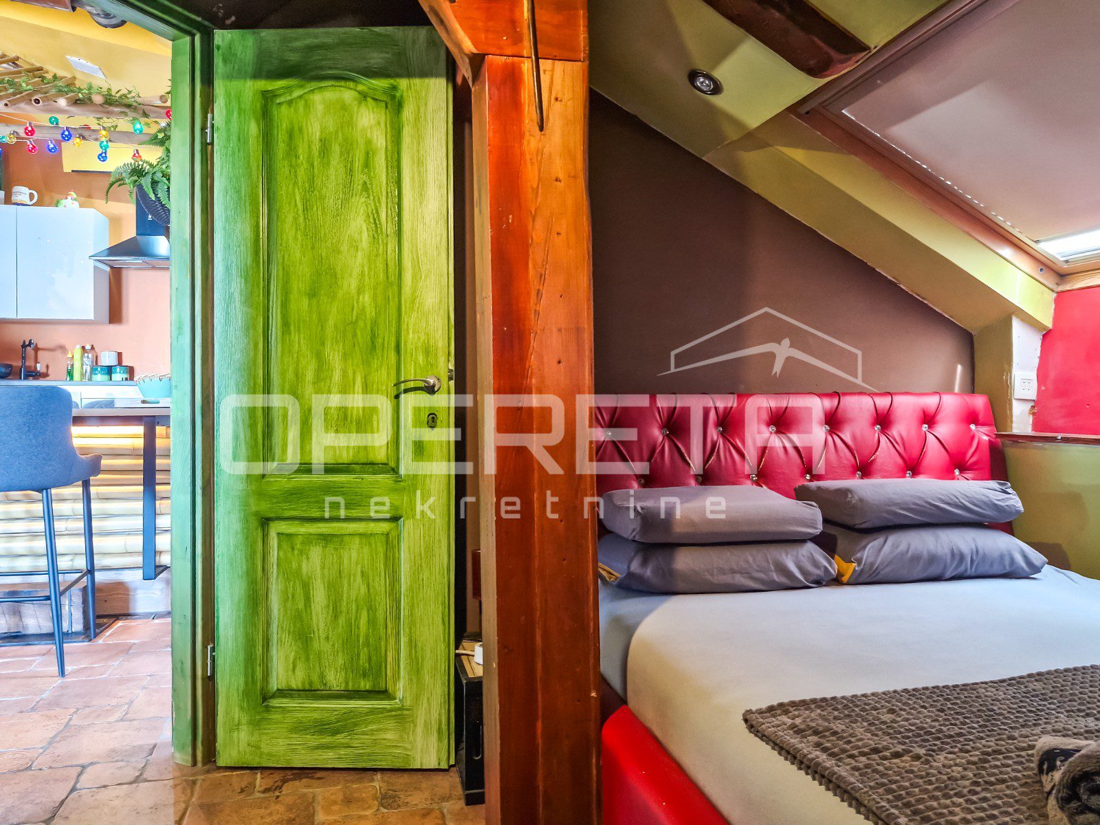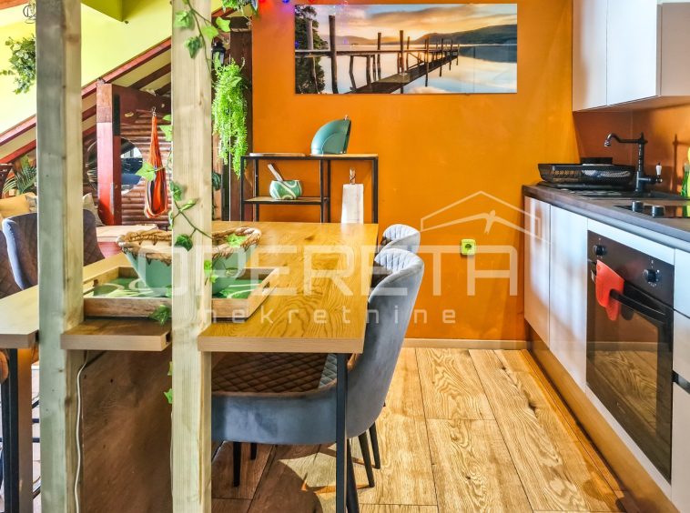 The smaller, southern apartment, with views of Mount Srđ and a skylight overlooking the sea, features an open-plan living room with kitchen and dining area, a bedroom, a gallery with a cozy lounge area, workspace, and a bathroom.