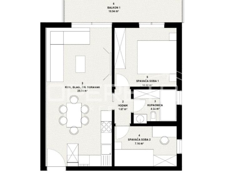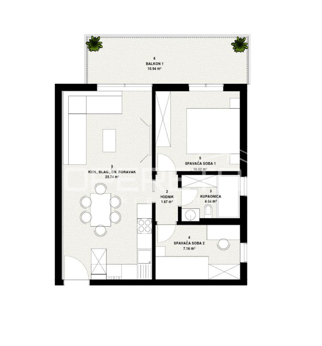 The bedroom floors will feature Galeković parquet, while the living room, kitchen, and hallway will have Atlas Concorde ceramic tiles, selectable by the buyer if purchased during the final construction phase. The bathroom is equipped with Laufen and Roca sanitary ware and underfloor heating.
