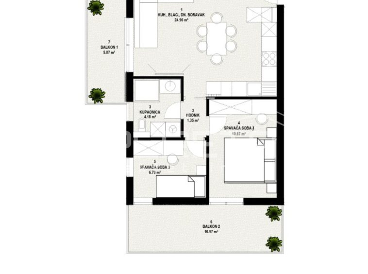 The bedroom floors will feature Galeković parquet, while the living room, kitchen, and hallway will have Atlas Concorde ceramic tiles, selectable by the buyer if purchased during the final construction phase. The bathroom is equipped with Laufen and Roca sanitary ware and underfloor heating.
