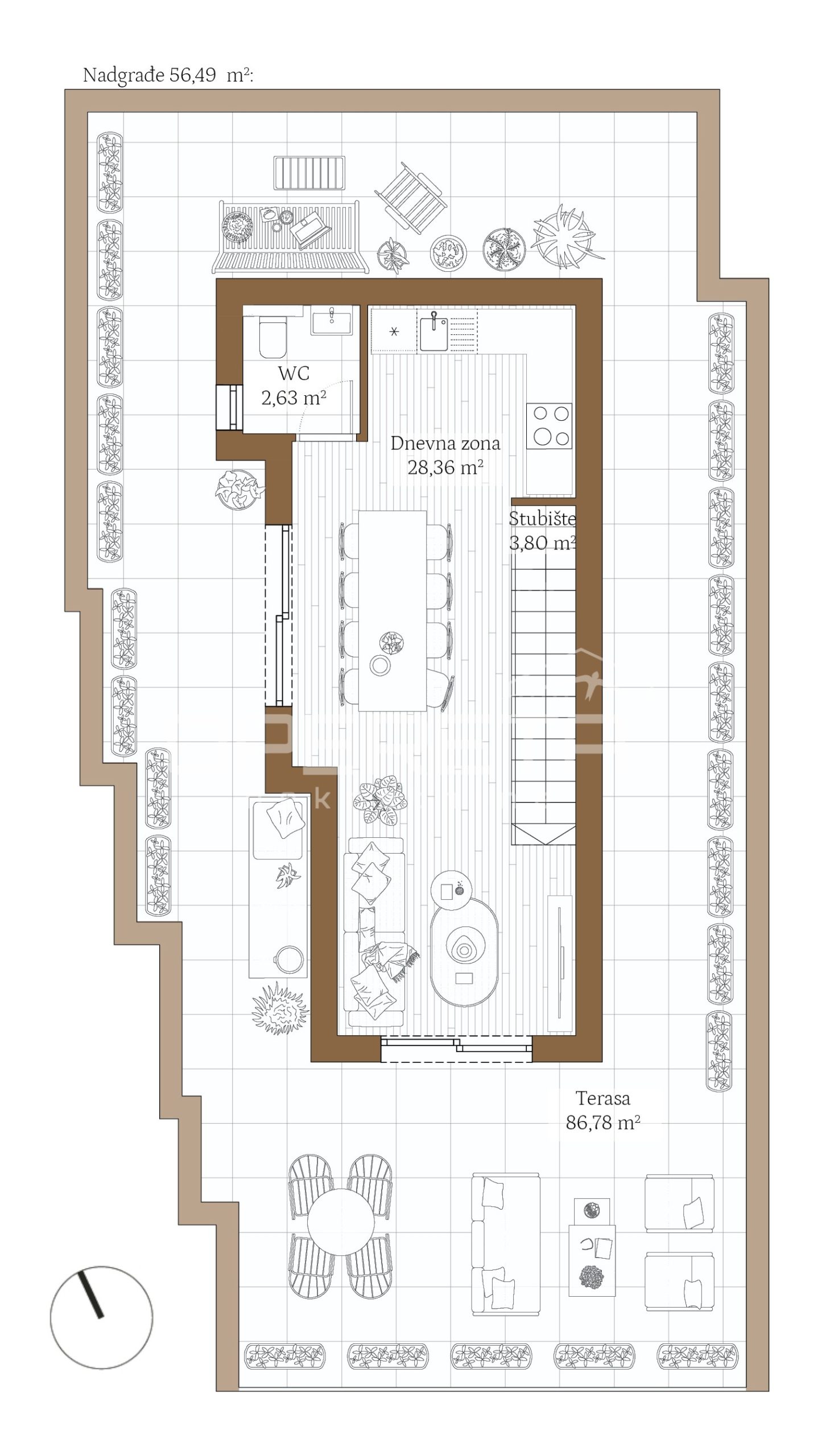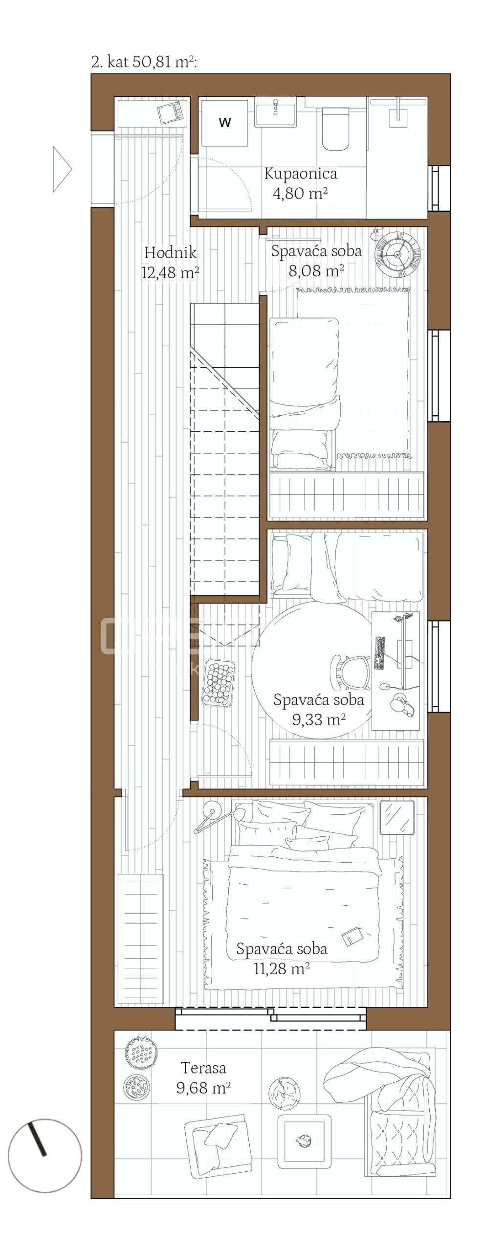 A duplex apartment consisting of three bedrooms, living space with kitchen and dining area, bathroom, WC, and two terraces with a total size of 96 m².