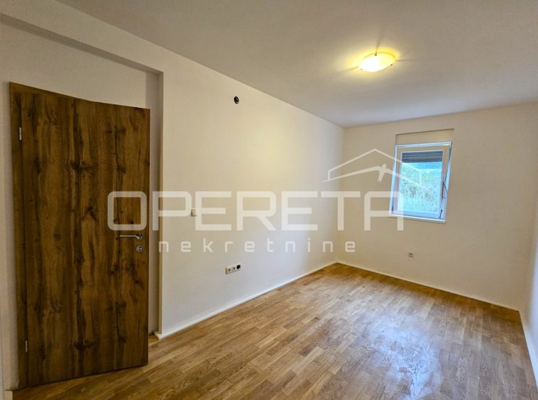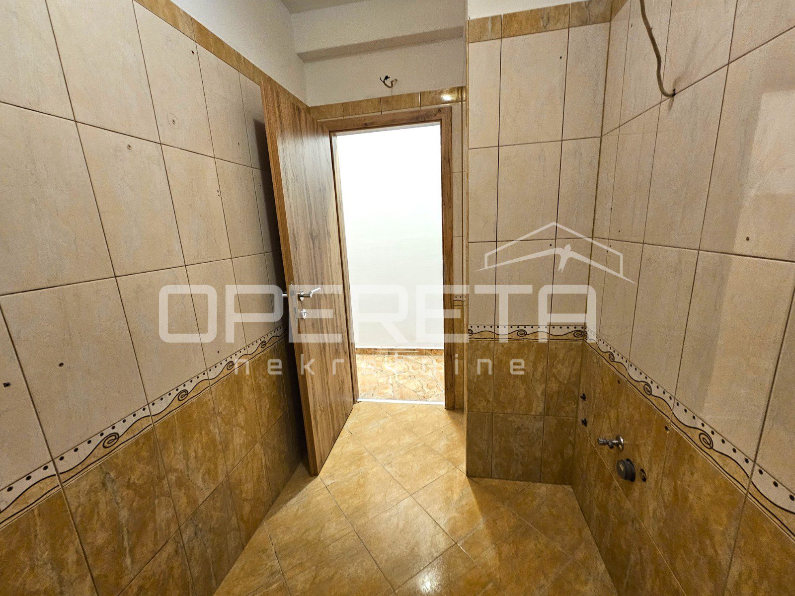The apartment consists of an open-plan kitchen, dining area and living room, hallway, two bedrooms, and two bathrooms with toilets. One bathroom is fully finished and equipped, while the other is prepared for completion, with sanitary fixtures yet to be installed, allowing the future owner to customize the space according to personal preferences.