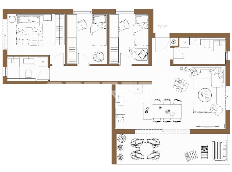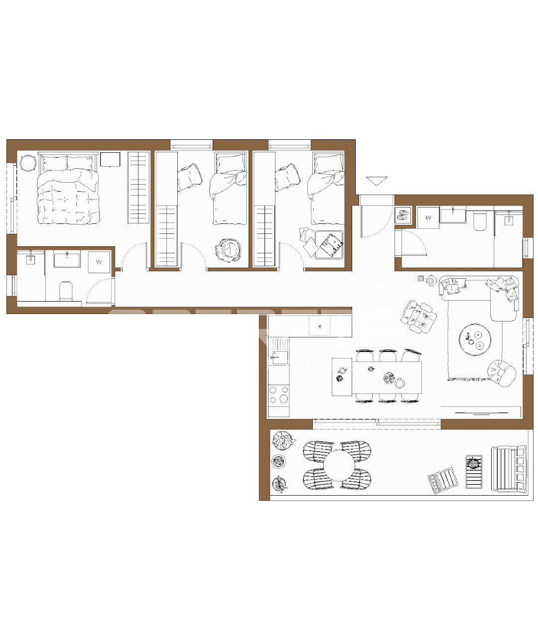 A single-floor apartment comprising three bedrooms, a living area with kitchen and dining room, two bathrooms, and a 15 m² terrace.