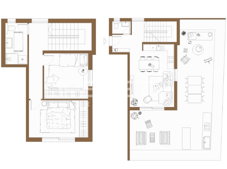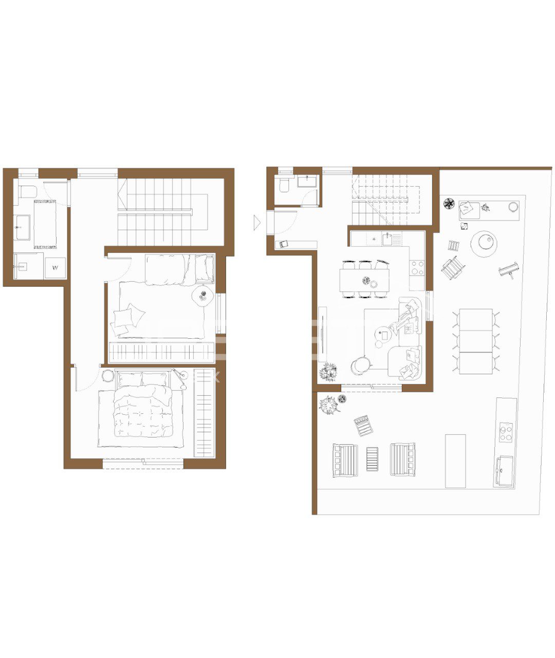 A duplex apartment consisting of two bedrooms, an open-plan living room with kitchen and dining area, two bathrooms (one on each floor), and a terrace/garden area of 69 m².