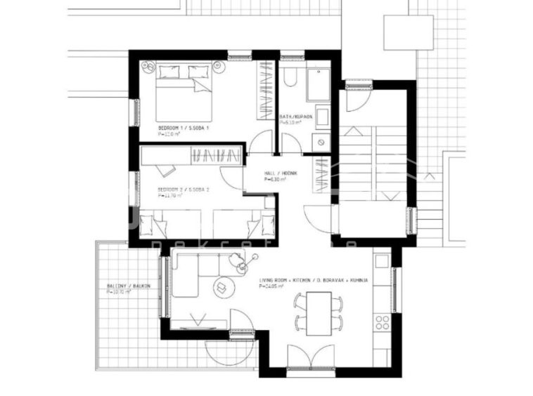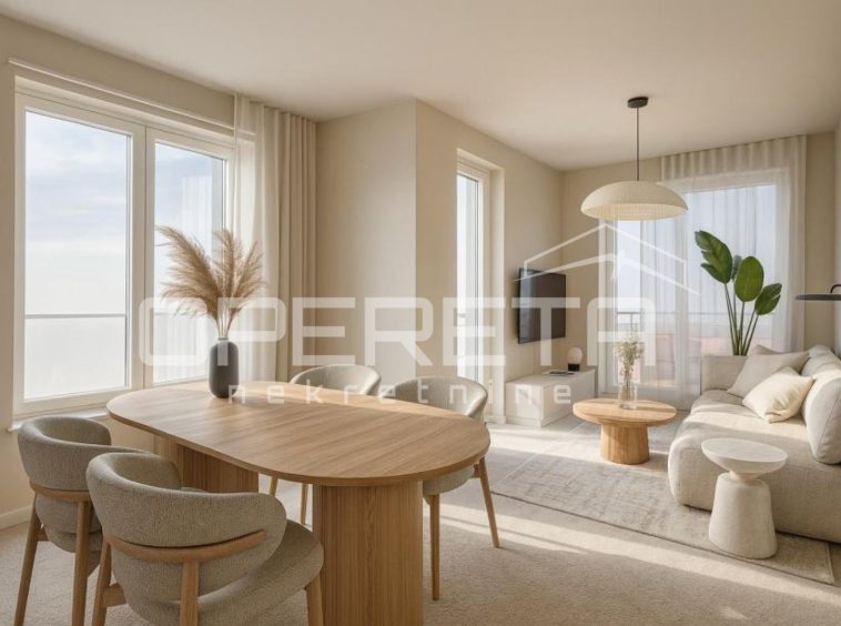 The apartment comprises two bedrooms, a bathroom, and a spacious open-plan living area with kitchen and dining room. It is sold in a high roh-bau finishing stage, including fully installed sanitary fittings, high-quality floor coverings, installed windows and doors, security entrance doors, and all necessary utility connections. The kitchen and furniture are not included, allowing the future owner full interior customization to the highest standards.