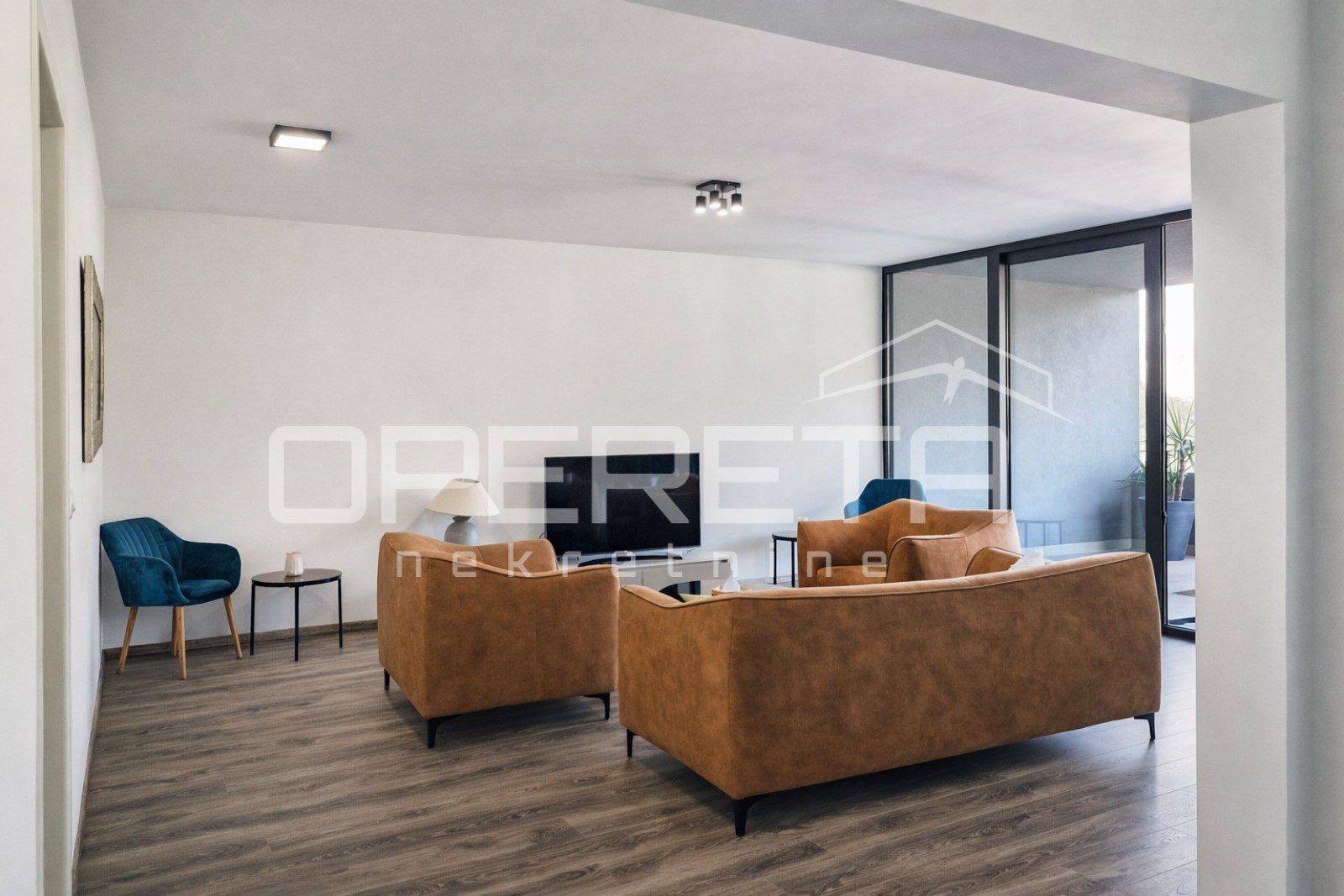 The interior is situated on the first floor of the western part of the building and has been thoughtfully designed for comfortable and luxurious living. It consists of an open and airy living room with a kitchen, two bedrooms, two bathrooms, a hallway, a toilet, a laundry room, and a covered balcony ideal for unwinding while enjoying the sea view.
