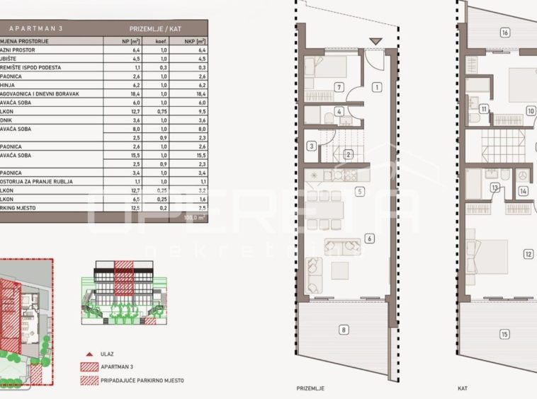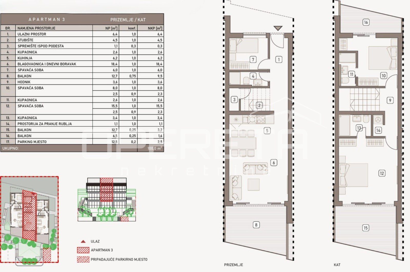 The apartment spans two floors and has a total net surface of 100.0 m², with a north-south orientation. The ground floor features an open-plan living area with a kitchen and dining room, one bedroom, and a modern bathroom. The living room opens onto a balcony with views of greenery and the sea, seamlessly blending indoor and outdoor spaces. The upper floor consists of two bedrooms, each with its own en-suite bathroom and private balcony, offering privacy and comfort for all household members.