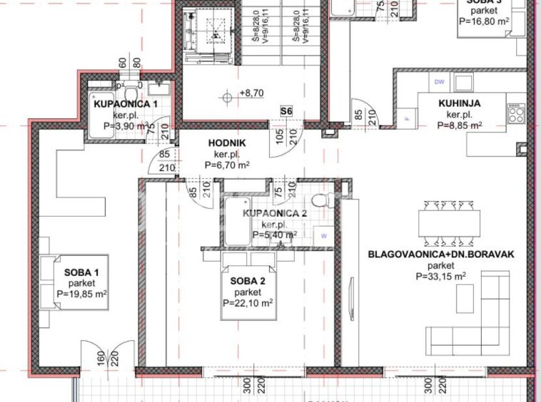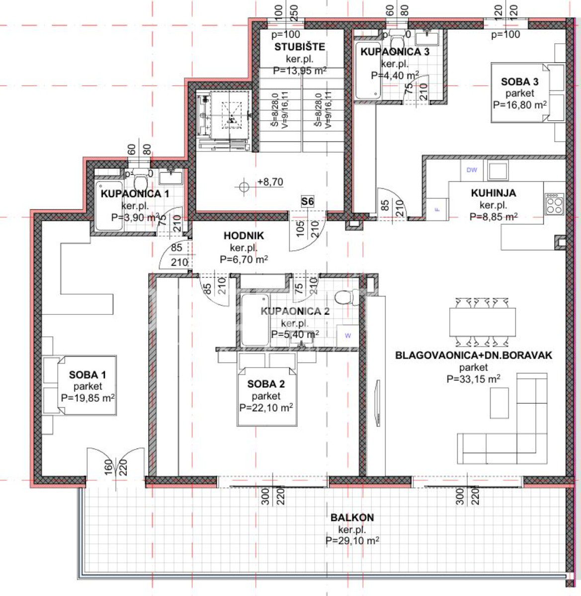 Apartment S6 consists of: hallway 6.70 m², living room and dining area 33.15 m², kitchen 8.85 m², bathroom 1 – 3.90 m², bathroom 2 – 4.40 m², bathroom 3 – 4.40 m², bedroom 1 – 19.85 m², bedroom 2 – 22.10 m², bedroom 3 – 16.90 m².