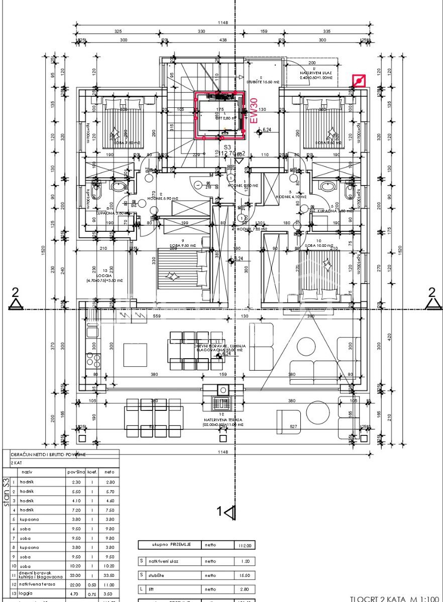 The total net area of the apartment is 112 m², and it is characterized by an extremely functional and family layout.