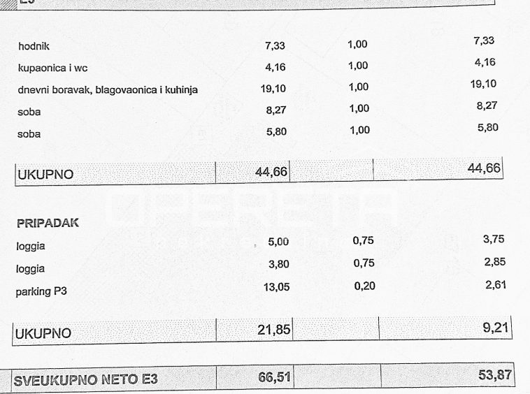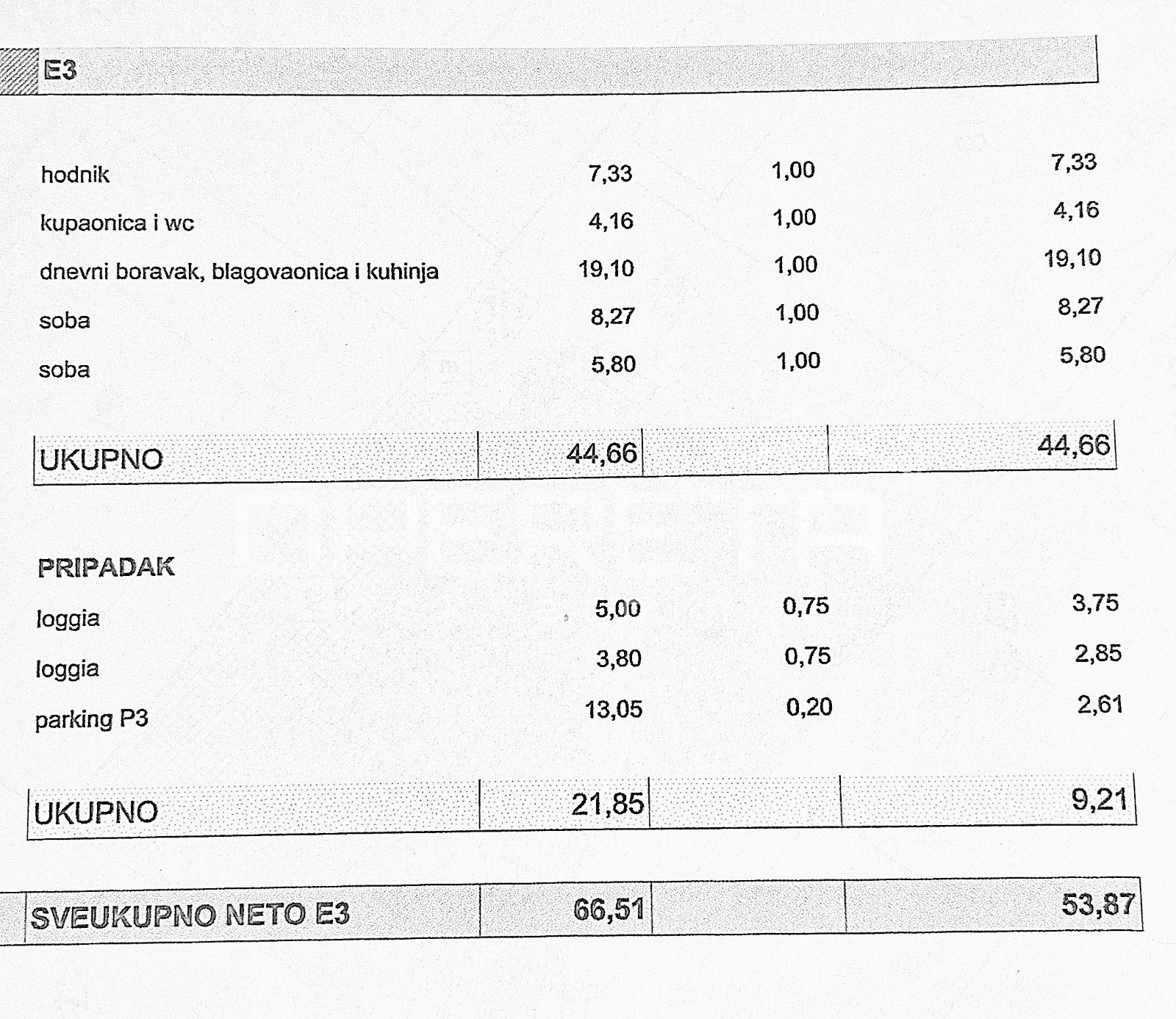 It consists of two bedrooms, a kitchen, a dining room, a living room and a bathroom with a toilet, which together make up 47m2 of closed area. The apartment, calculated according to the coefficients, also includes two loggias as well as an outdoor parking space.
