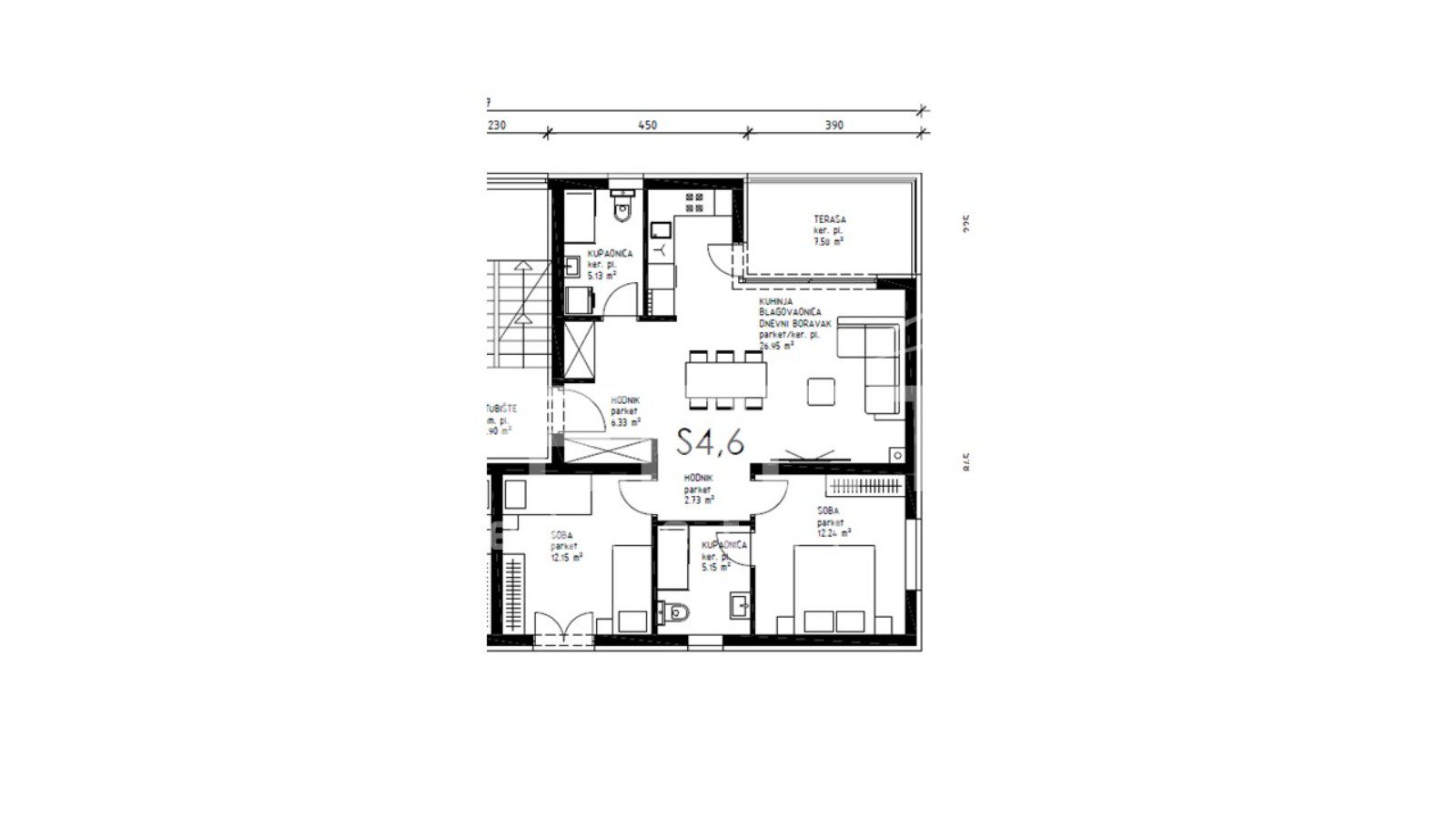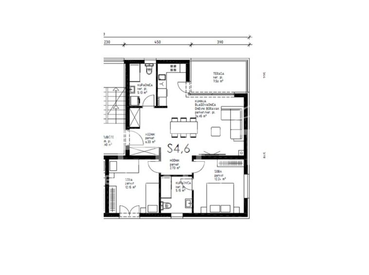 On the first floor of a newly built building, there is a two-bedroom apartment with a terrace. The apartment consists of a hallway, an open-plan living room, kitchen and dining area of 27 m², with access to a covered terrace of 7 m², bathroom 1, and a separate sleeping area with two bedrooms, each 12 m², sharing bathroom 2.