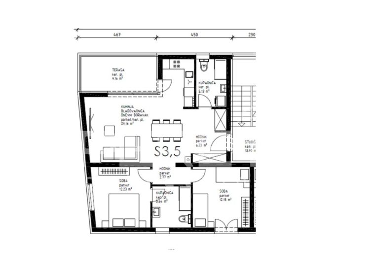 On the first floor of a newly built building, there is a two-bedroom apartment with a northwest-oriented terrace. The apartment consists of a hallway, an open-plan living room, kitchen and dining area of 29 m², with access to a covered terrace of 9 m², bathroom 1, and a separate sleeping area with two bedrooms, each 12 m², sharing bathroom 2.