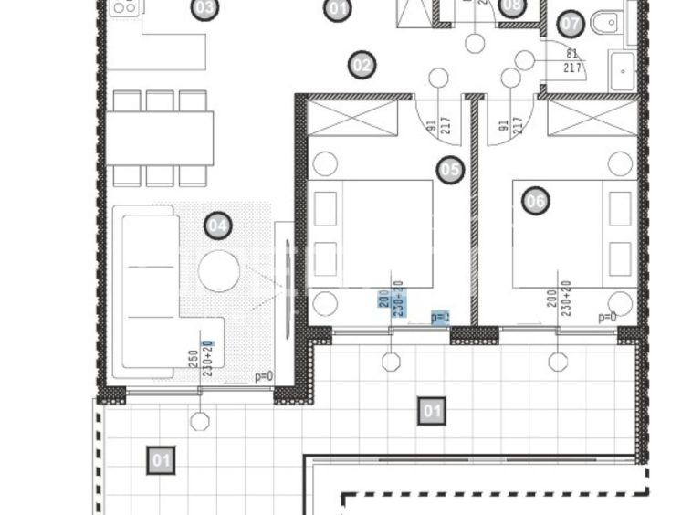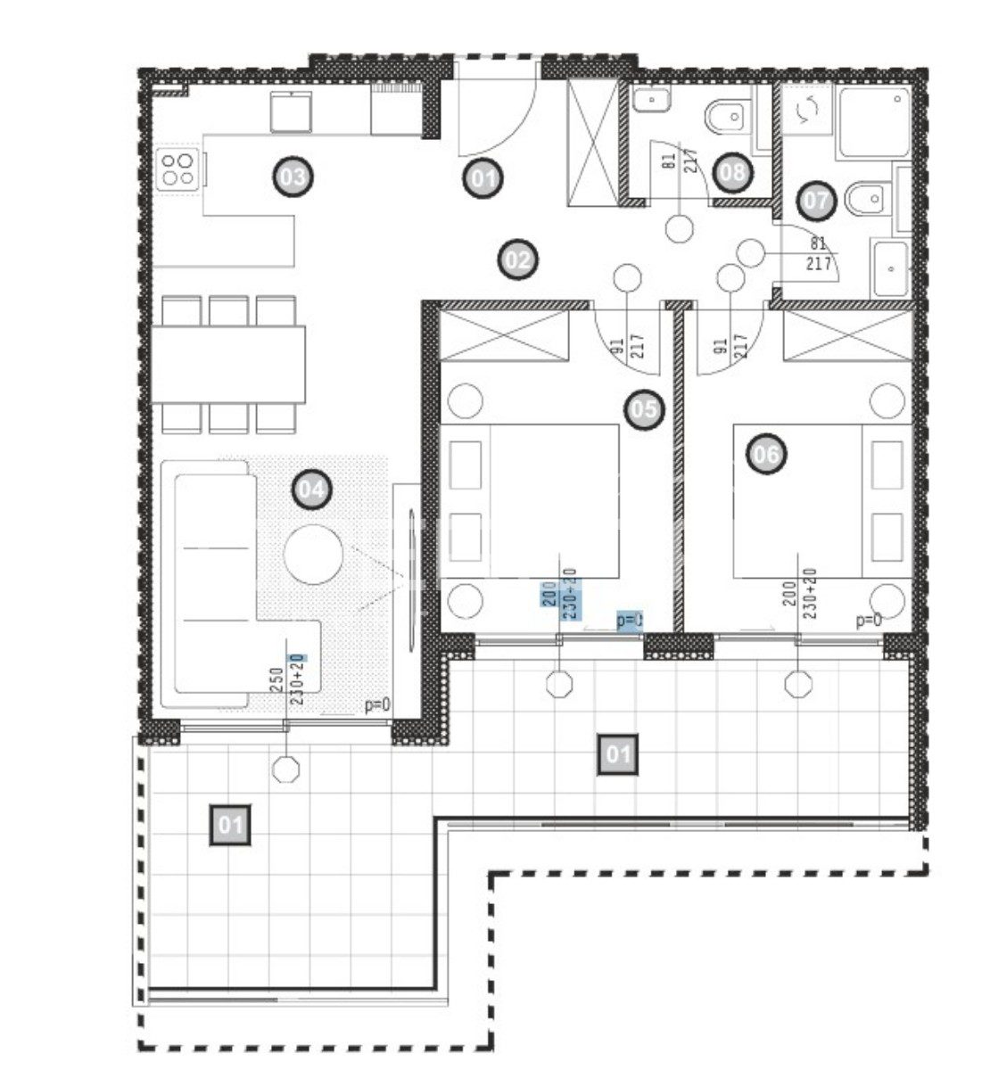 The layout is well-thought-out and functional. The apartment’s net usable area is 68.40 m². The entrance leads into a bright open-plan living area where the kitchen, dining room, and living room are logically connected and oriented to the west and south, ensuring plenty of natural light. Two comfortable bedrooms are situated in the quieter part of the apartment, while the arrangement of the bathrooms (the apartment has two bathrooms with toilets) enhances daily functionality and privacy.