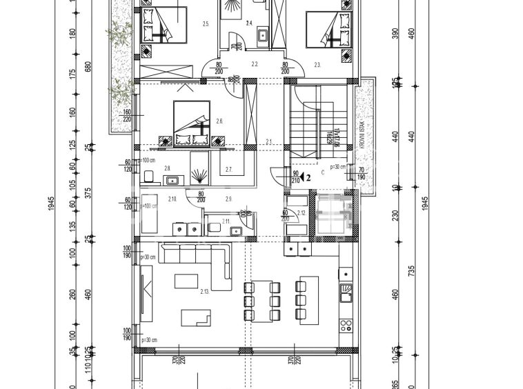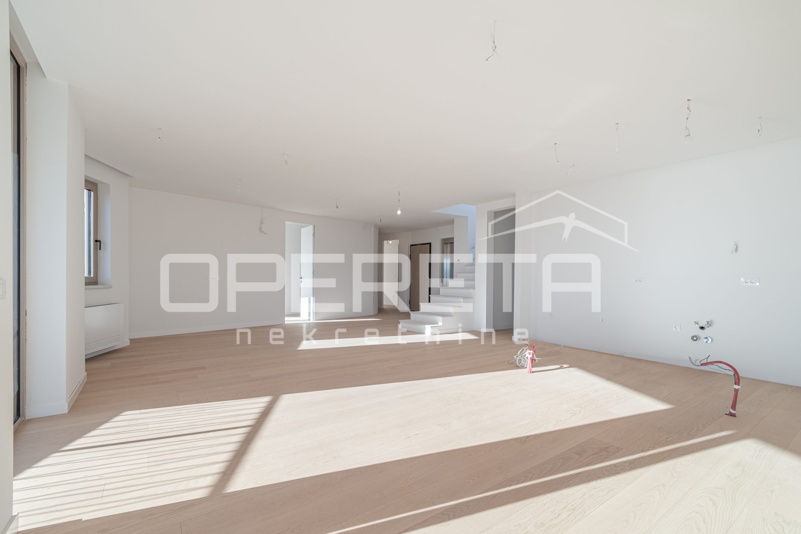 The apartment, with a total area of 193.48 m², consists of a hallway with staircase, a spacious living room with kitchen and dining area, three bedrooms, three walk-in closets, three bathrooms, a sauna, a storage room, an additional toilet, hallway and two covered balconies. The apartment also includes a covered terrace in the attic of 13.06 m².