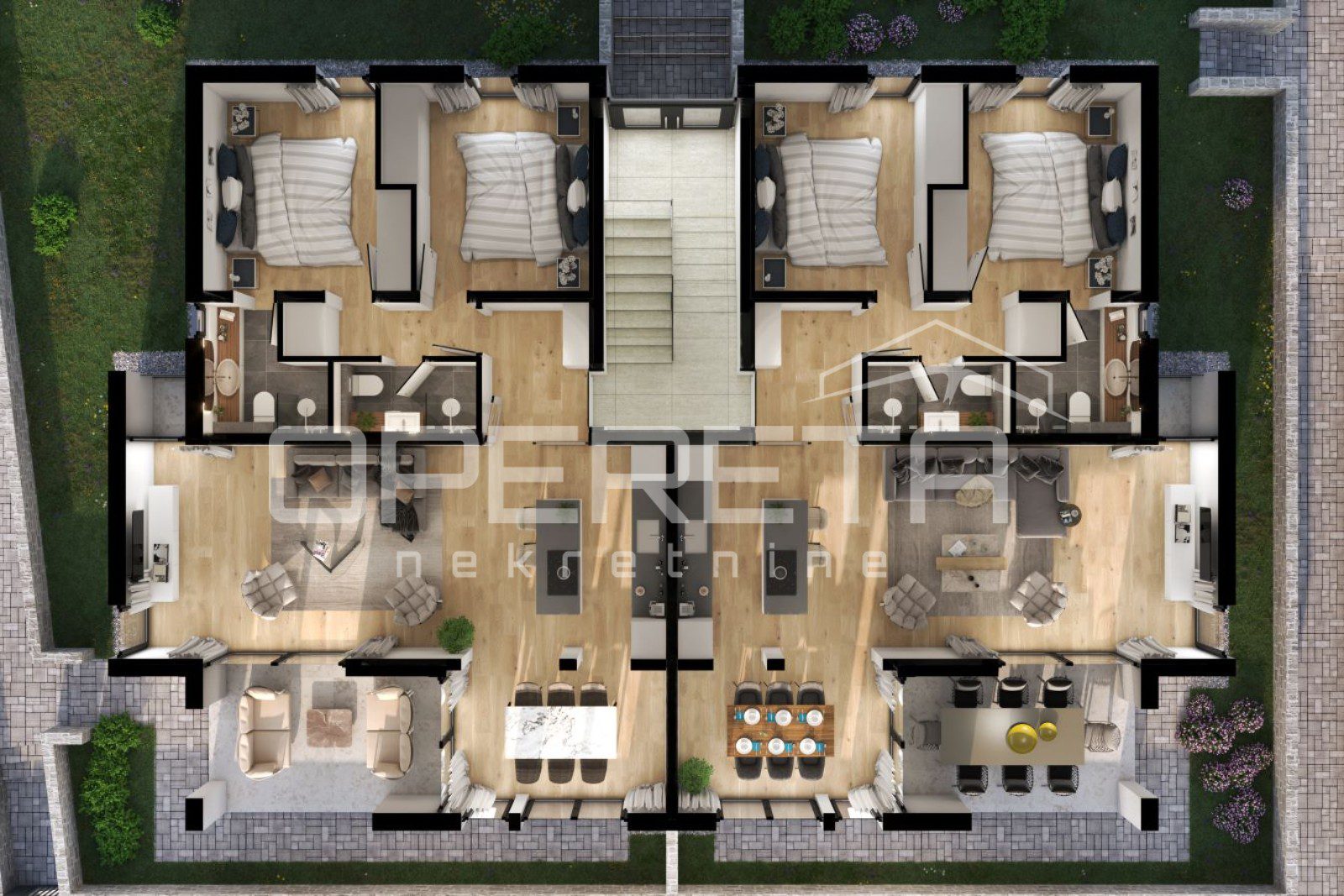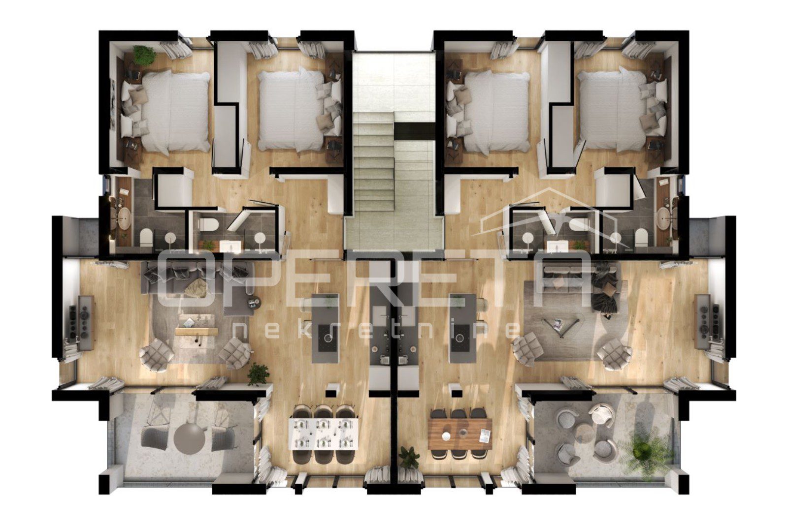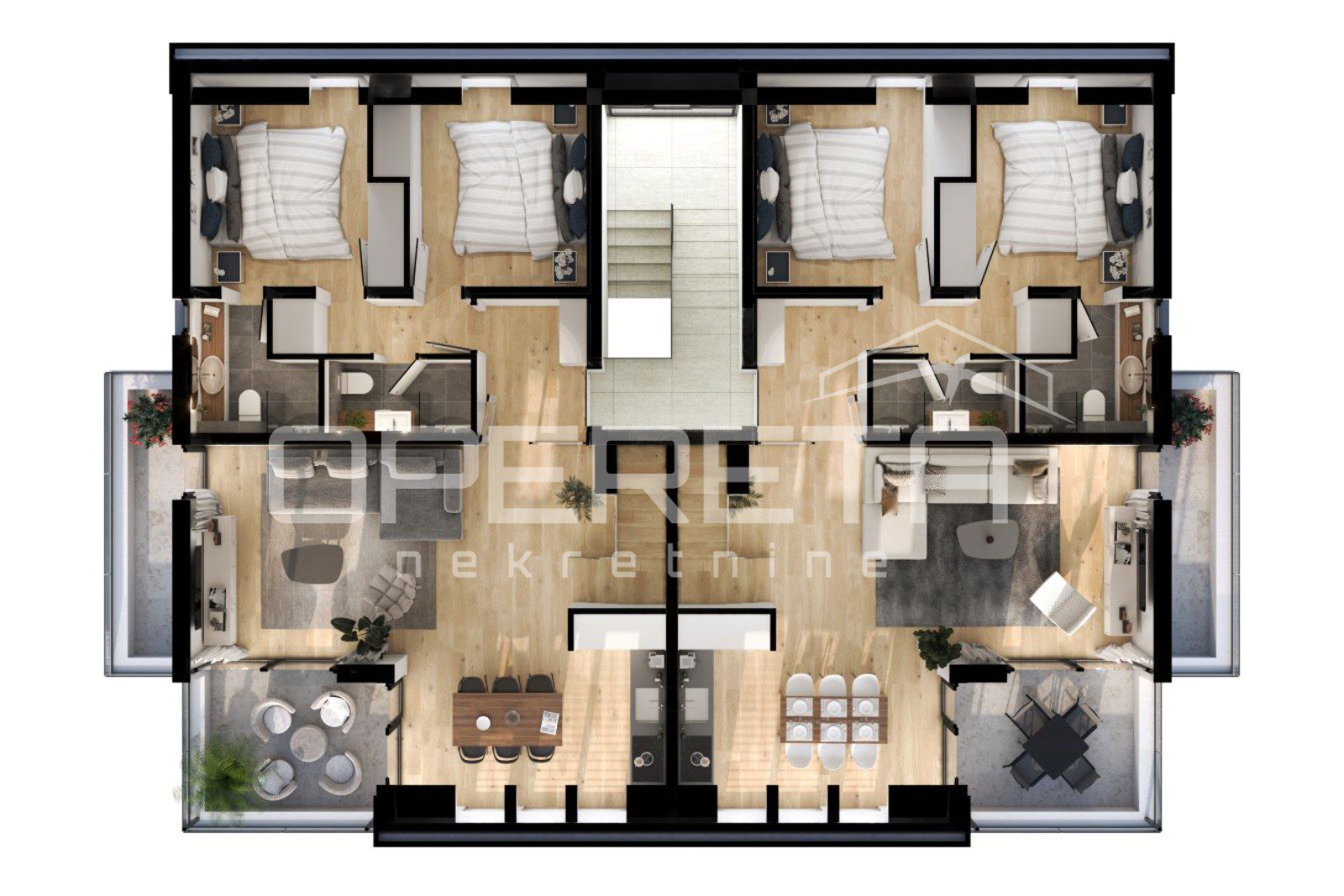 Residents have their own parking space, and the quality of construction is evident in every detail – from advanced thermal and acoustic insulation, aluminum joinery with modern sliding systems, underfloor heating, to aesthetically designed exterior. The outdoor area is enriched with Mediterranean plants, an automatic irrigation system, and subtle evening lighting.