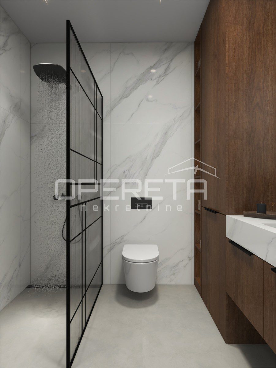 The bathrooms are modern and functionally equipped and include a walk-in shower, high-quality faucets, Laufen toilets, a sink with a base and drawer, an Ariston Velis Pro electric water heater (80 l), ventilation, a built-in cistern with a Grohe push button, a mirror with LED lighting, and a Rubineta shower system.