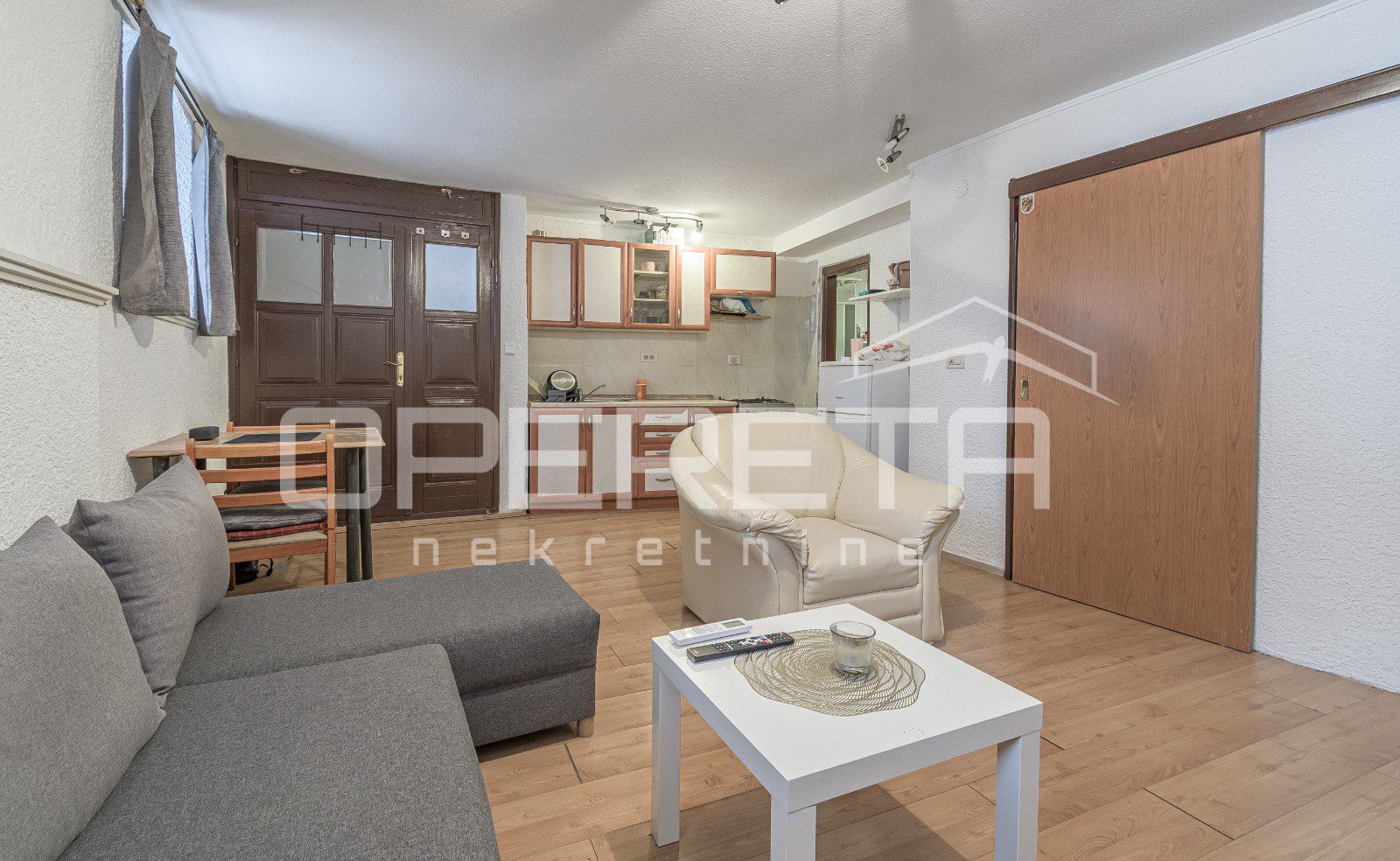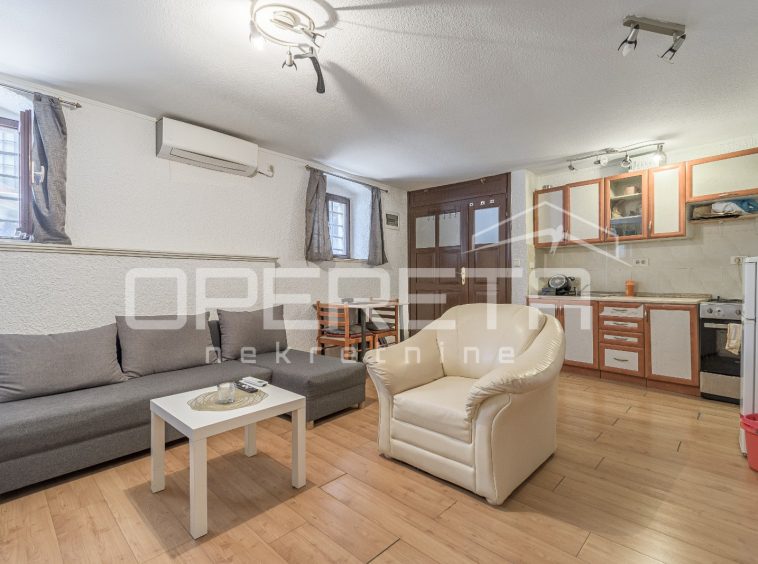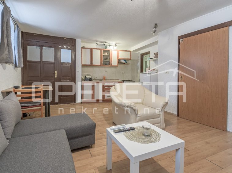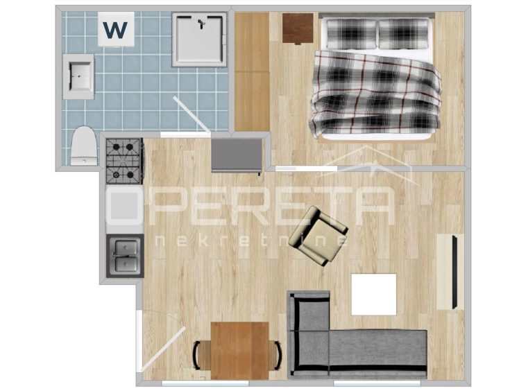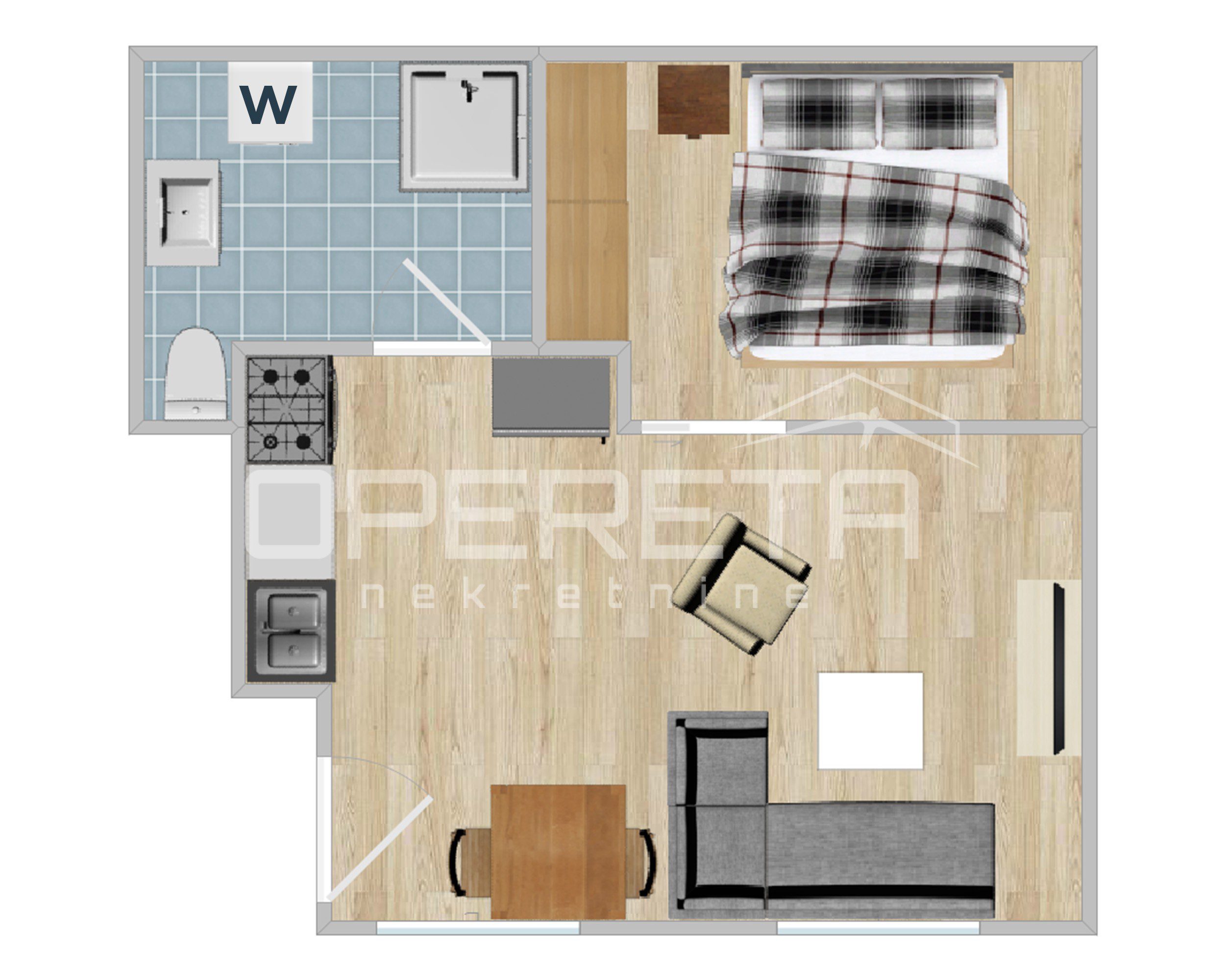 It consists of a living room with a kitchen and dining area, one bedroom, and a bathroom. The apartment is fully furnished and ready for immediate move-in.
