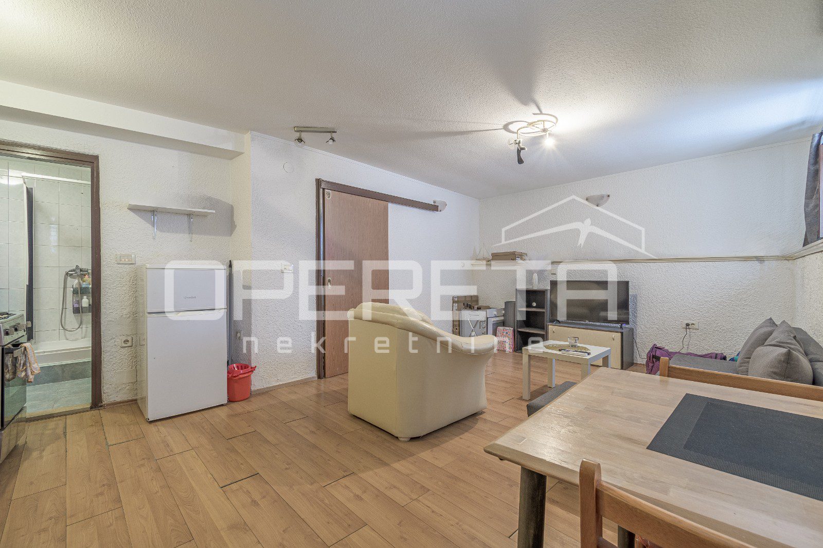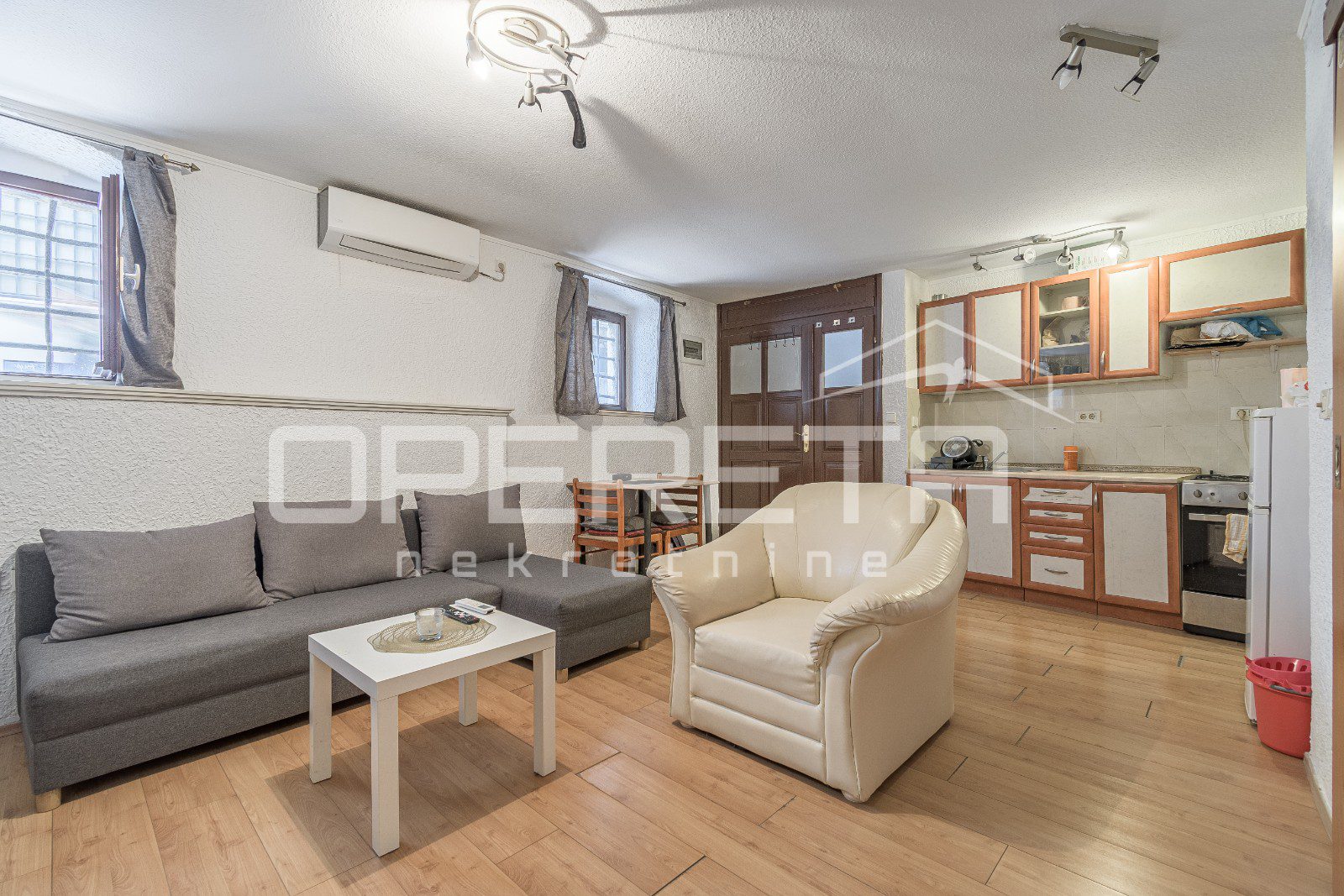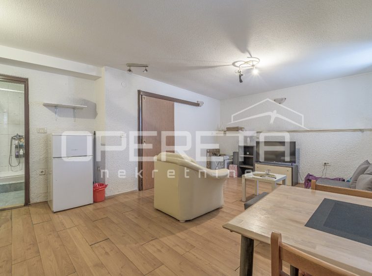 It consists of a living room with a kitchen and dining area, one bedroom, and a bathroom. The apartment is fully furnished and ready for immediate move-in.