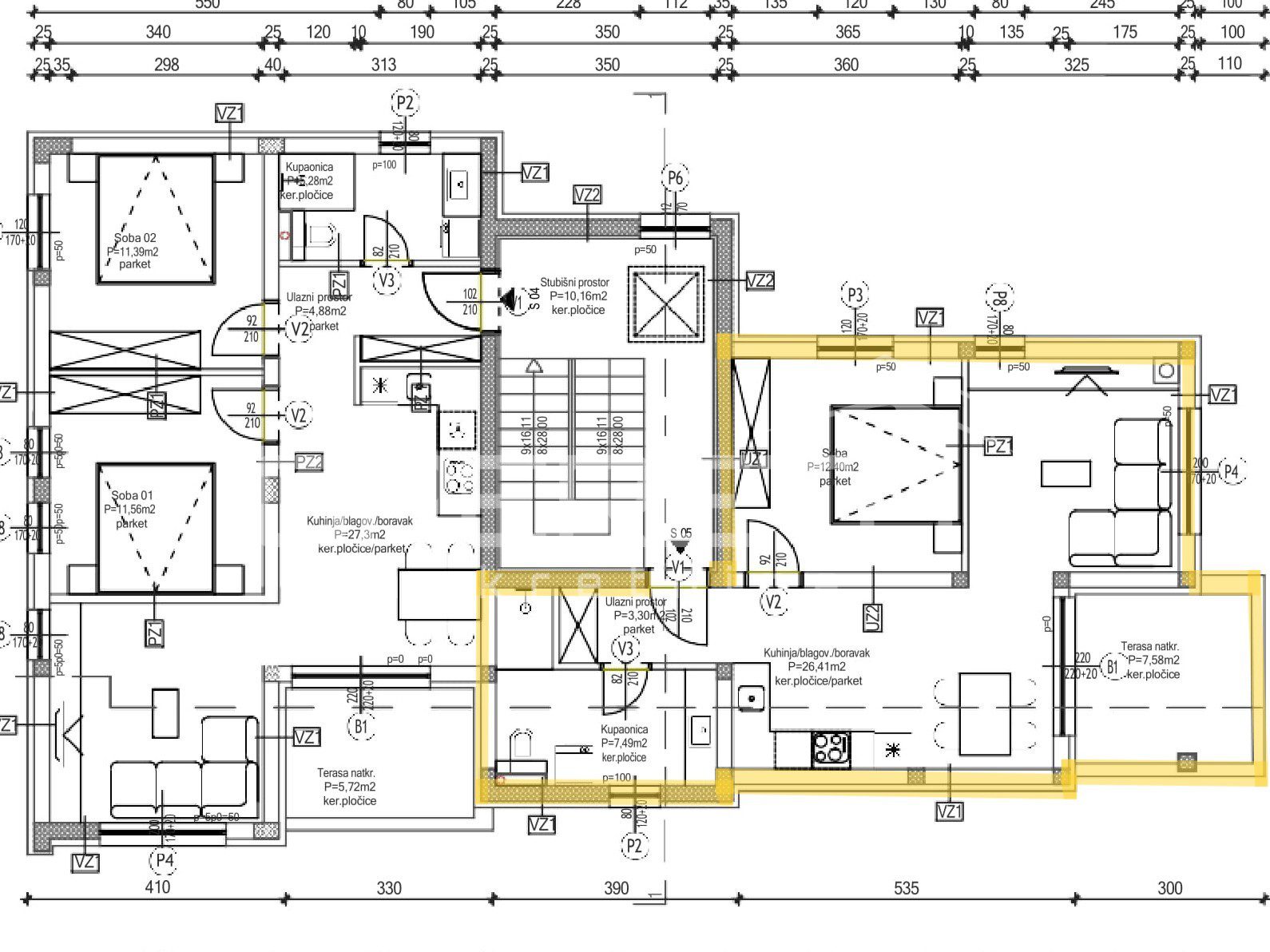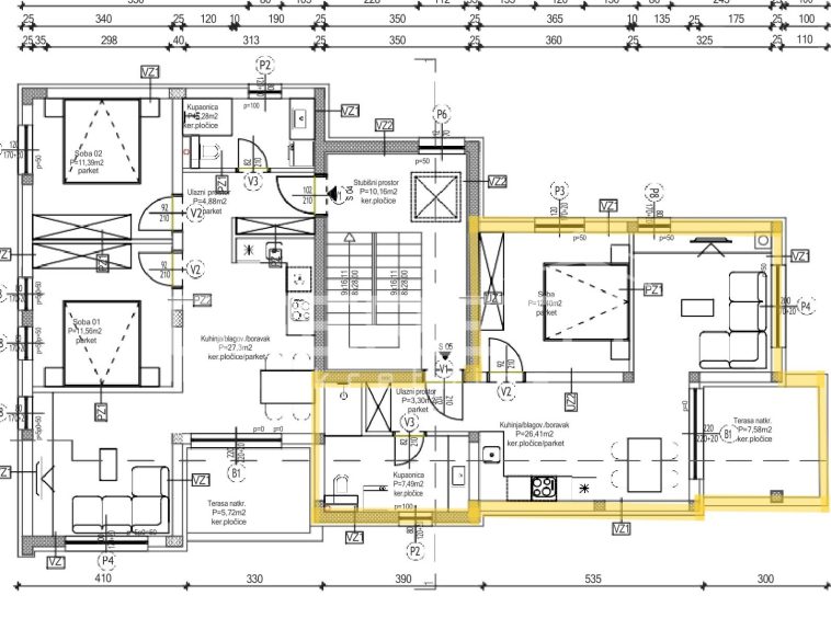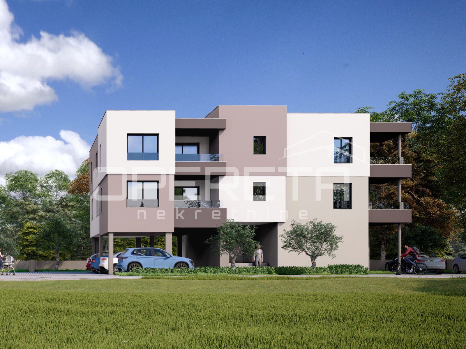 On a plot of 624 m², a modern residential building with a total of five apartments and 11 parking spaces is under construction. The building consists of a basement, ground floor and two floors, and each apartment has its own storage room in the basement.
