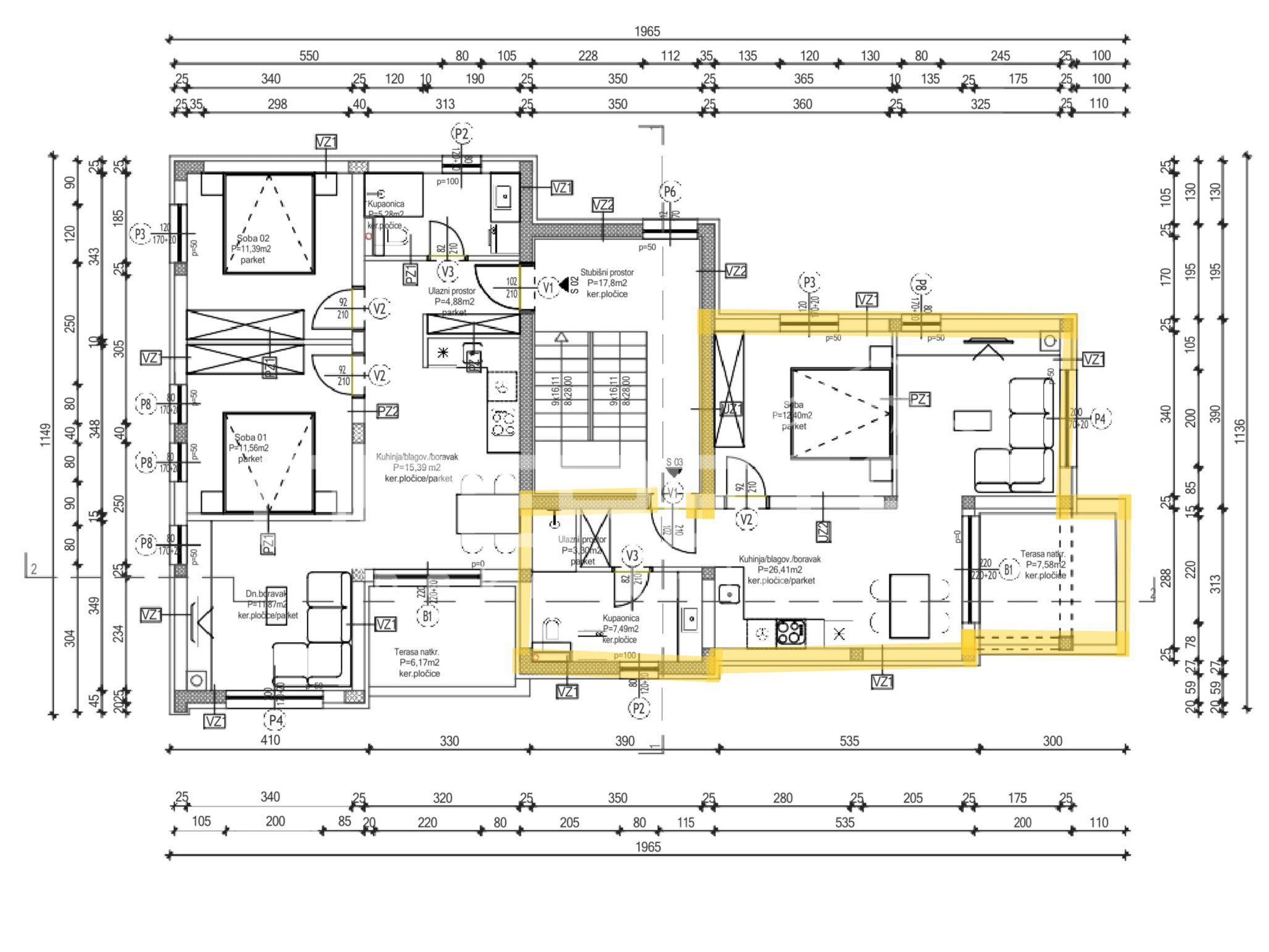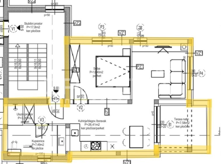 On the 1st floor of the building, there is an apartment S3, measuring 53.05 m², which includes an entrance hall, bathroom, bedroom, kitchen with dining room and living room with a covered terrace. The apartment comes with two parking spaces, one of which is covered, as well as an associated storage room in the basement.