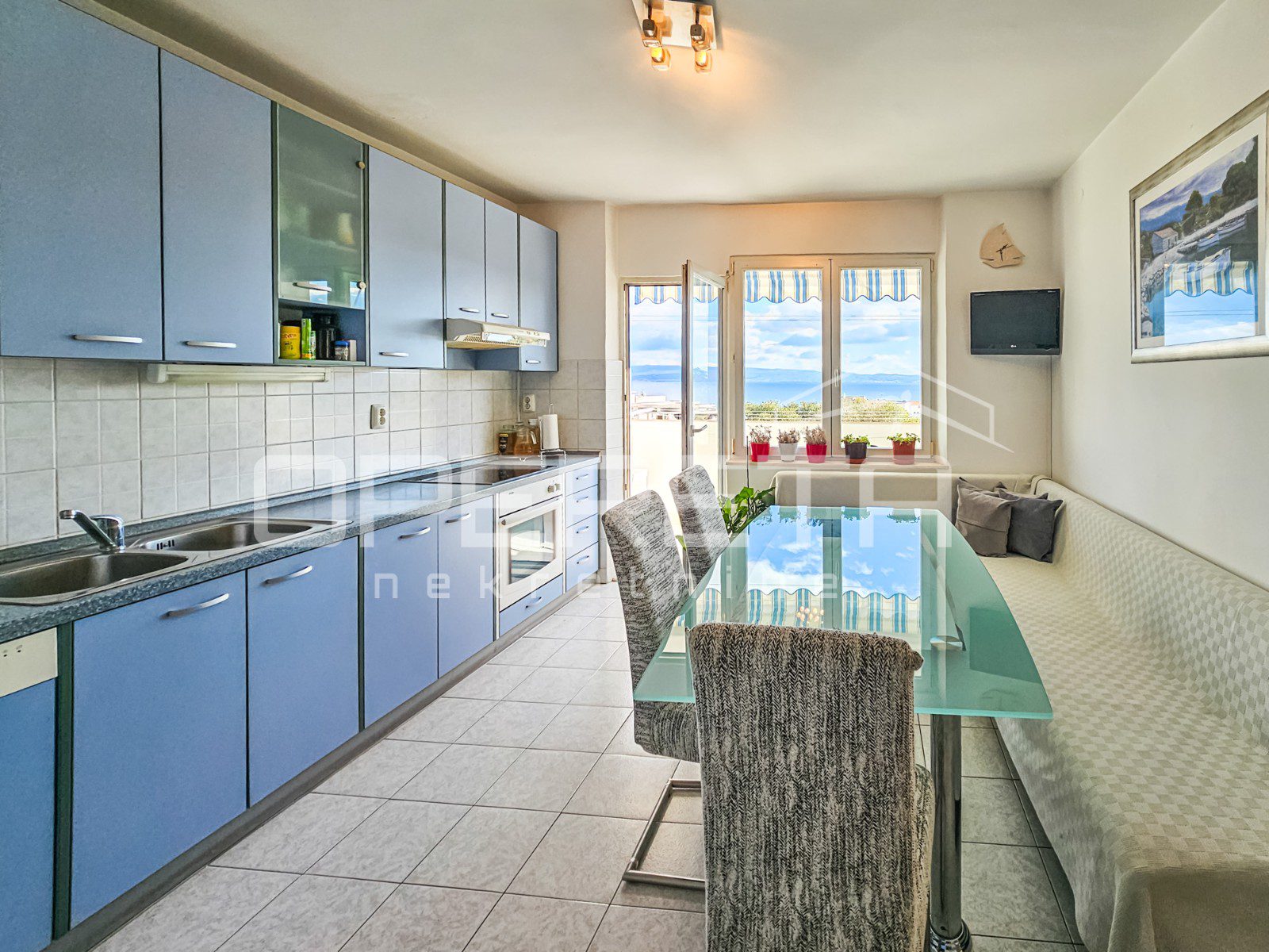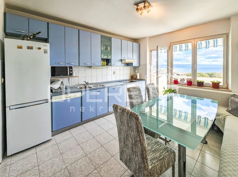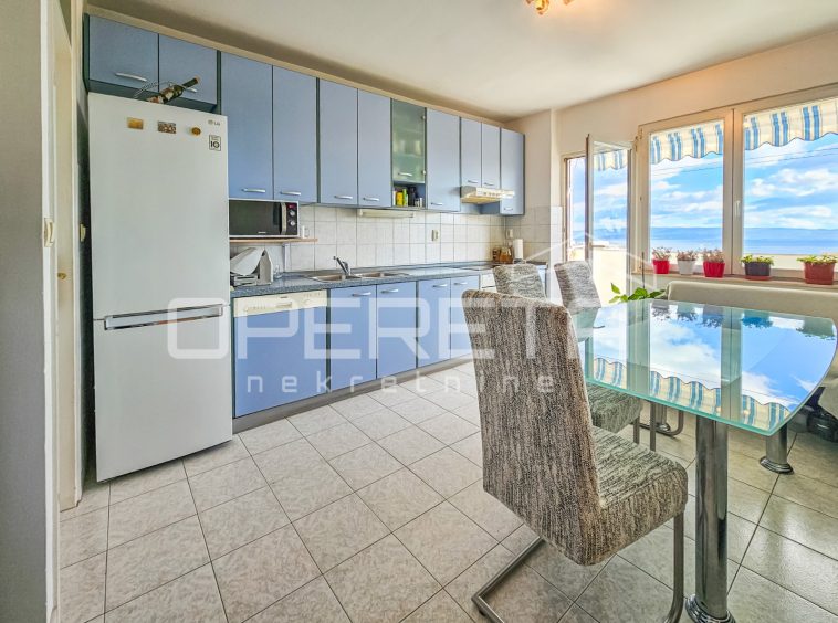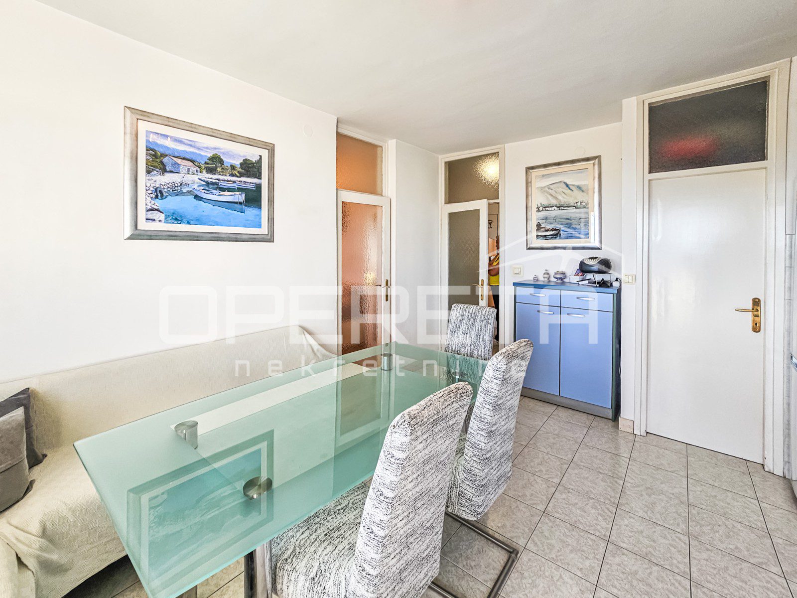 On the southern side, there is a large kitchen with dining area and a separate living room (tinel), both with access to a spacious loggia offering a stunning, unobstructed view of the sea and nearby islands. Next to the kitchen is a practical storage room, extremely useful for storing kitchen supplies and maintaining order.