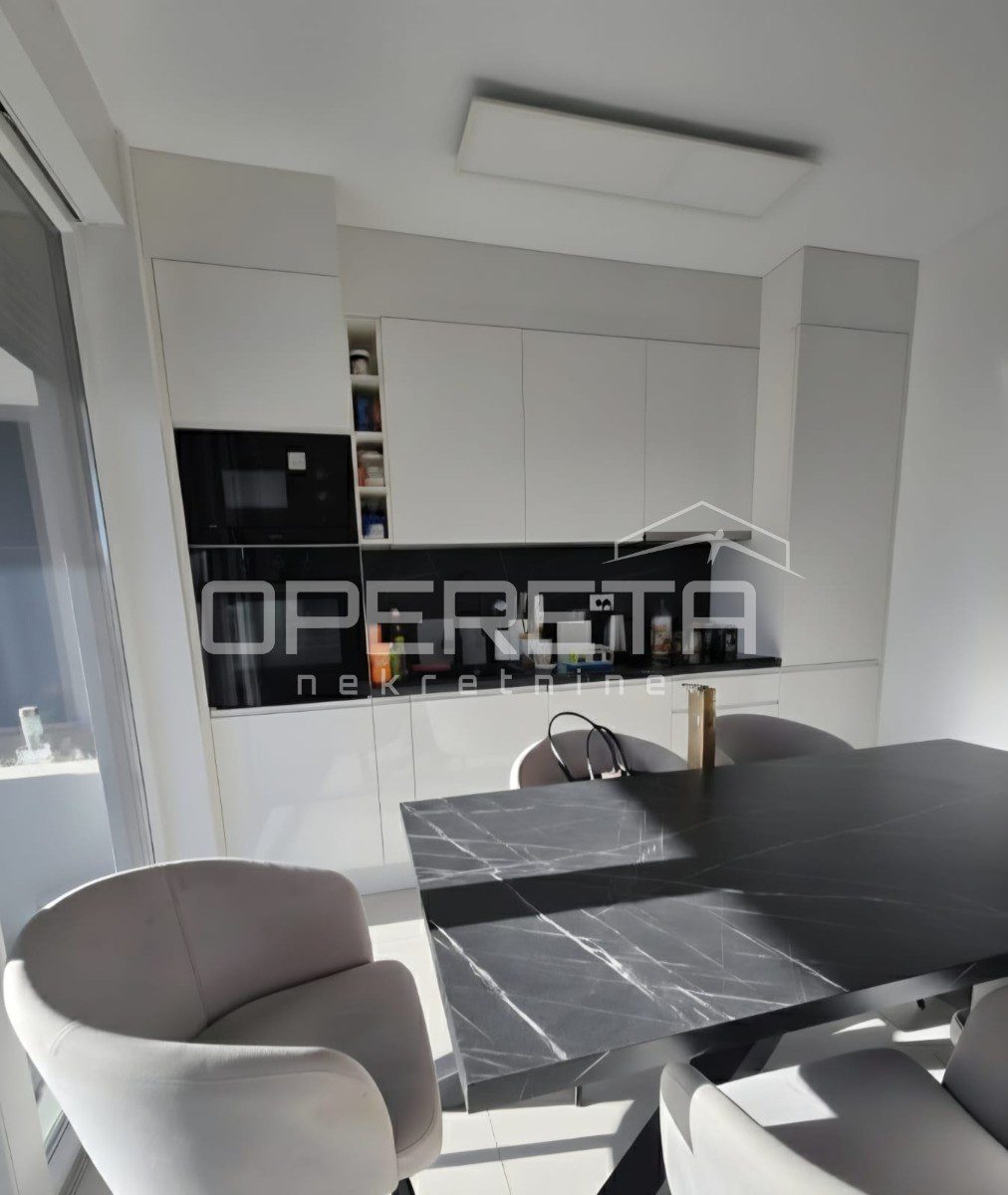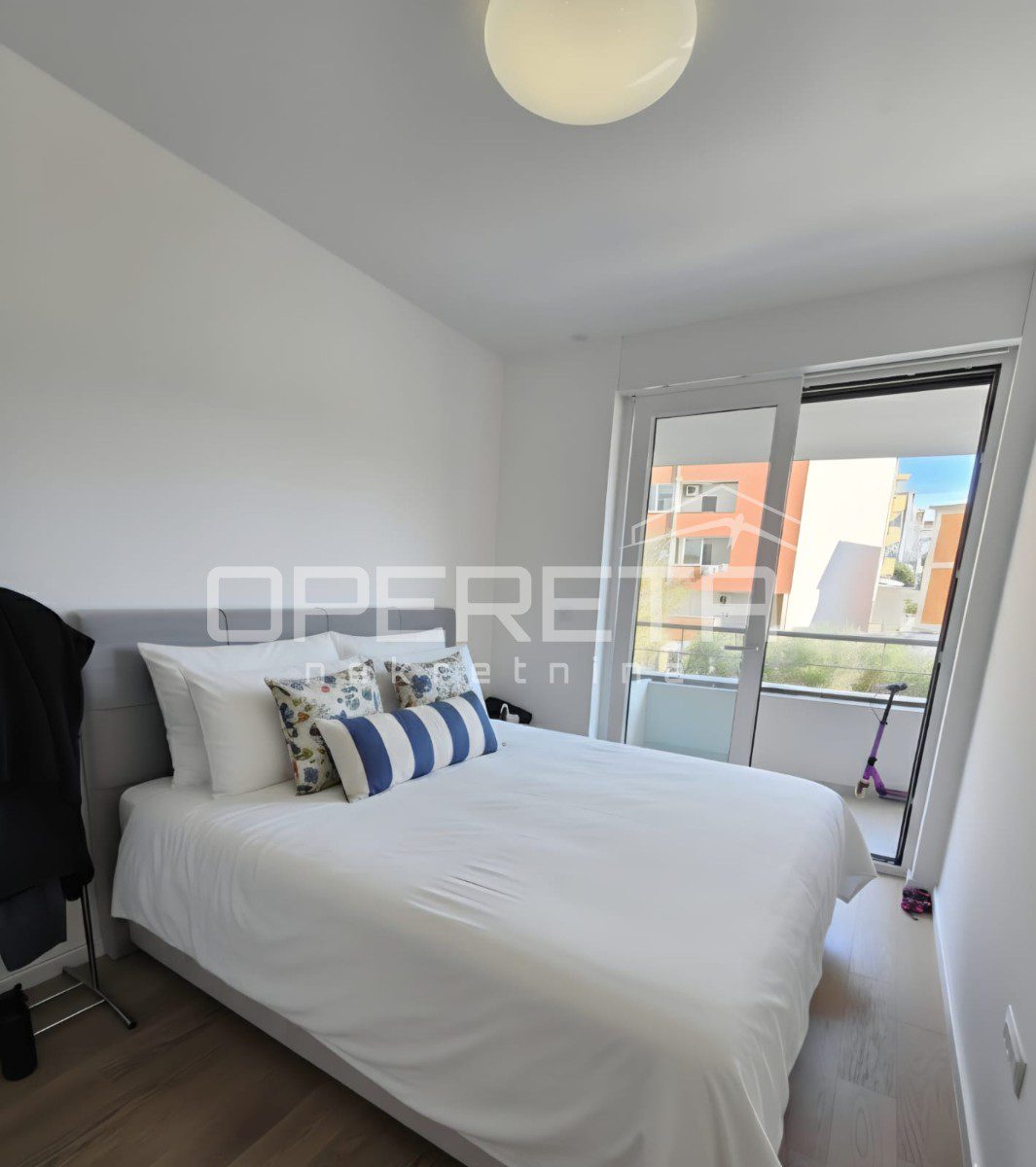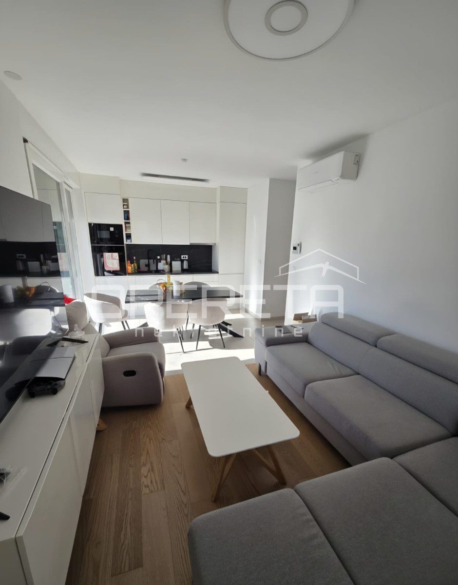 In the highly sought-after neighbourhood of Mejaši, in a newly constructed building, there is a functional apartment on the 1st floor, facing southeast. The apartment consists of an internal living area of 52.25 m², a balcony of 26.44 m², an additional green surface of 3.73 m², and a garage parking space of 14 m².