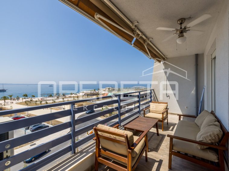 The property is situated on the fifth floor of a residential building with an elevator and comprises approximately 55 m² of living space, complemented by an 11 m² loggia. The apartment consists of a spacious living room connected to a modern, fully equipped kitchen and dining area, one bedroom with an en-suite bathroom, an additional bathroom, hallway, entrance area, and storage room. Both the living room and bedroom provide access to the loggia, furnished with outdoor seating and offering a beautiful view of the sea and surrounding islands—ideal for relaxation and enjoying the Mediterranean atmosphere.
