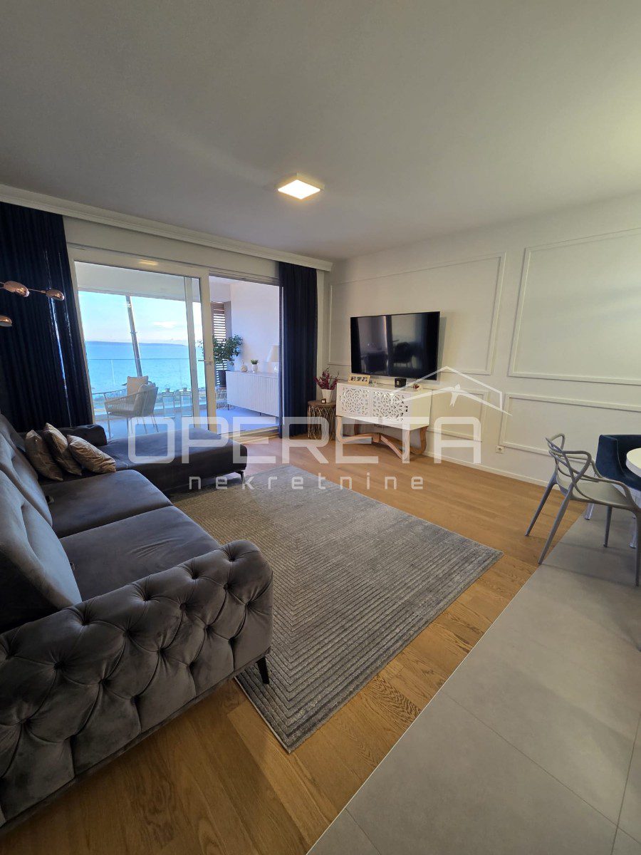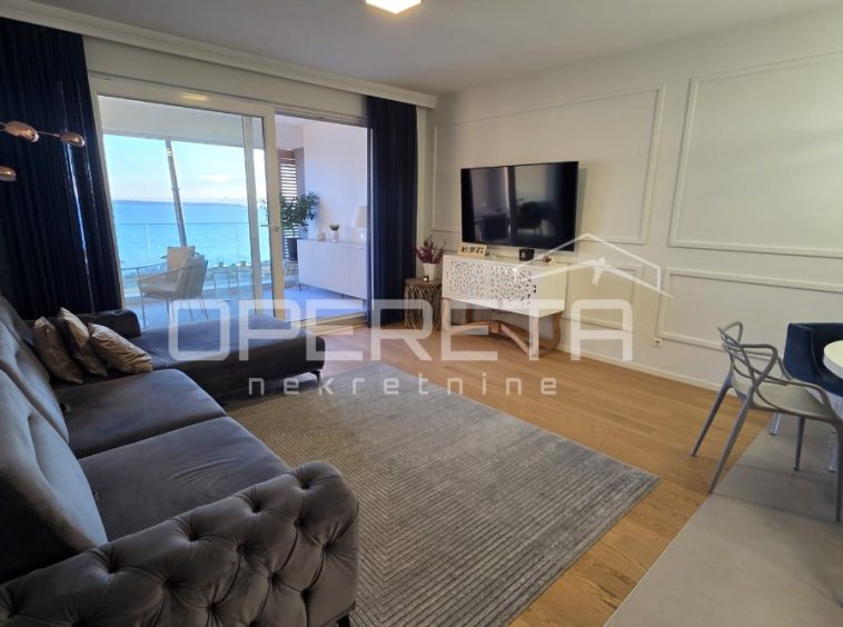 In the prestigious area of Žnjan, within an elegant seaside villa, a top-class three-bedroom apartment is situated, offering an exceptional standard of living with a permanent sea view. The apartment is located on the fourth floor of a building with a total of five floors and, thanks to its position and orientation, provides abundant natural light, privacy, and a sense of complete comfort.
