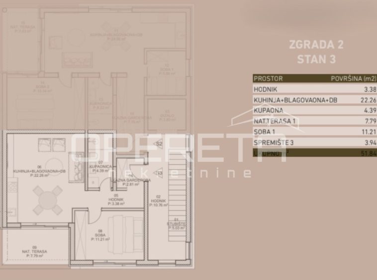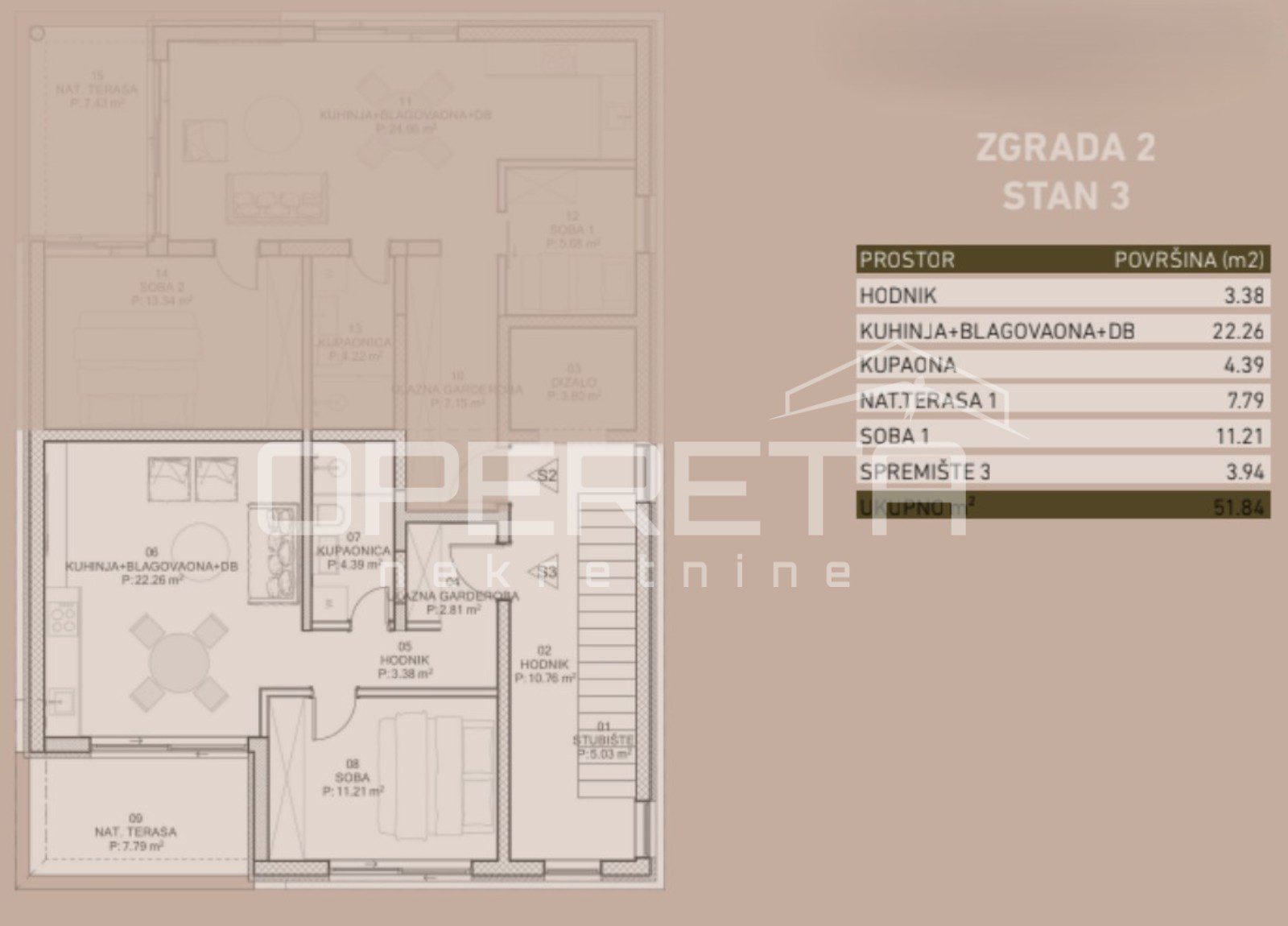 The first-floor apartment has a living area of 51.8 m² and consists of an entrance hall, one bedroom, a modern bathroom, while the central part features a spacious living room with a kitchen and dining area, which opens onto a covered terrace. The apartment includes a storage room on the ground floor and two parking spaces in front of the building.