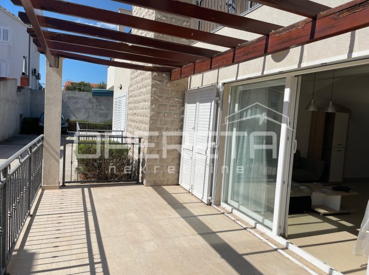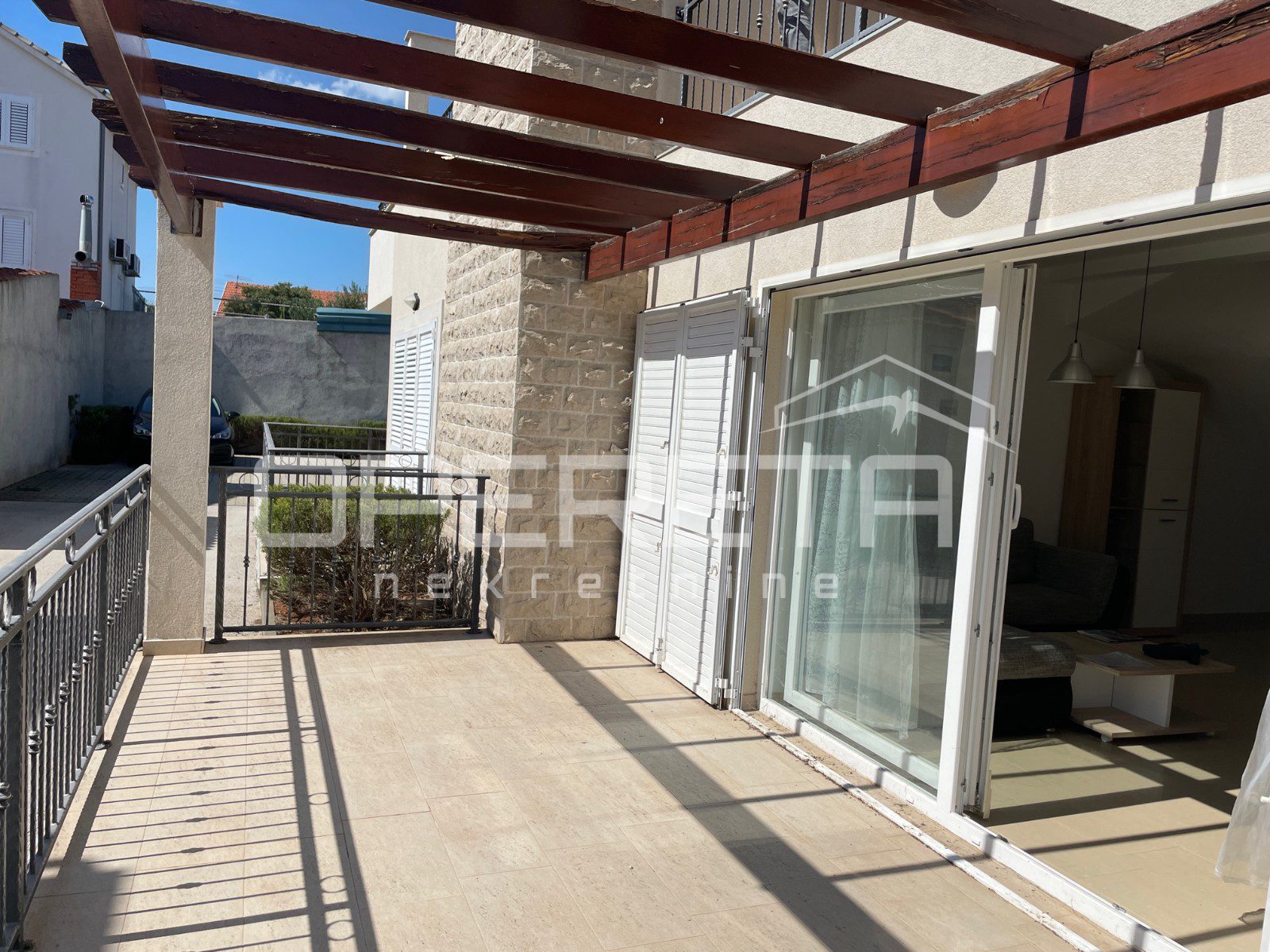 An apartment for sale in Tribunj, close to the town center and all necessary amenities. The apartment is located on the ground floor and on the first floor. The ground floor consists of an entrance, hallway, staircase, study, toilet, storage room, living room, dining room, kitchen and terrace. On the first floor there are 2 bedrooms, bathroom, loggia and storage room. The total living area of the apartment is 85.87 m2. The residential unit has a garden of 8.16 m2 and a parking space of 39.14 m2.
