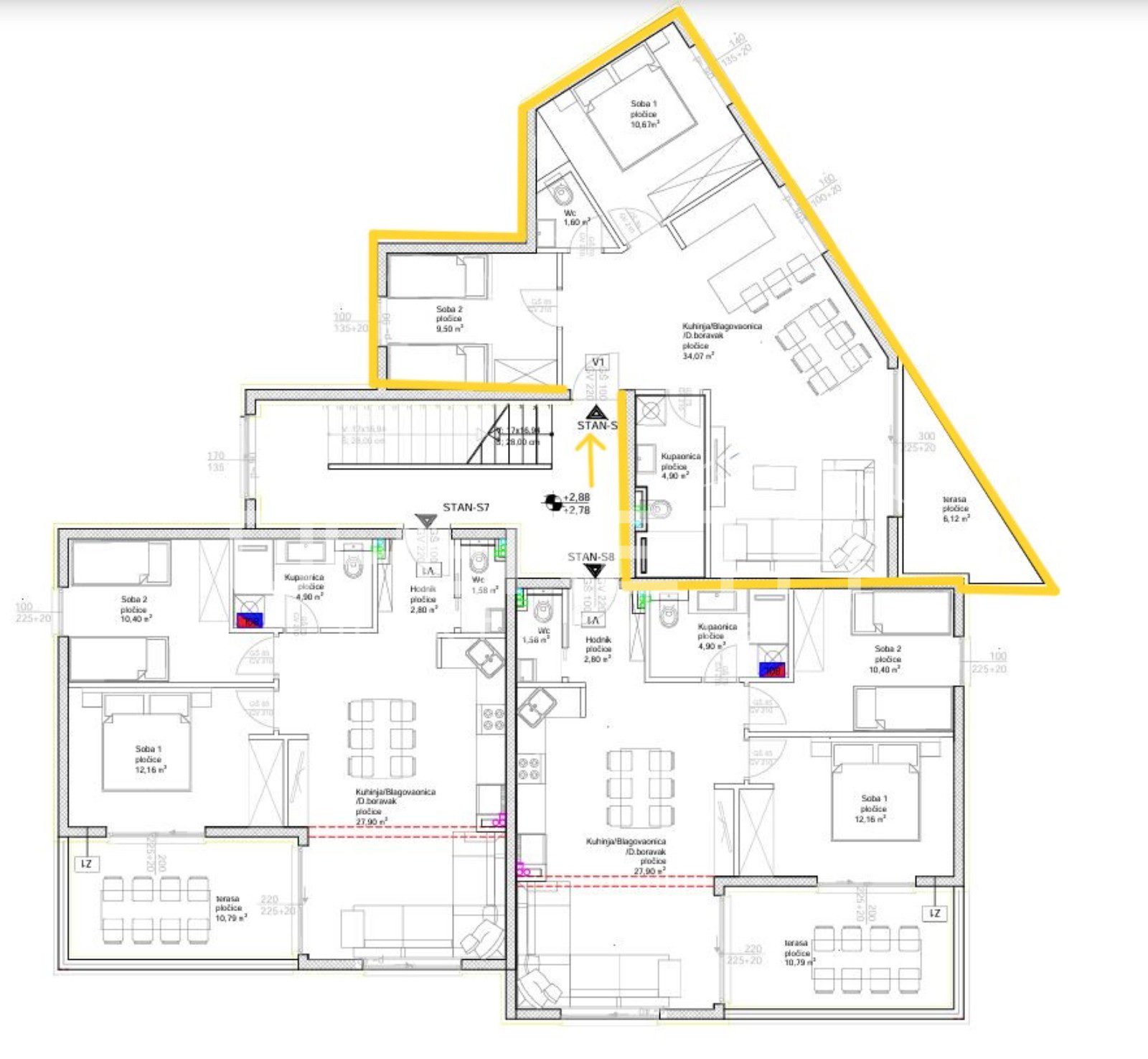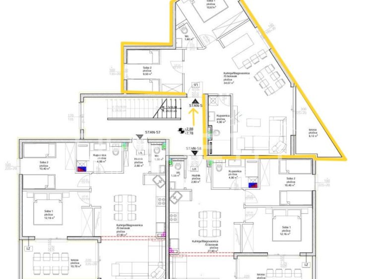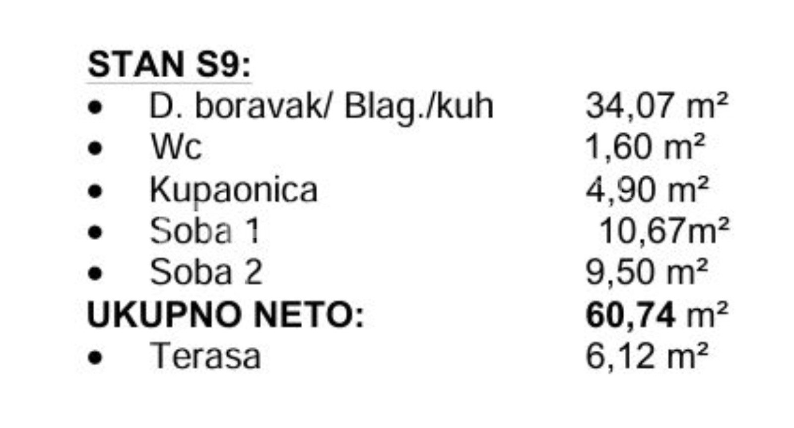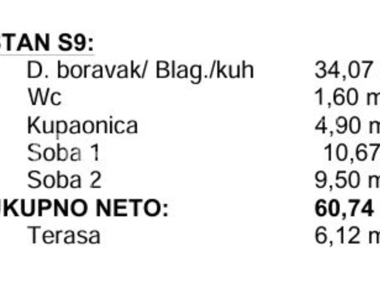 Apartment S9 is located on the 1st floor and covers 60.74 m² of carefully designed living space, consisting of an guest toilet, bathroom, spacious living room connected with the kitchen, two bedrooms, and a 6,12 m² terrace (coefficient 0.50 = 3,06 m²) perfect for unwinding.
