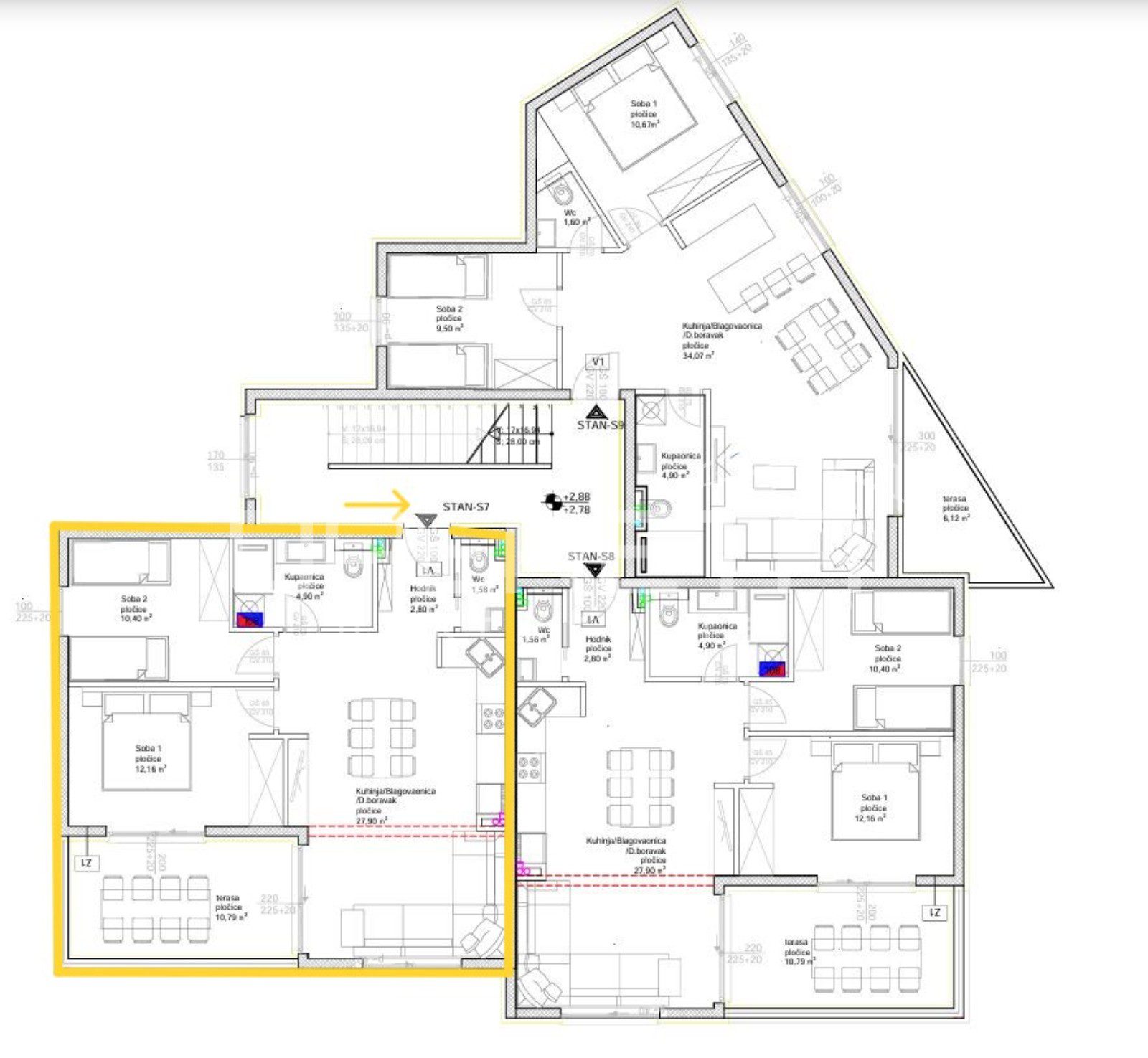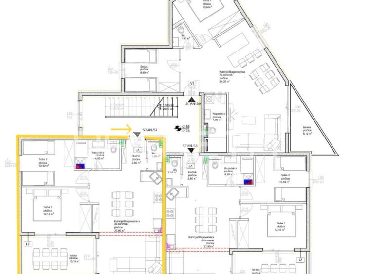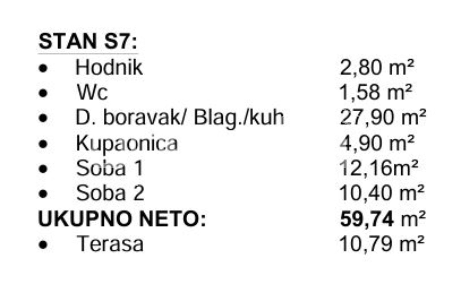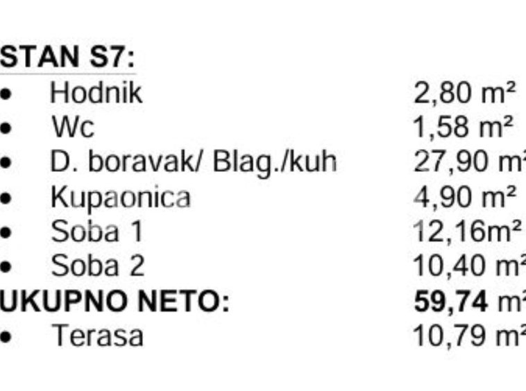 Apartment S7 is located on the 1st floor and covers 59.74 m² of carefully designed living space, consisting of an entrance hall, guest toilet, bathroom, spacious living room connected with the kitchen, two bedrooms, and a 10.79 m² terrace (coefficient 0.50 = 5.39 m²) perfect for unwinding.