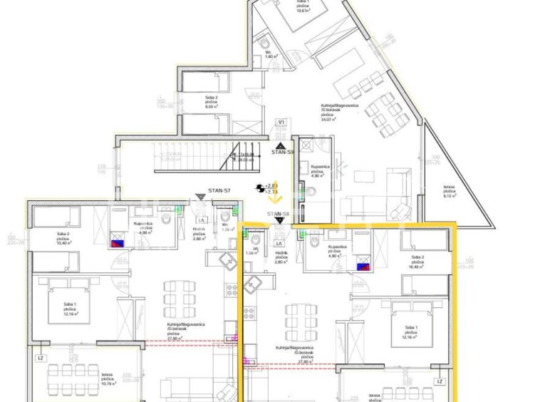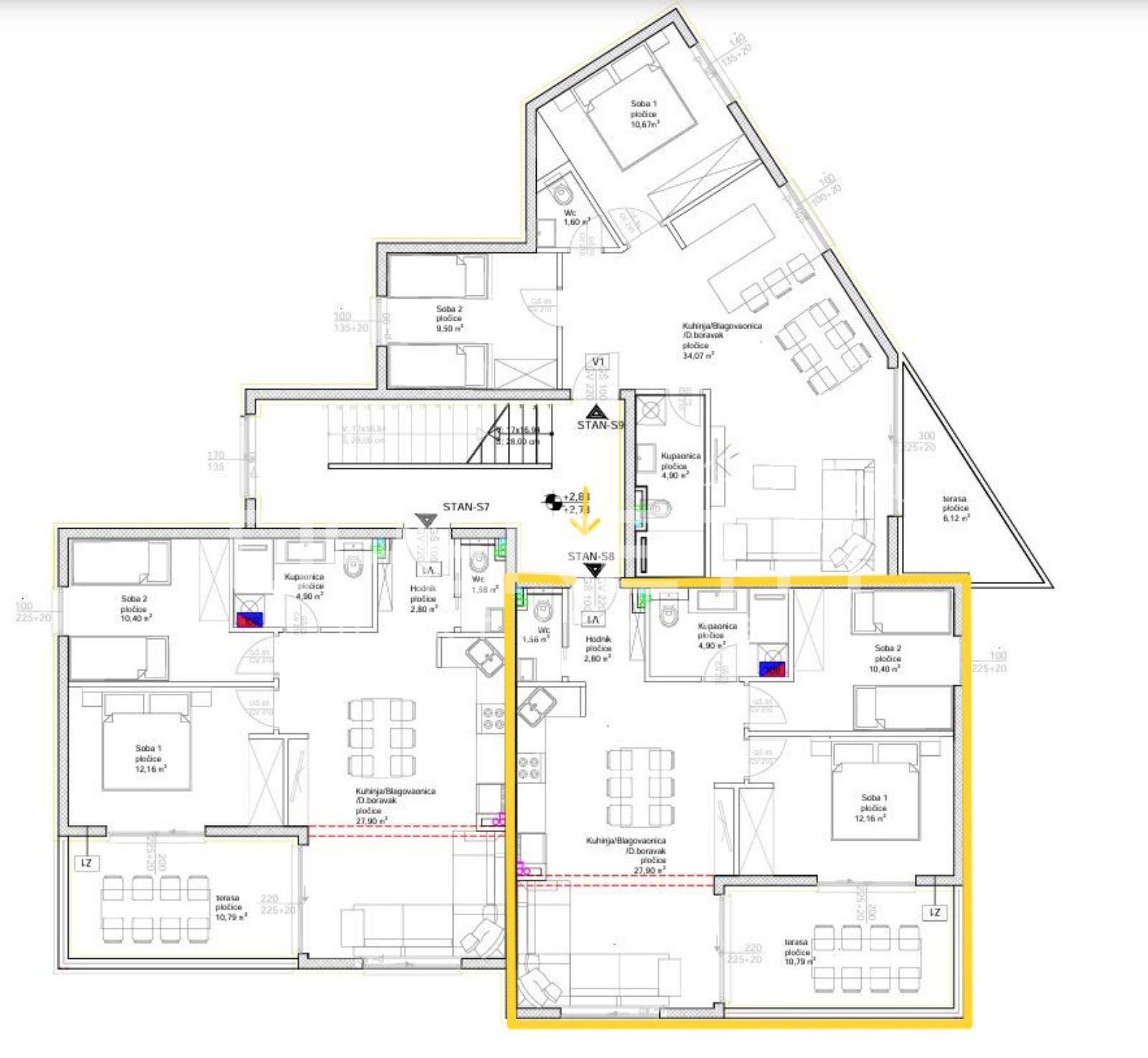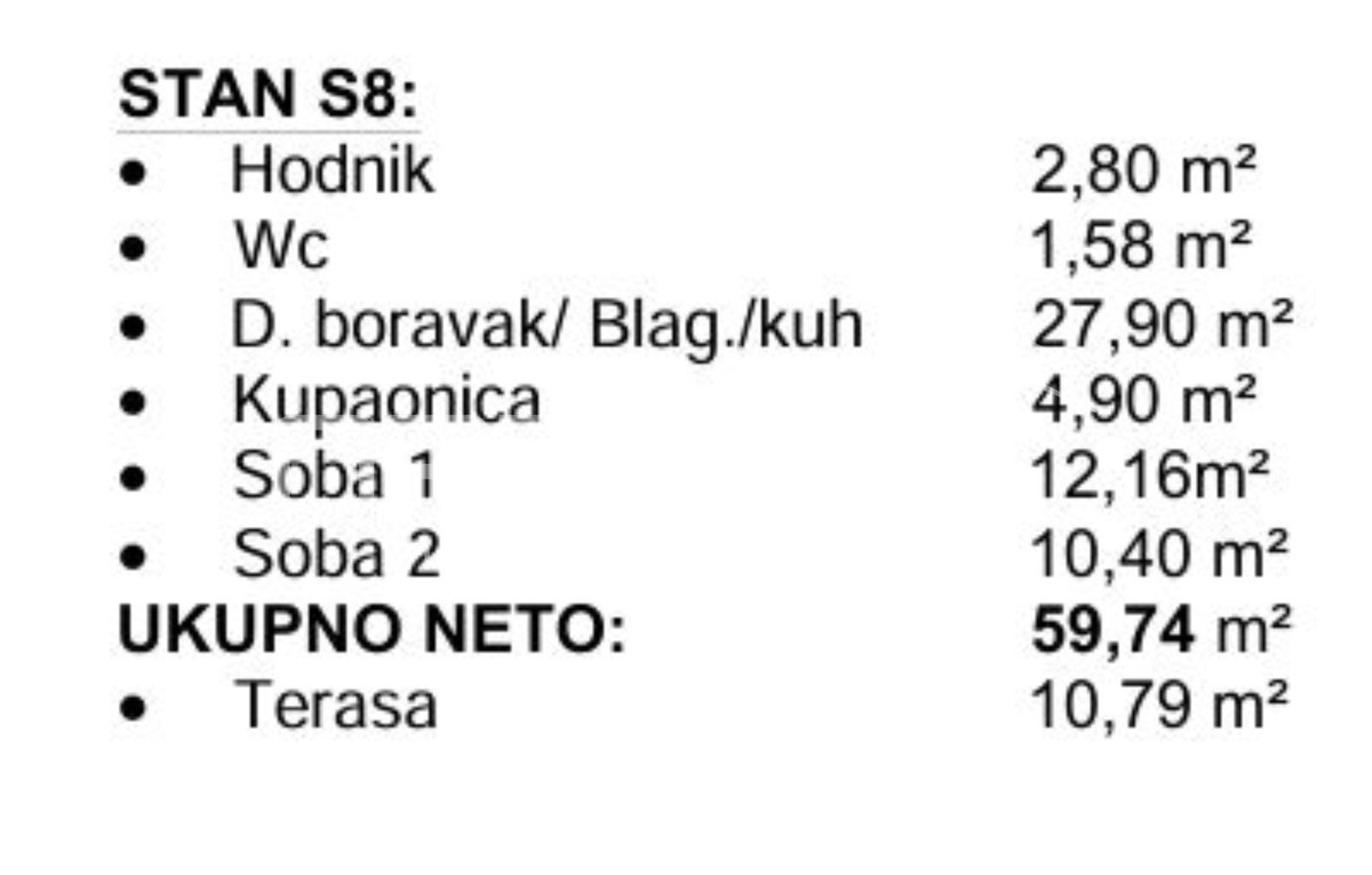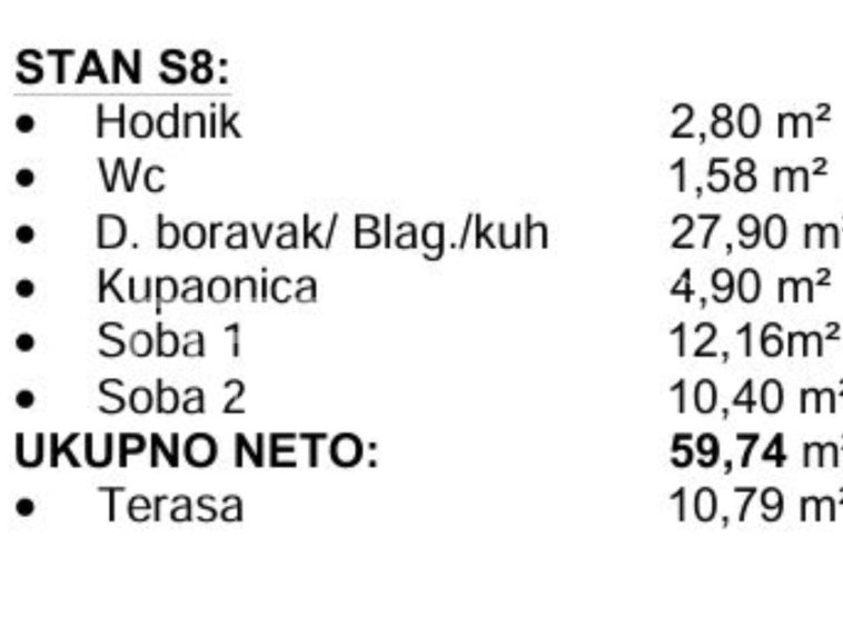 Apartment S8 is located on the 1st floor and covers 59.74 m² of carefully designed living space, consisting of an entrance hall, guest toilet, bathroom, spacious living room connected with the kitchen, two bedrooms, and a 10.79 m² terrace (coefficient 0.50 = 5.39 m²) perfect for unwinding.