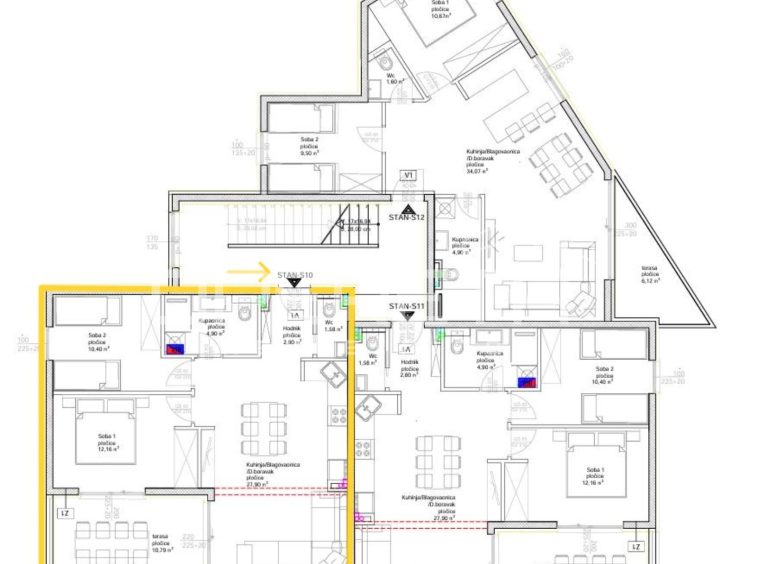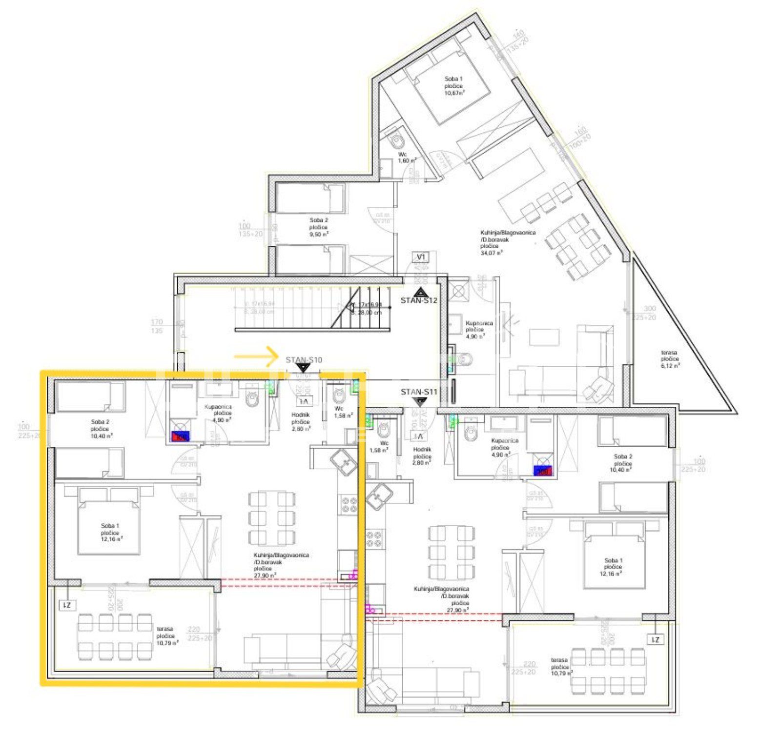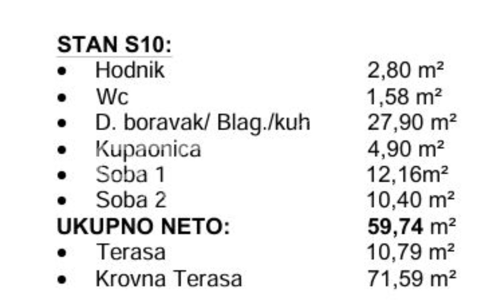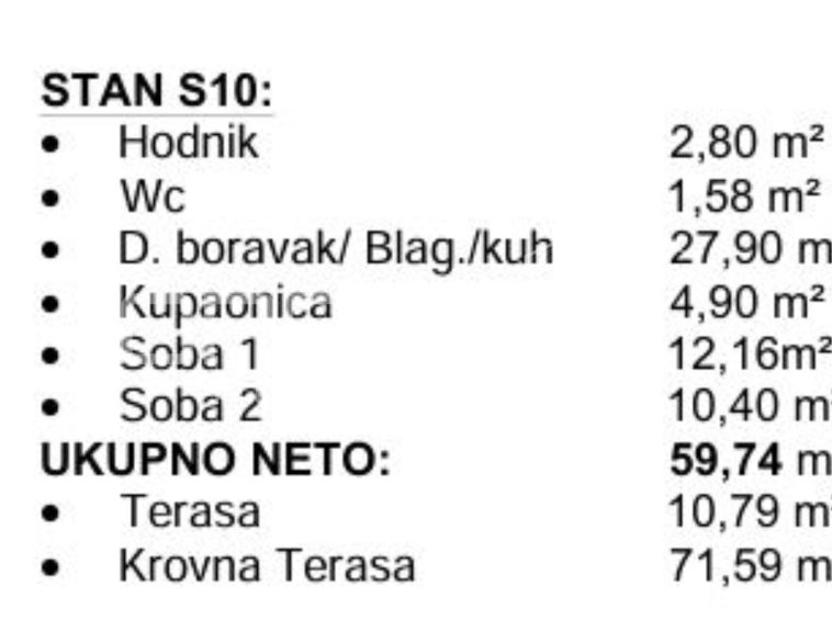 Apartment S10 is located on the 2nd floor and covers 59.74 m² of carefully designed living space, consisting of an entrance hall, guest toilet, bathroom, spacious living room connected with the kitchen, two bedrooms, and a 10.79 m² terrace (coefficient 0.50 = 5.39 m²), rooftop terasse 71,59m2 (coef. 0,25=17,90m2) perfect for unwinding.