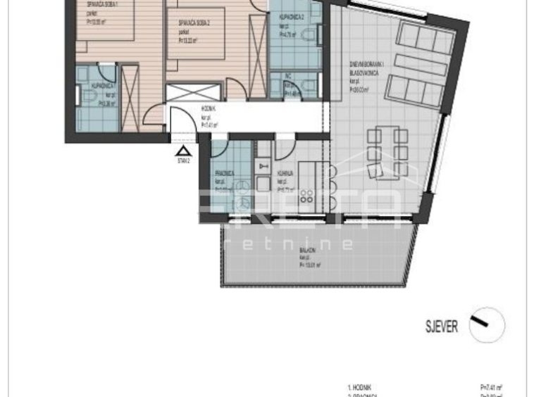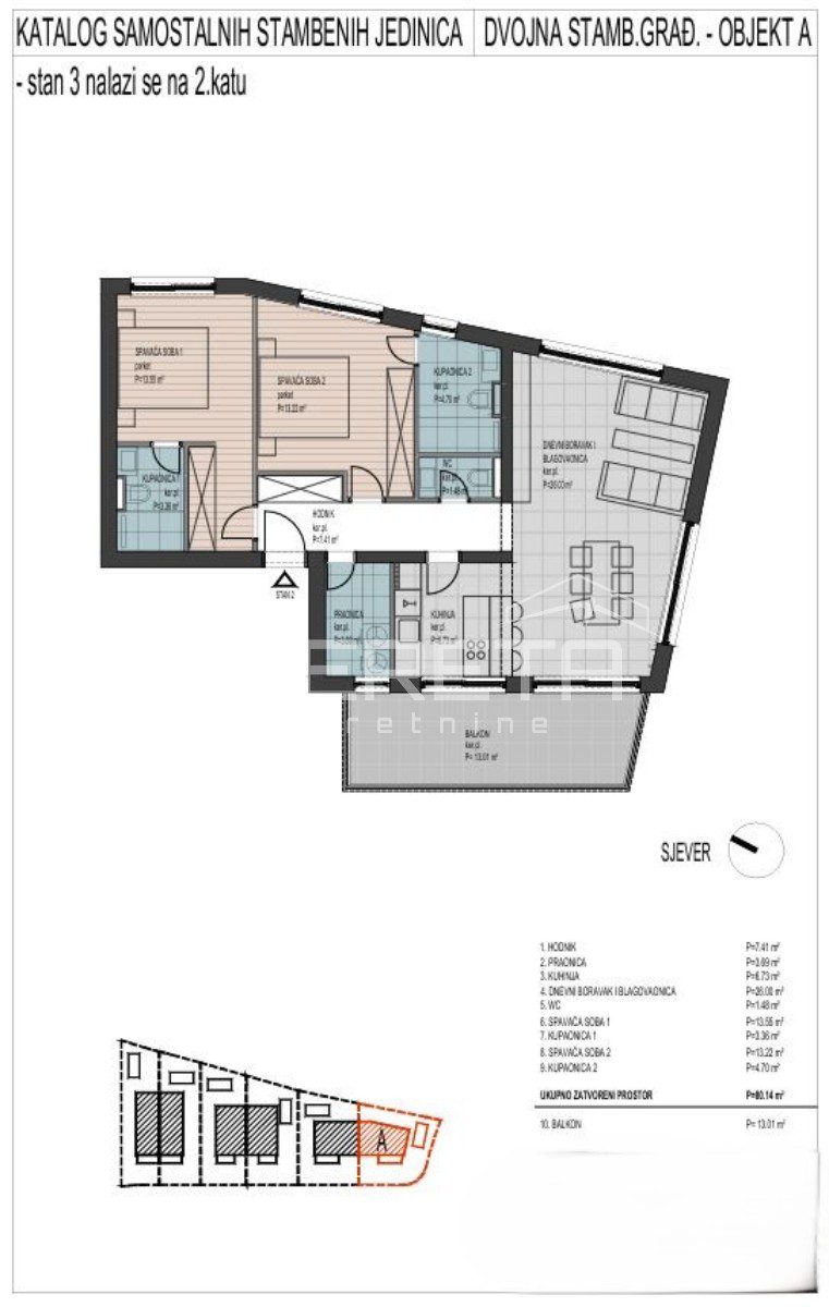 Apartment S3A, located on the 2nd floor, offers 80.14 m² of living space with a carefully planned layout: hallway, laundry room, WC, two bathrooms, spacious living and dining area, kitchen, two bedrooms, and a balcony of 13.01 m² (coefficient 0.50).