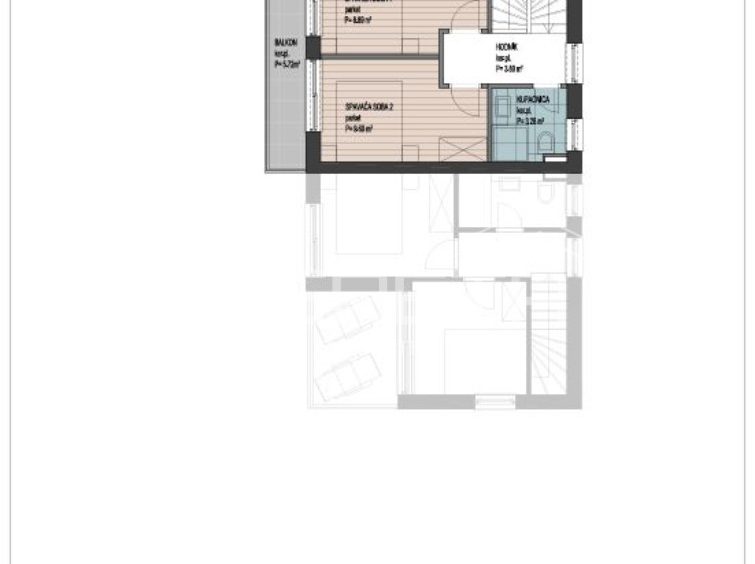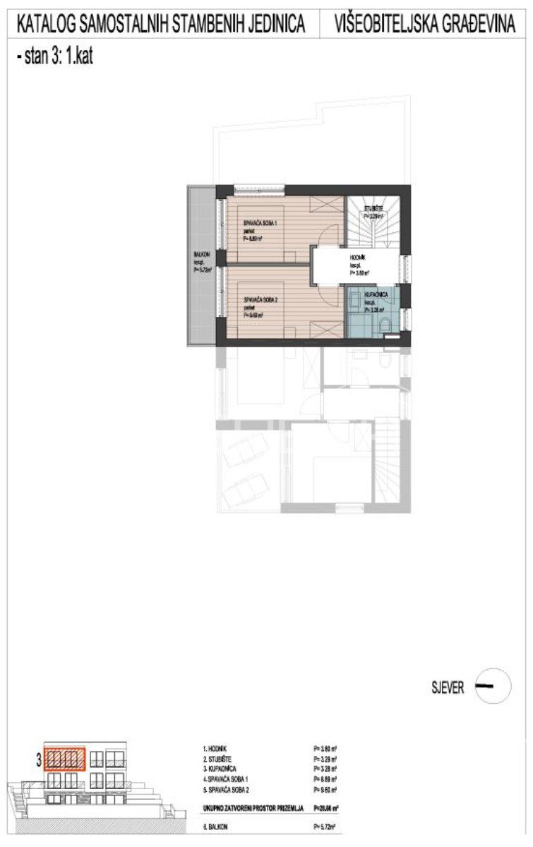 Apartment S3 is located on the second and third floors of a building with only 3 residential units. It extends over two levels, offering a total living area of 58.31 m² of enclosed space, plus 2 balconies of 5.72 m² each and a terrace of 15.12 m², with a carefully planned layout:
