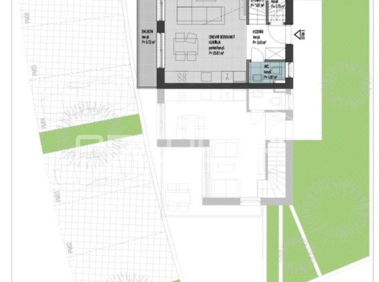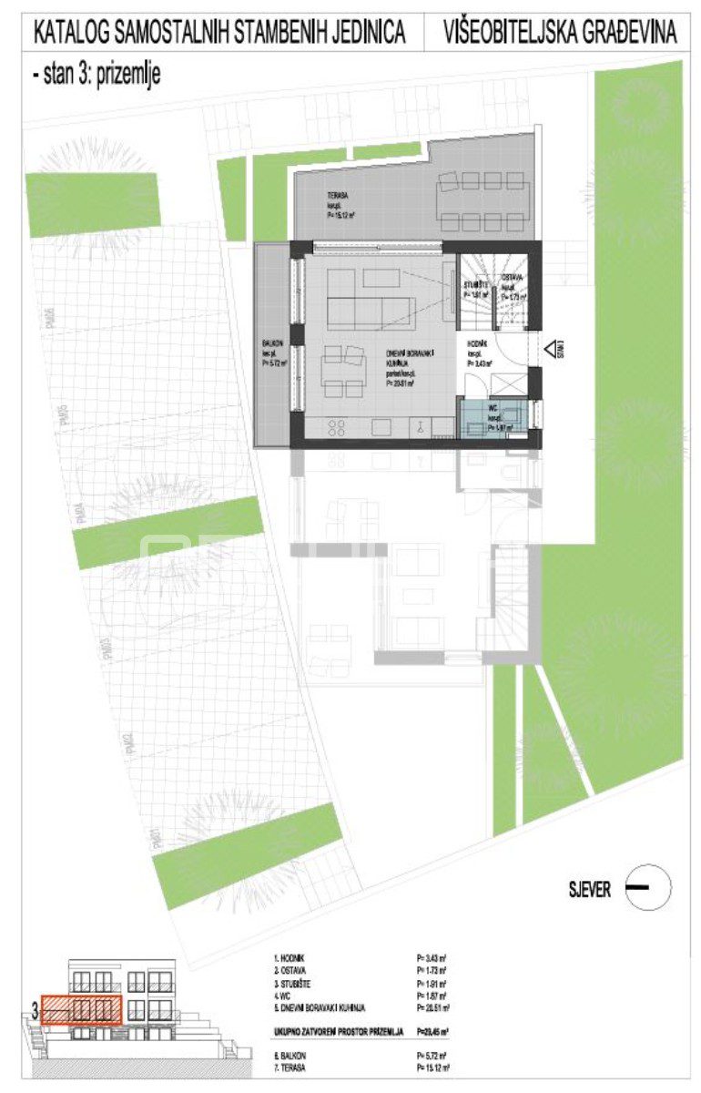 1st Floor: Hallway, storage, WC, spacious living room and dining area, kitchen, staircase, balcony (5.72 m², coeff. 0.50) and terrace (15.12 m², coeff. 0.50).