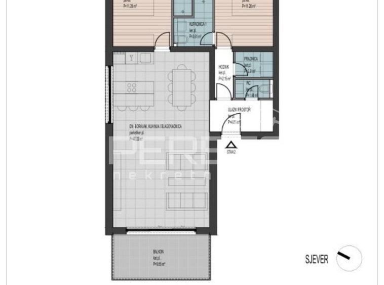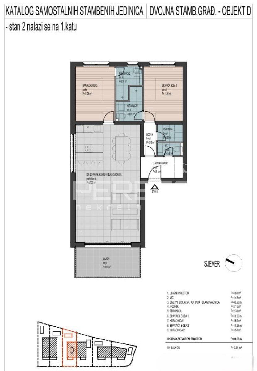 Apartment S2D, located on the 1st floor, offers 80,62 m² of living space with a carefully planned layout: hallway, laundry room, WC, two bathrooms, spacious living and dining area, kitchen, two bedrooms, and a balcony of 9,66 m² (coefficient 0.50).
