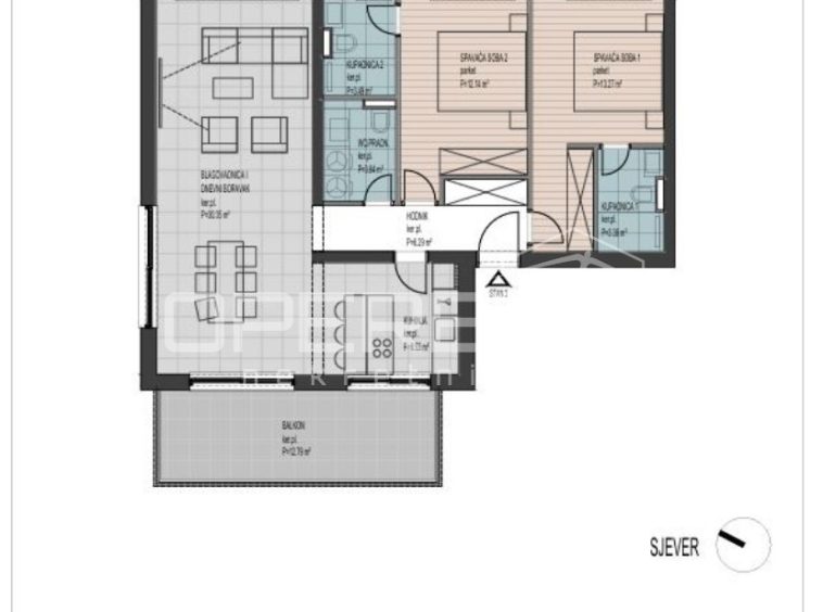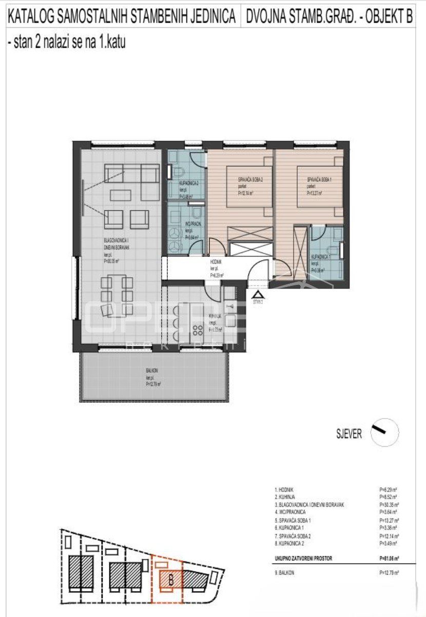 Apartment S2B, located on the 1st floor, offers 81,06 m² of living space with a carefully planned layout: hallway, laundry room, WC, two bathrooms, spacious living and dining area, kitchen, two bedrooms, and a balcony of 12,79 m² (coefficient 0.50).