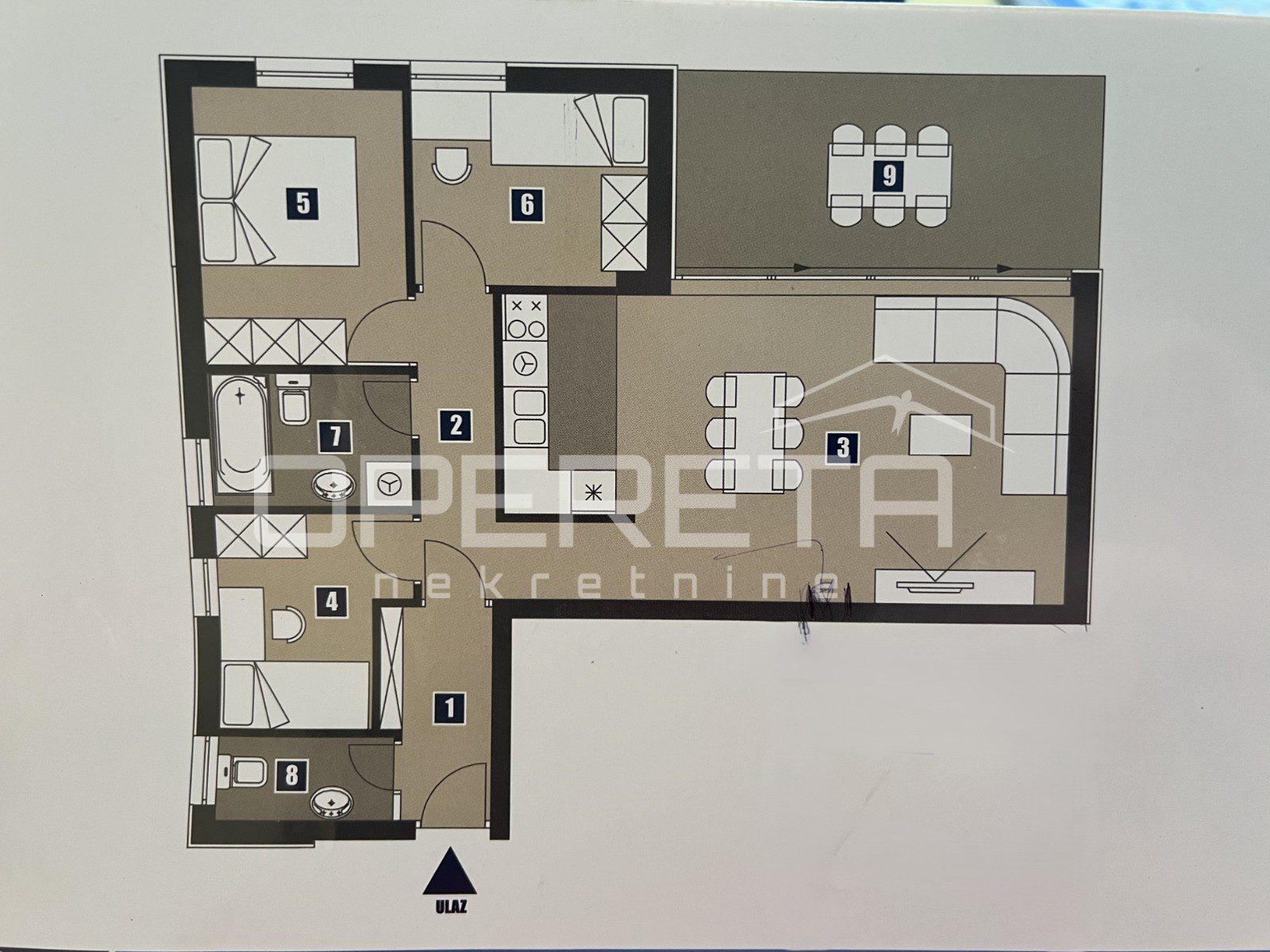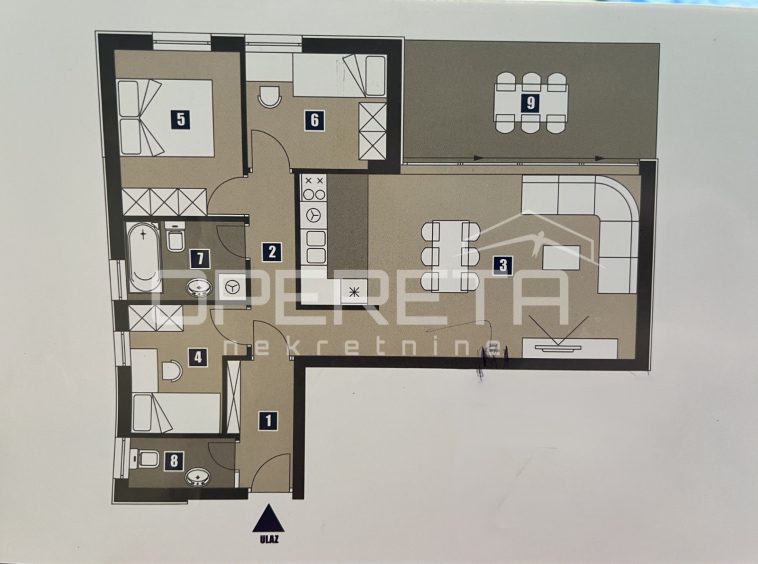 A modernly decorated and fully furnished three-bedroom apartment with a private garden and covered terrace is for sale, located on the ground floor of a small residential building in the quiet Mocire neighborhood in Zadar.