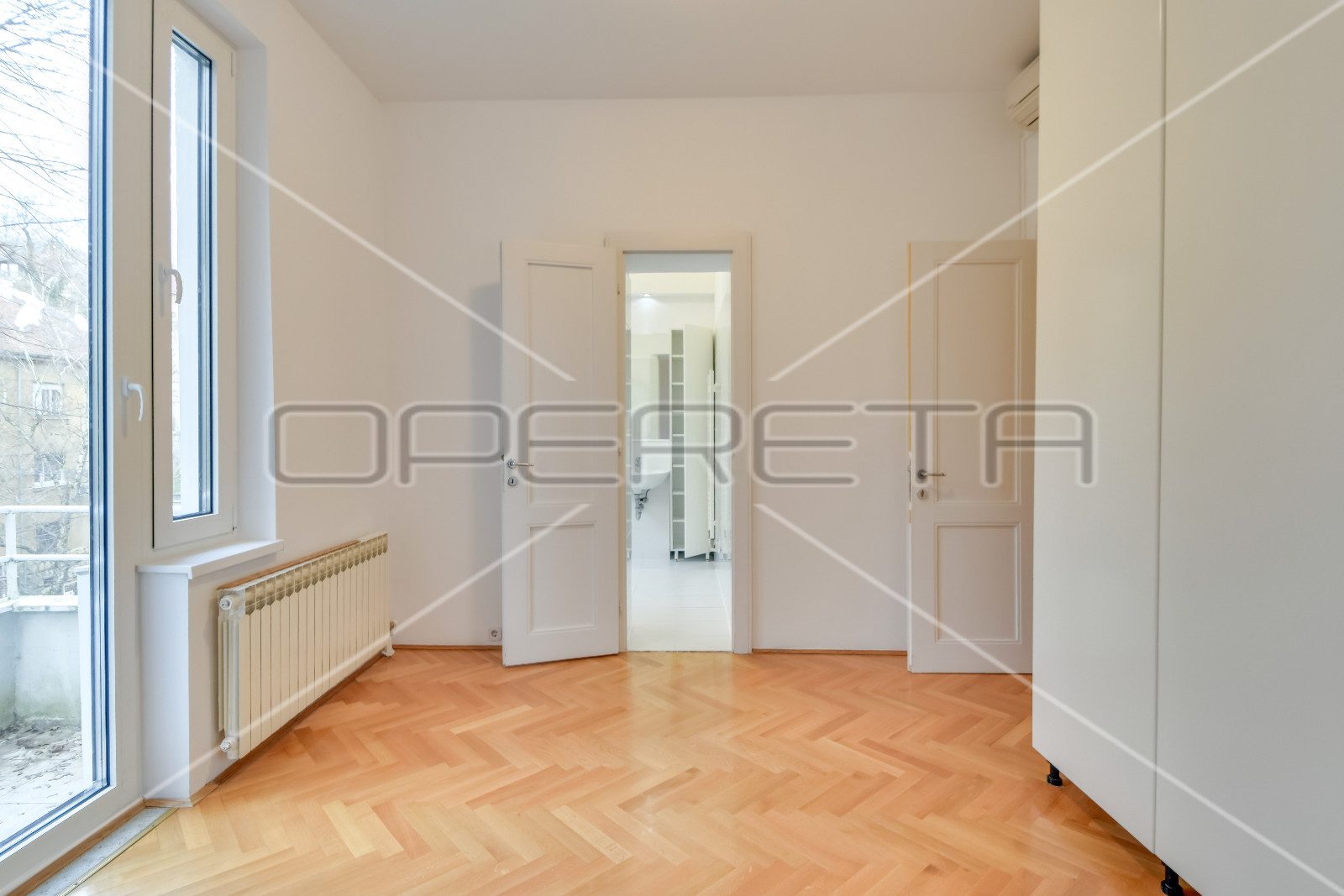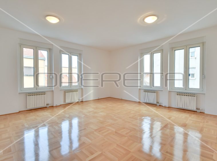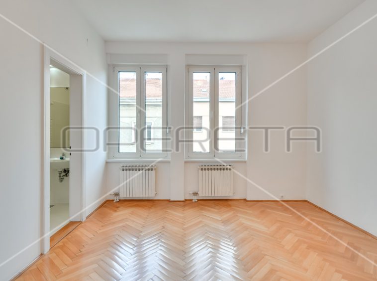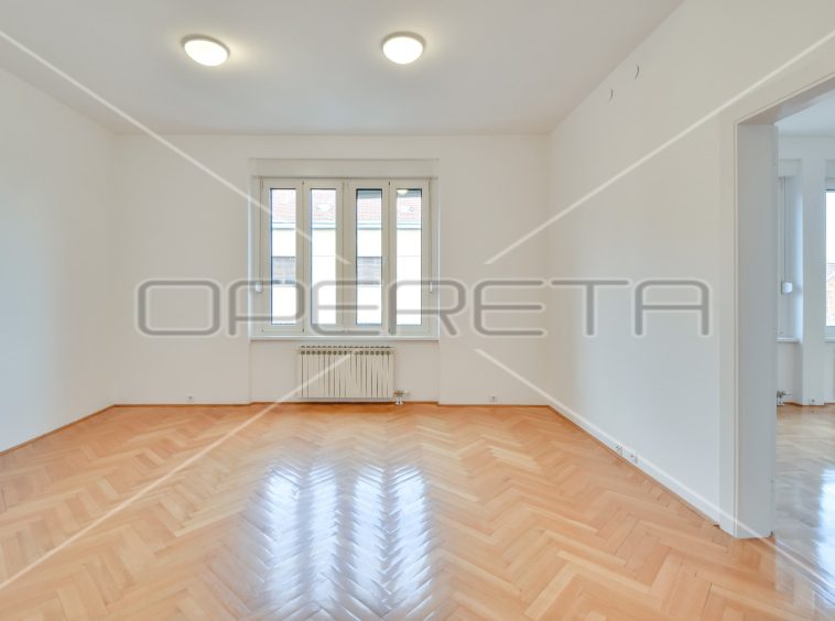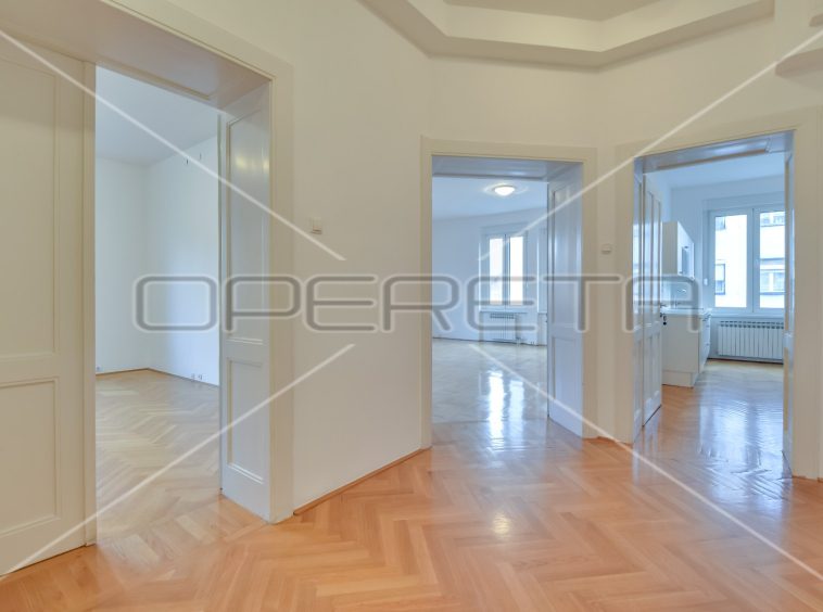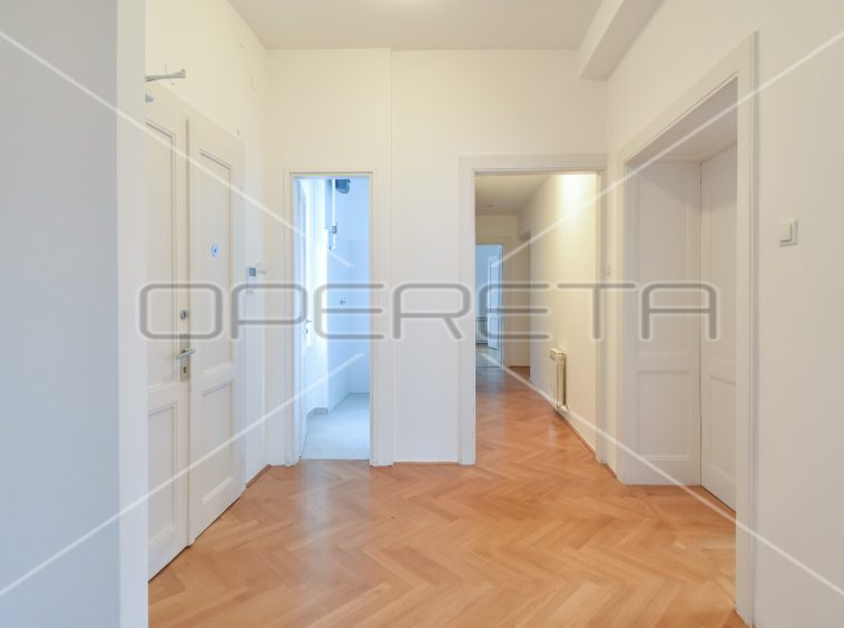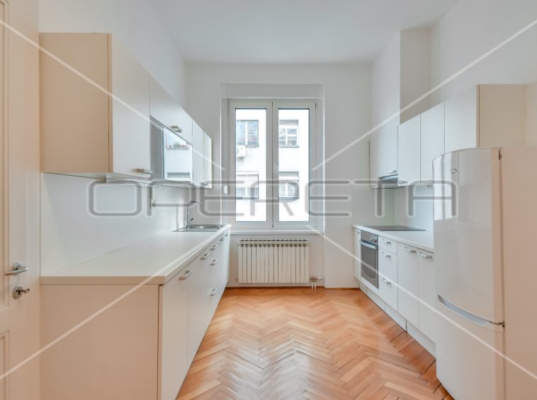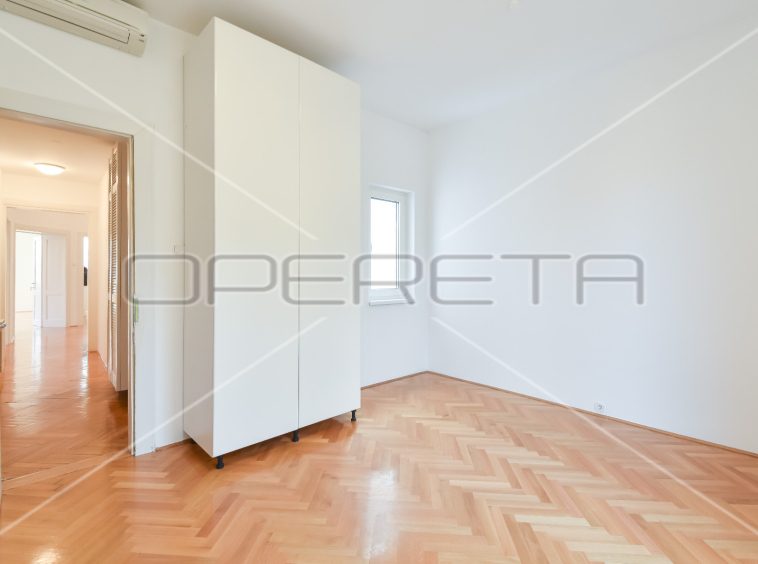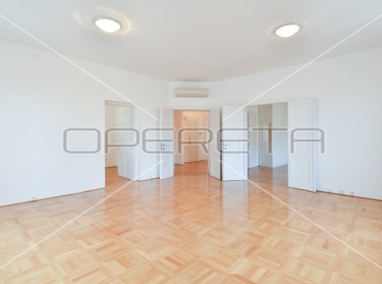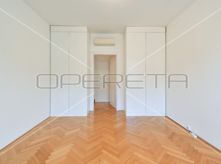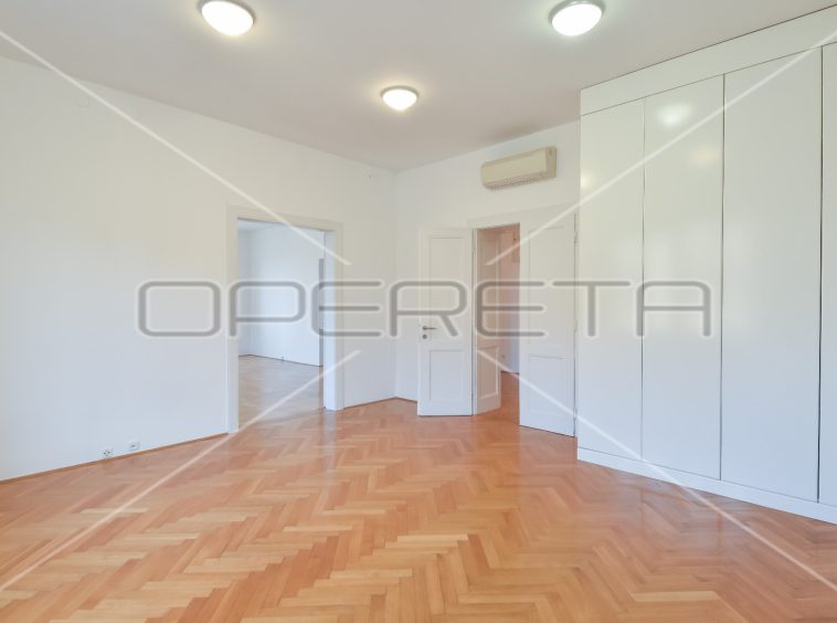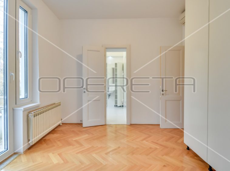 APARTMENT FOR RENT CENTER, near Britanski trg 140m2. In a building with 3 apartments, there is an apartment east / south orientation on the 1st floor of the building, semi-furnished. The apartment has a garage of 16 m2 and a terrace. It consists of an entrance hall, two bedrooms with private bathrooms, third bedroom, bathroom, guest toilet, sunny living room and kitchen with dining area. There is a laundry room in the basement and storage 7m2. Although the apartment is on the 1st floor, it has a terrace of 25.50 m2 in the yard. All rooms are air conditioned and equipped with wardrobes. Great location just two minutes away from trams and other facilities needed for everyday life.