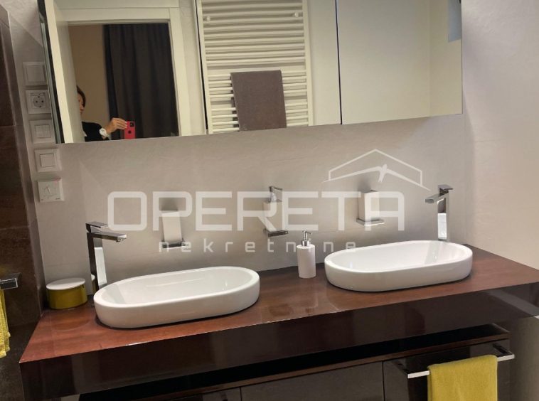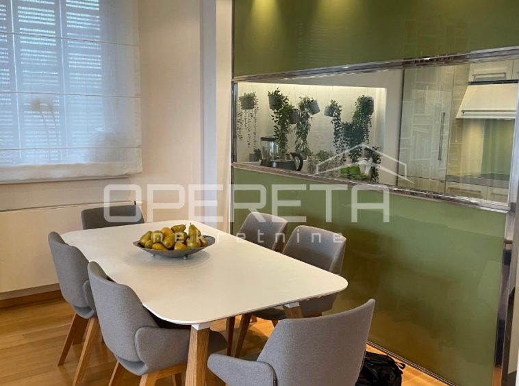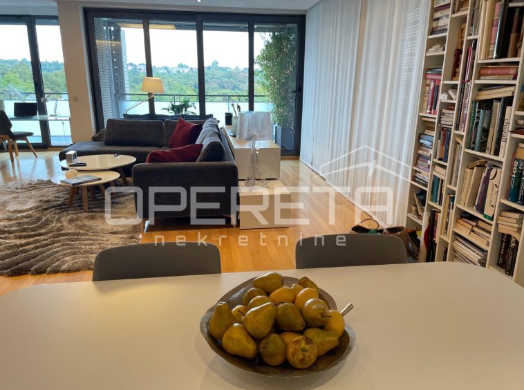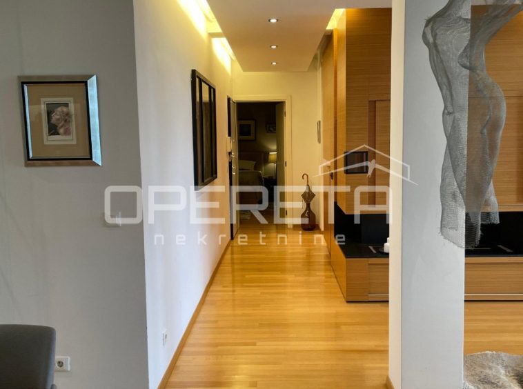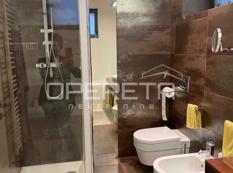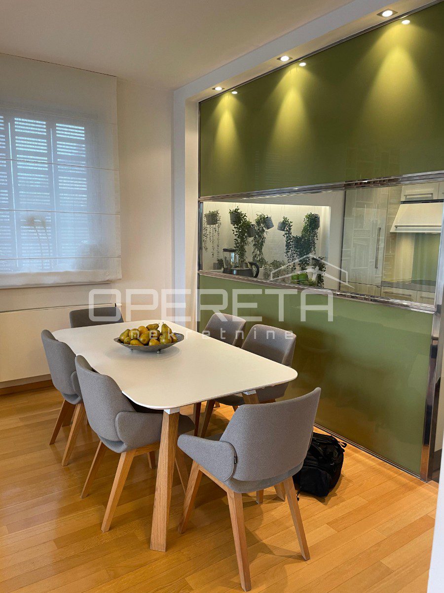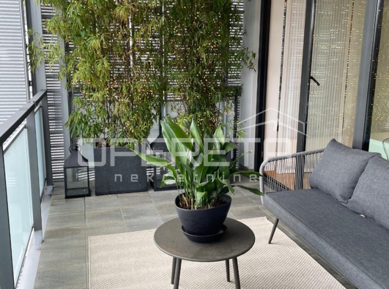 Beautifully decorated and fully furnished three-bedroom apartment of 122 m2 on the 2nd floor of a new building with an elevator. It consists of an entrance hall, spacious living room with dining room, kitchen, bedroom with private bathroom (bathtub and shower), bedroom, bathroom with shower, laundry room and loggia (17.25 m2). The apartment has 2 parking spaces in front of the building.