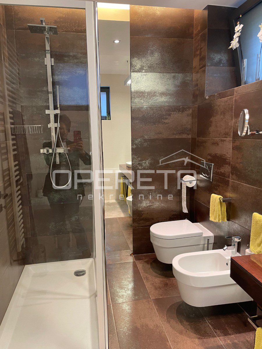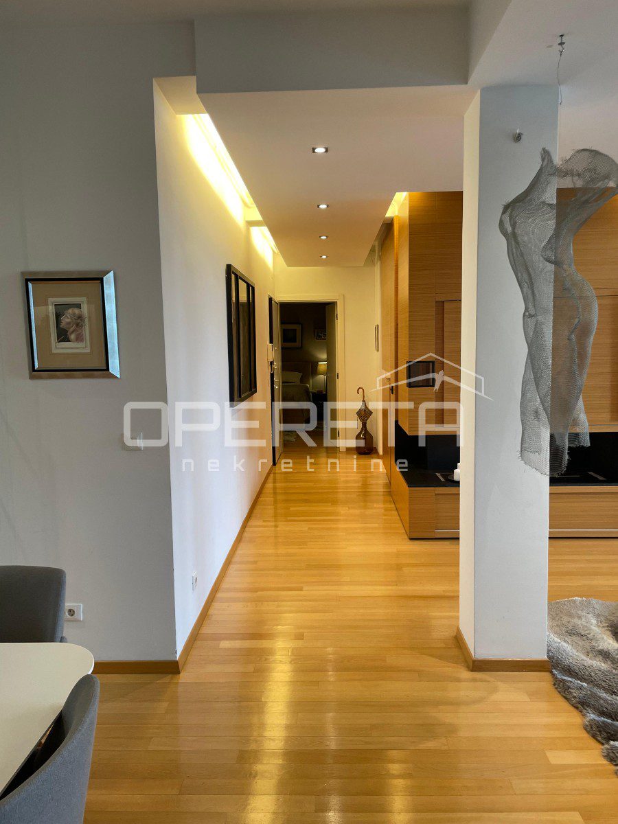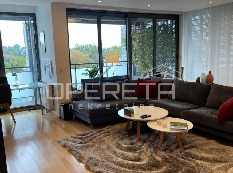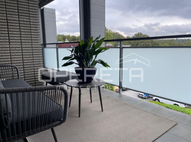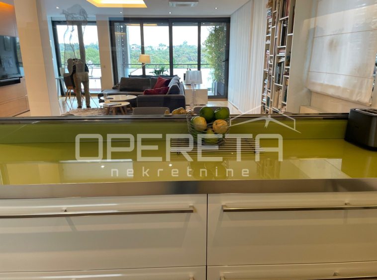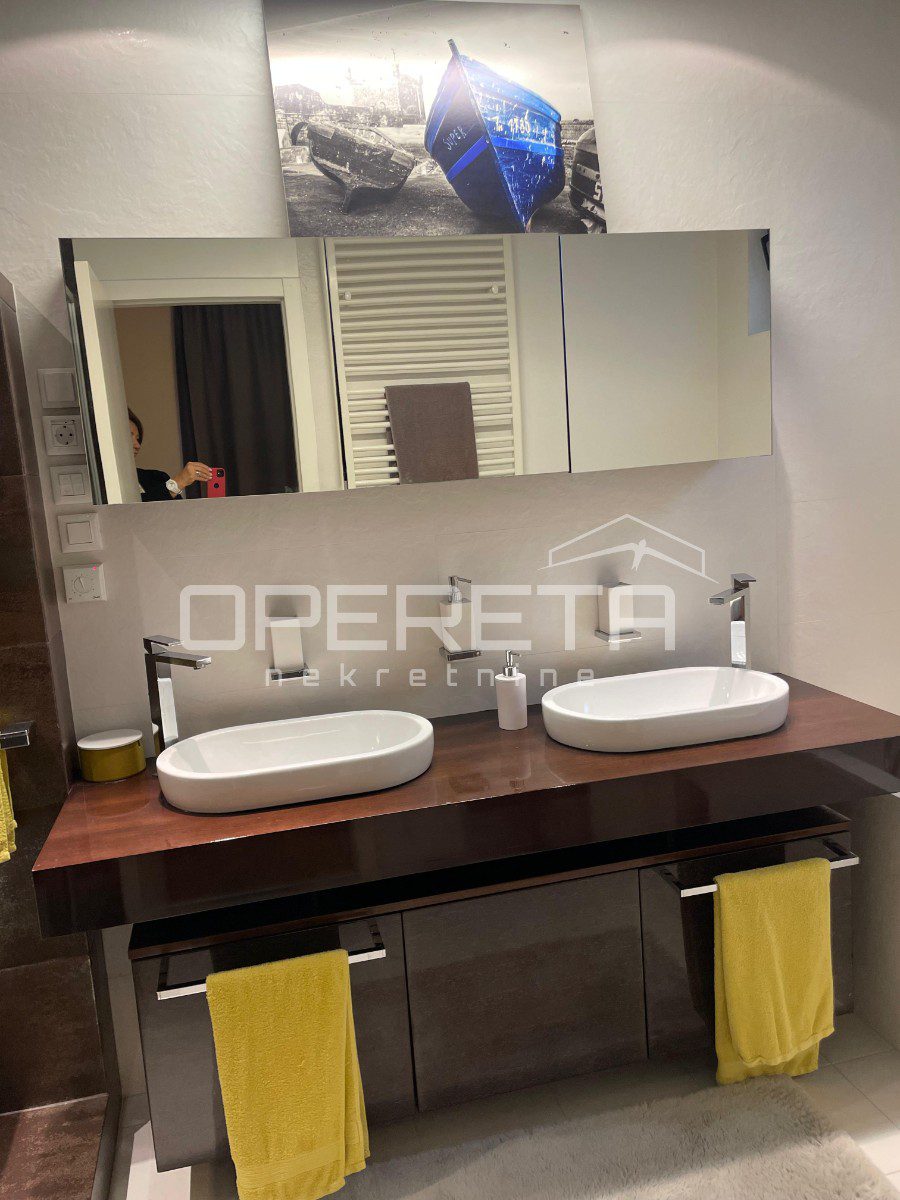Beautifully decorated and fully furnished three-bedroom apartment of 122 m2 on the 2nd floor of a new building with an elevator. It consists of an entrance hall, spacious living room with dining room, kitchen, bedroom with private bathroom (bathtub and shower), bedroom, bathroom with shower, laundry room and loggia (17.25 m2). The apartment has 2 parking spaces in front of the building.