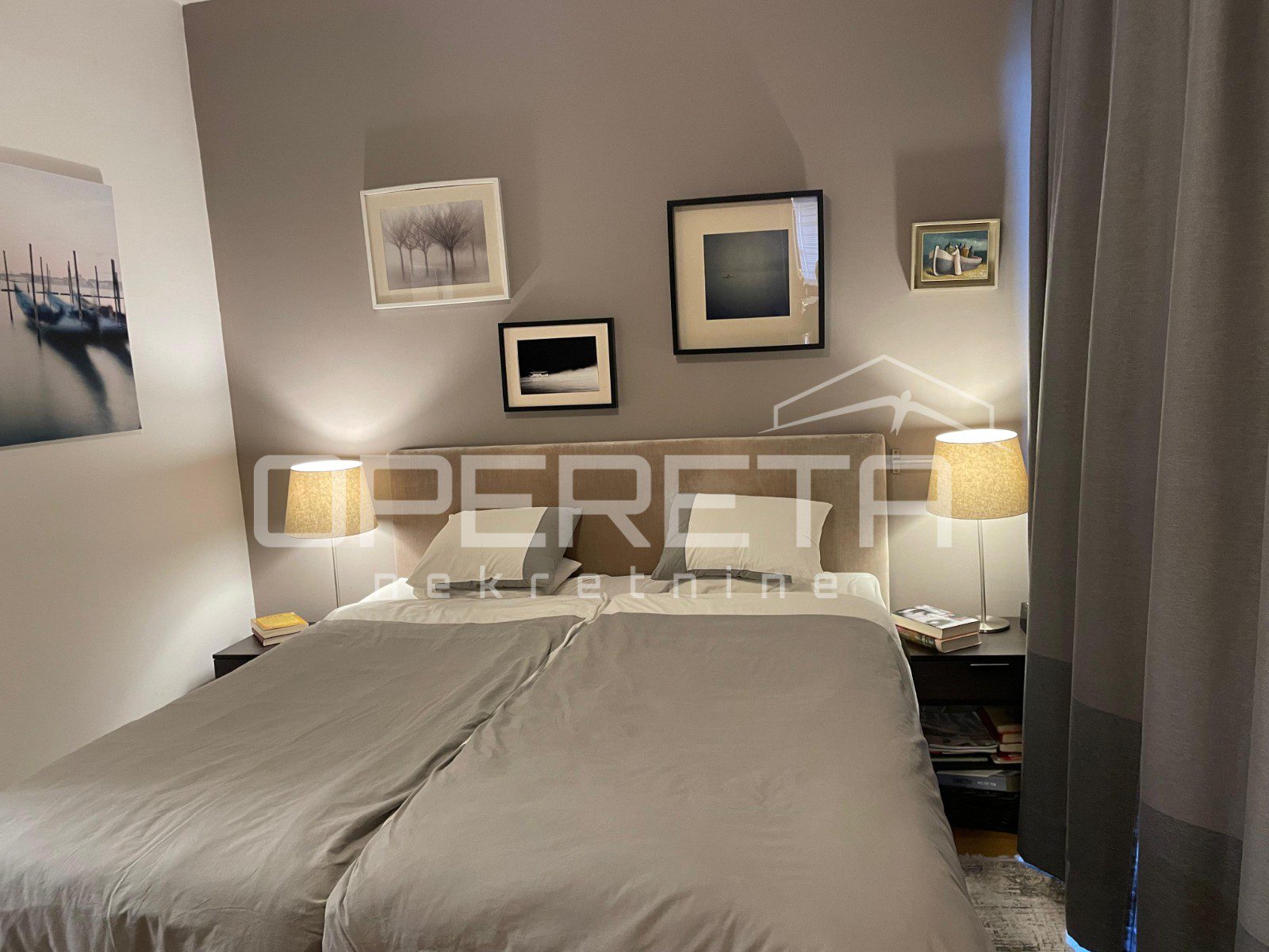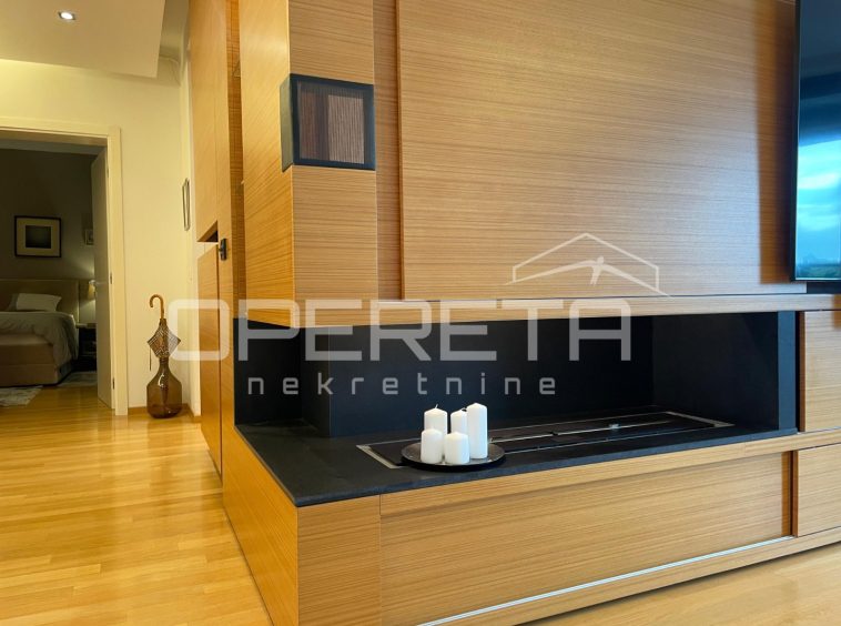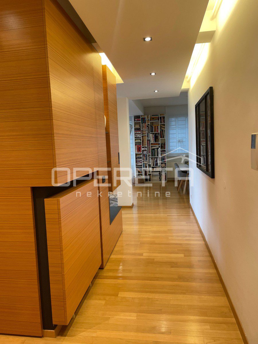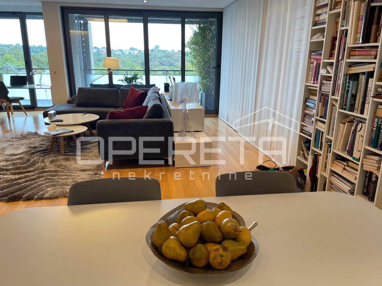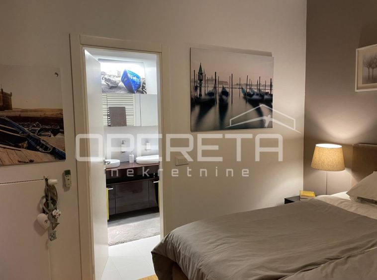 Beautifully decorated and fully furnished three-bedroom apartment of 122 m2 on the 2nd floor of a new building with an elevator. It consists of an entrance hall, spacious living room with dining room, kitchen, bedroom with private bathroom (bathtub and shower), bedroom, bathroom with shower, laundry room and loggia (17.25 m2). The apartment has 2 parking spaces in front of the building.