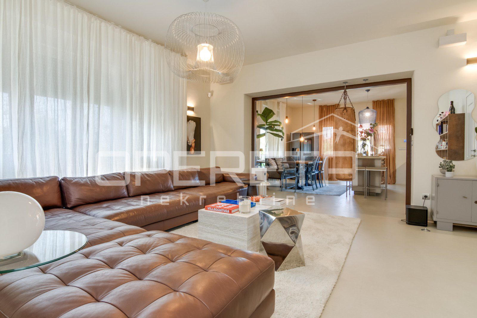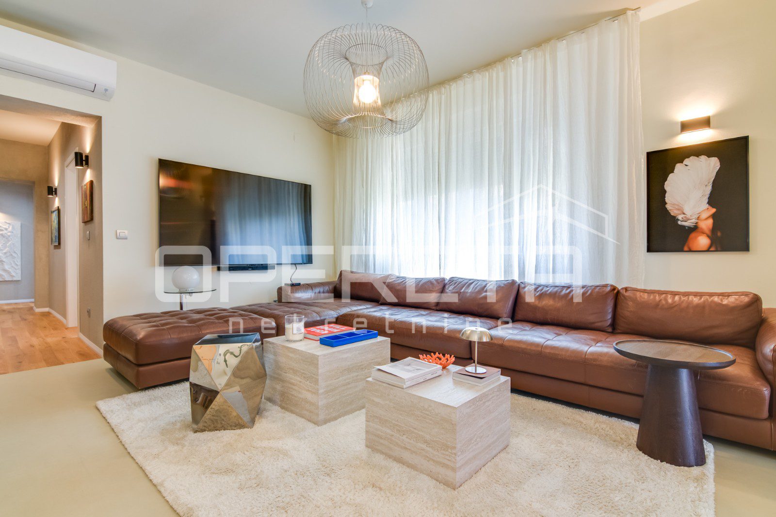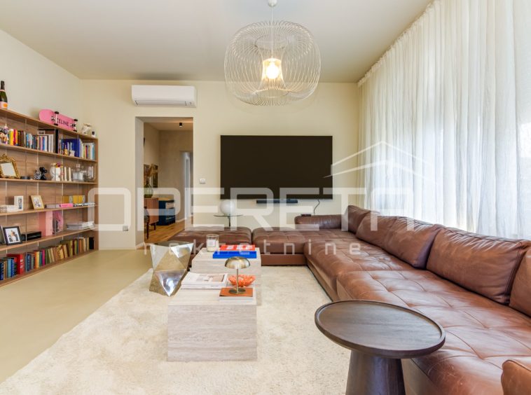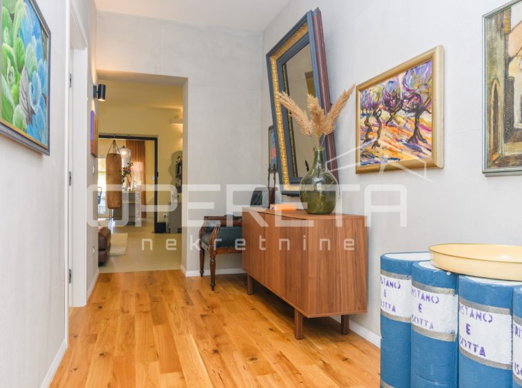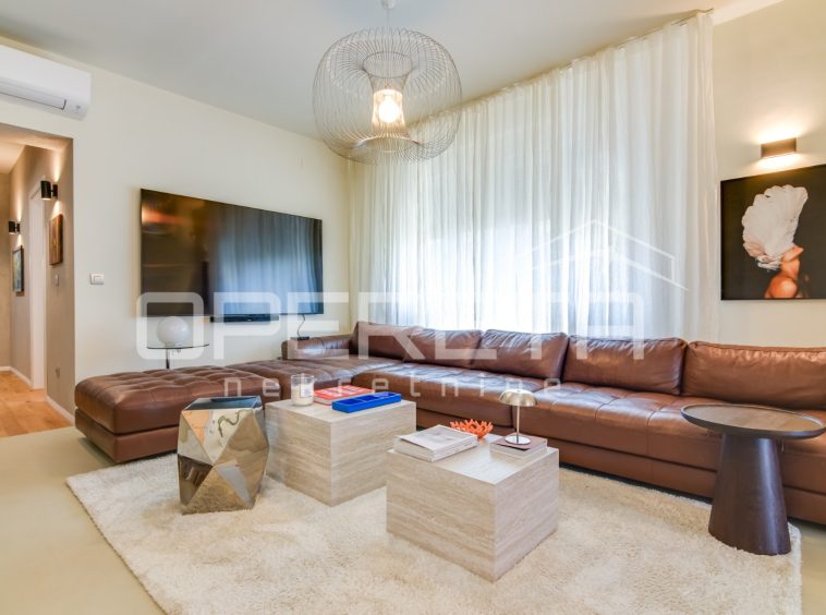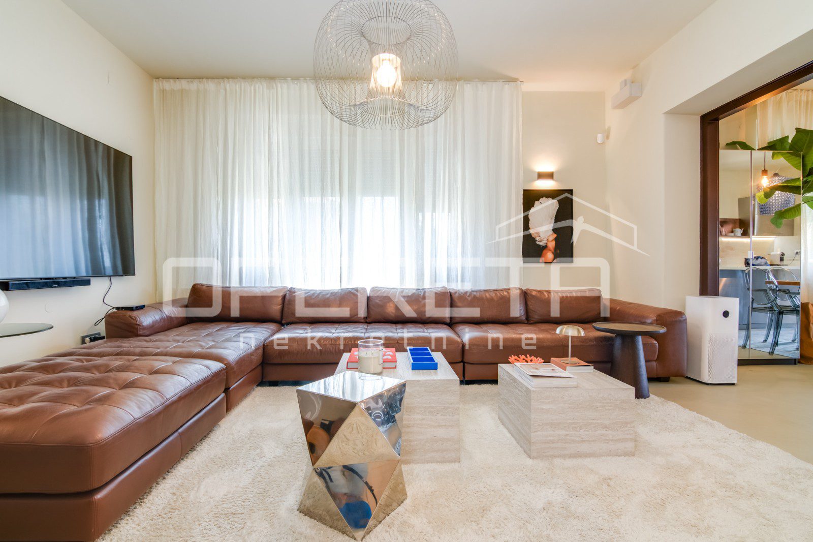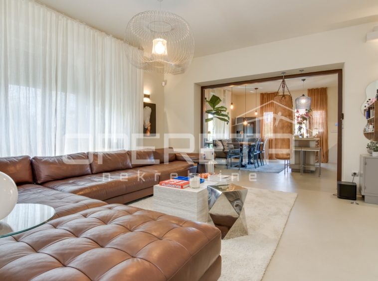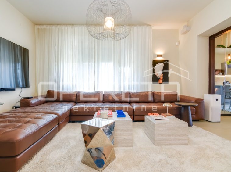 The apartment is located on the 1st floor and has two entrances. In the apartment, all water, heating, electricity installations, floors, ceilings and interior and exterior carpentry were changed, and the garage was renovated. An alarm system, cameras, electric shutter lifters and mosquito nets on all windows, as well as an infrared sauna and water filtration device, and a Bose sound system are installed. 4 Daikin air conditioners in all rooms, of different strengths. Weitzer parquet and beige microcement are installed on the floor, which is in the bathroom and toilet, as well as in the living room and kitchen. The external stairs and terrace are lined with travertine stone. There are 2 garages in the yard of the building. The apartment is for rent fully furnished.