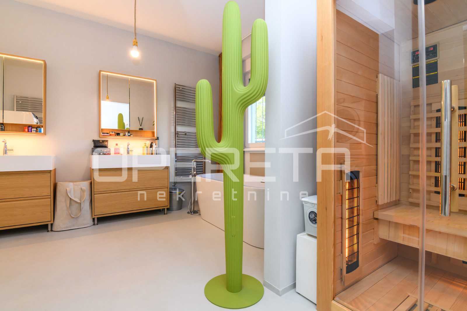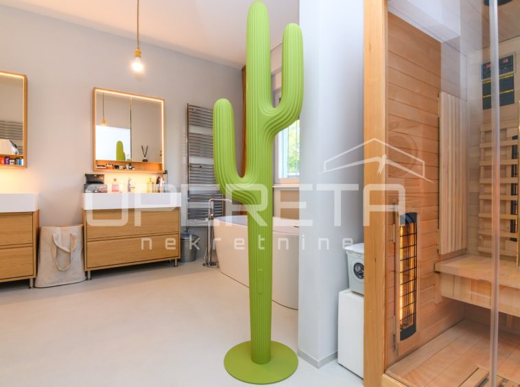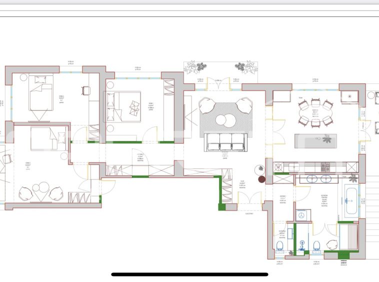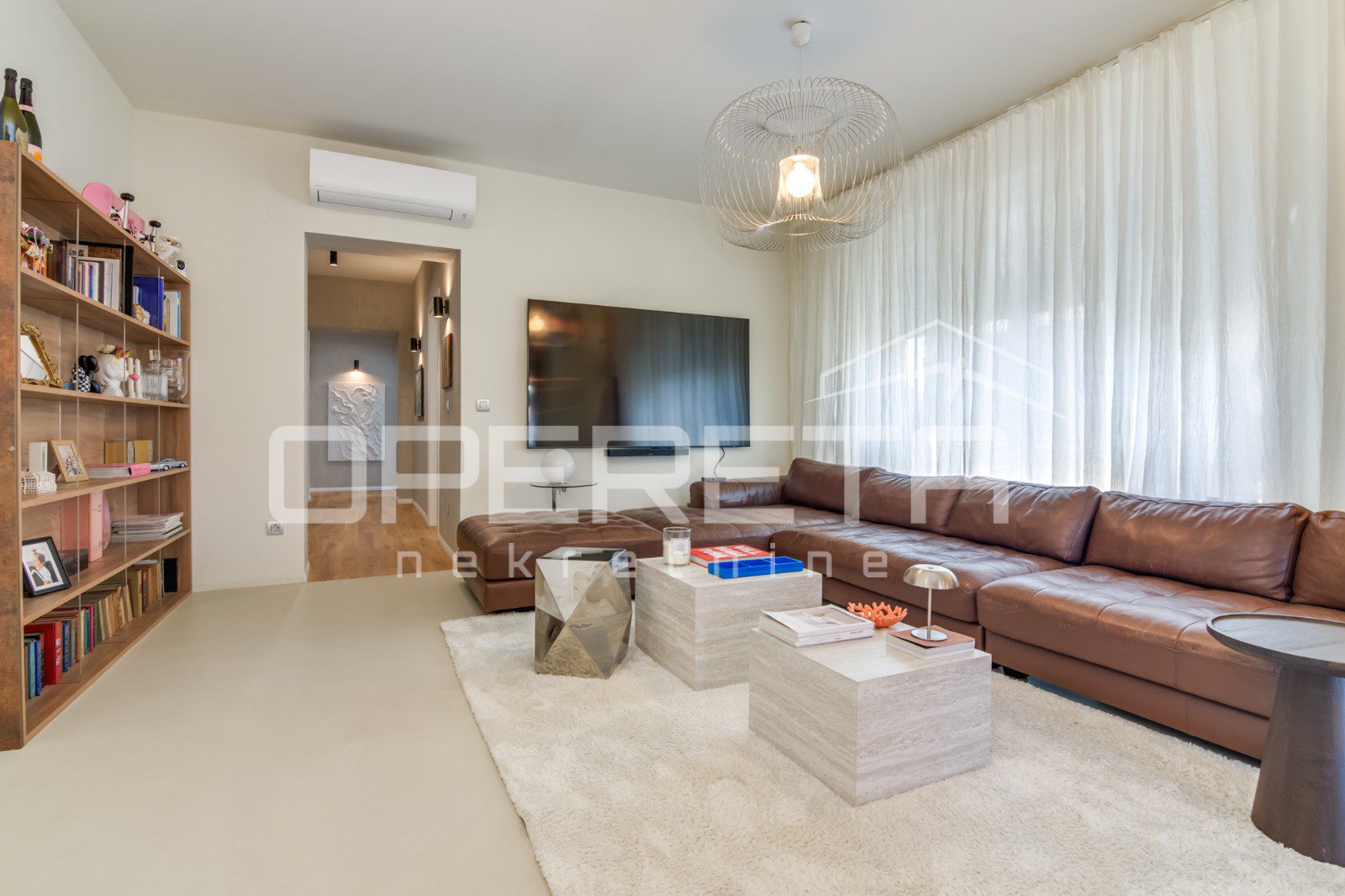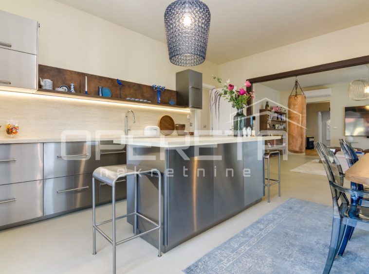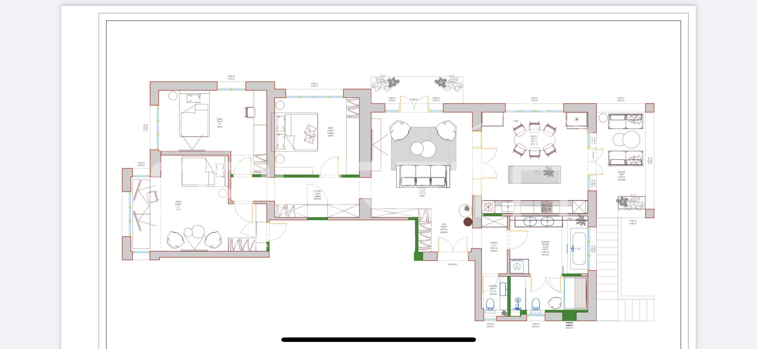 The apartment is located on the 1st floor and has two entrances. In the apartment, all water, heating, electricity installations, floors, ceilings and interior and exterior carpentry were changed, and the garage was renovated. An alarm system, cameras, electric shutter lifters and mosquito nets on all windows, as well as an infrared sauna and water filtration device, and a Bose sound system are installed. 4 Daikin air conditioners in all rooms, of different strengths. Weitzer parquet and beige microcement are installed on the floor, which is in the bathroom and toilet, as well as in the living room and kitchen. The external stairs and terrace are lined with travertine stone. There are 2 garages in the yard of the building. The apartment is for rent fully furnished.