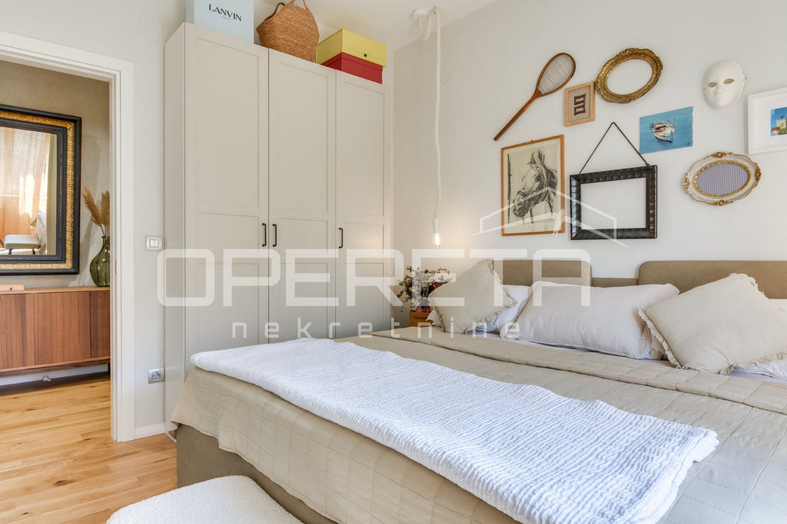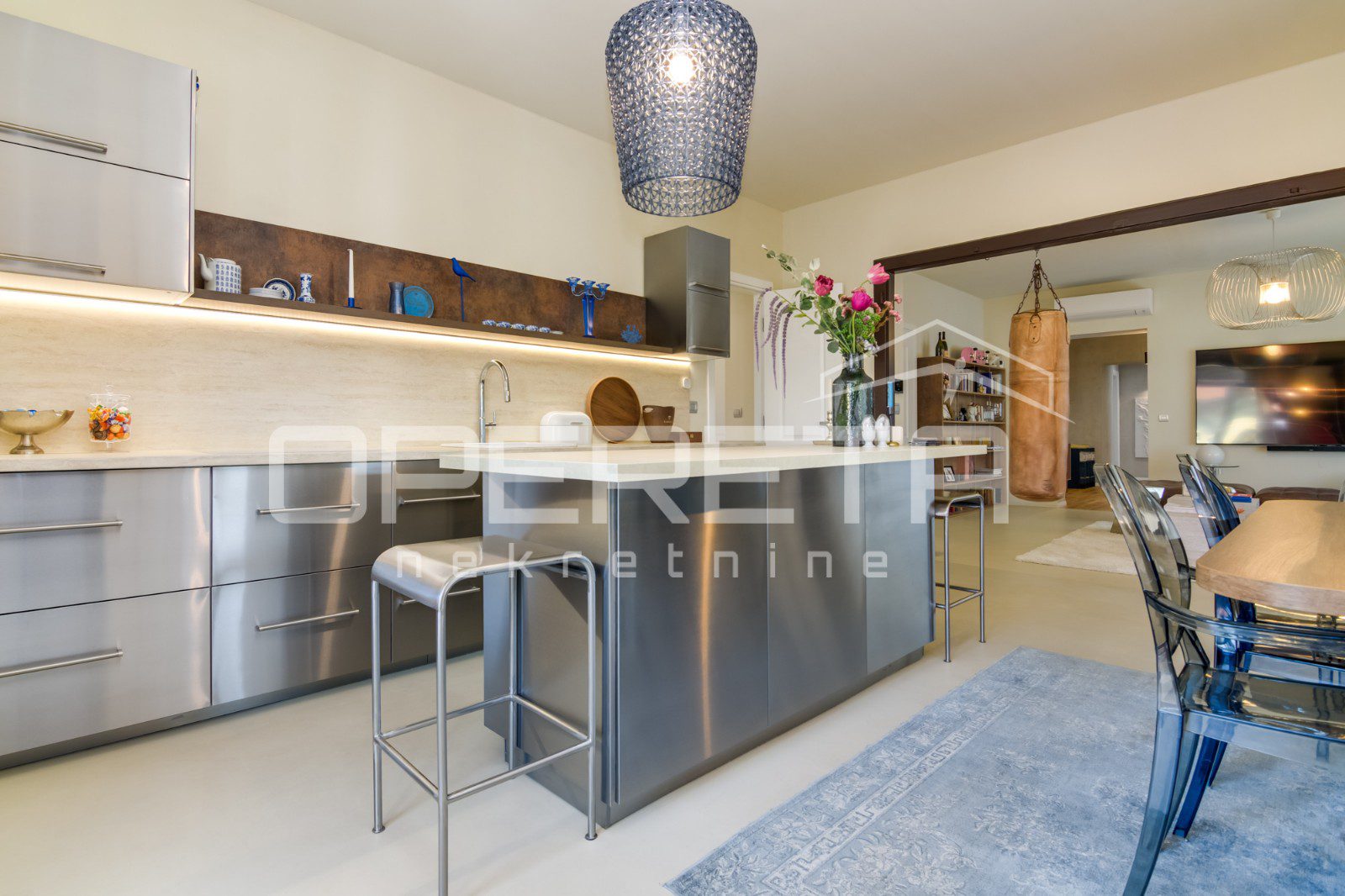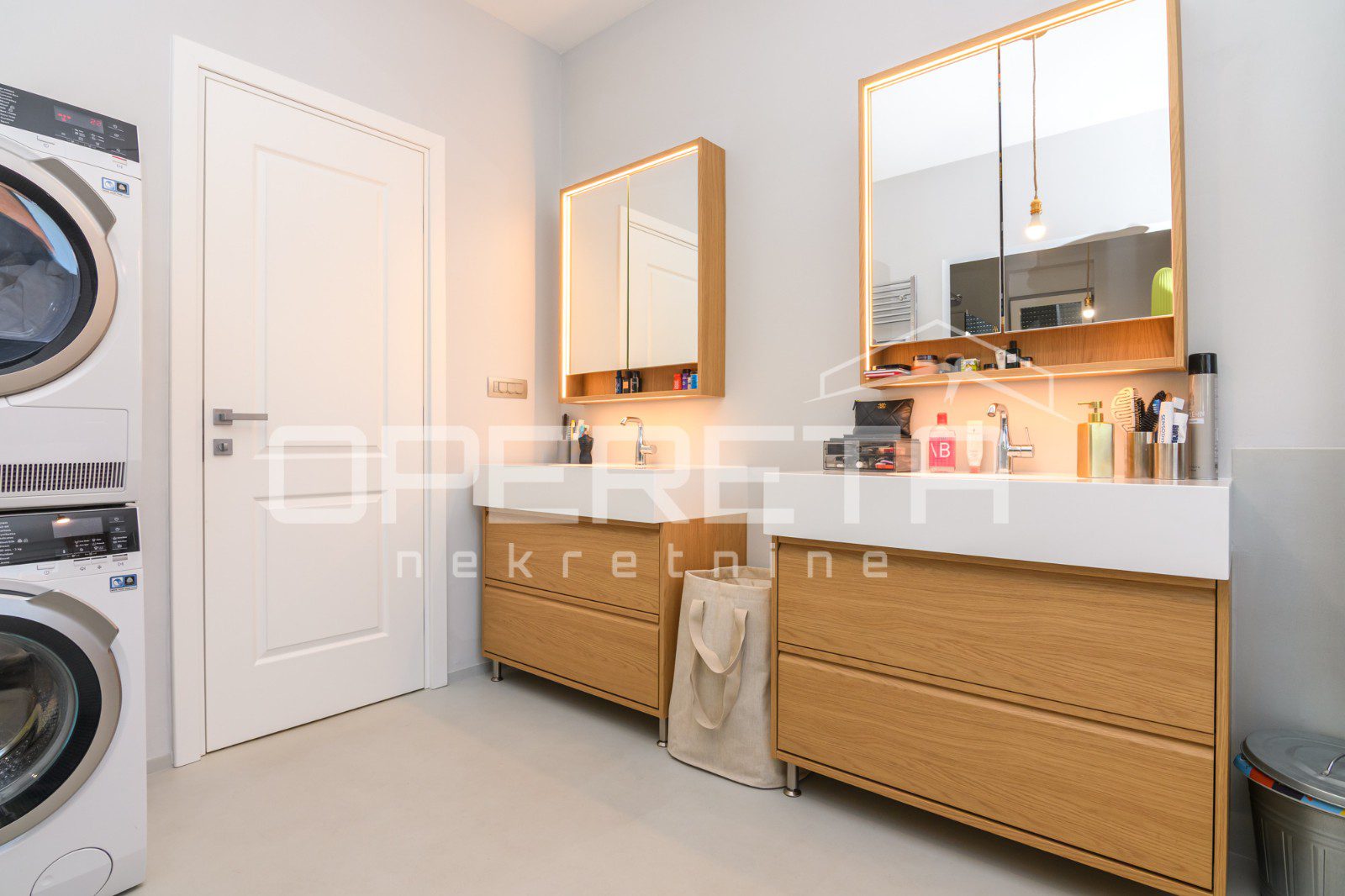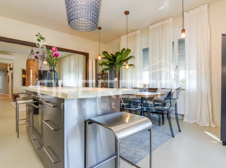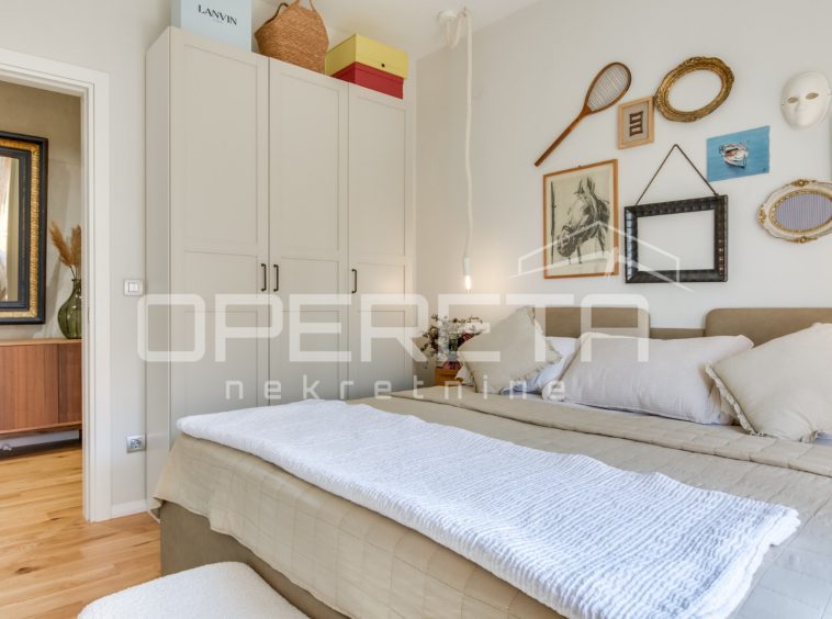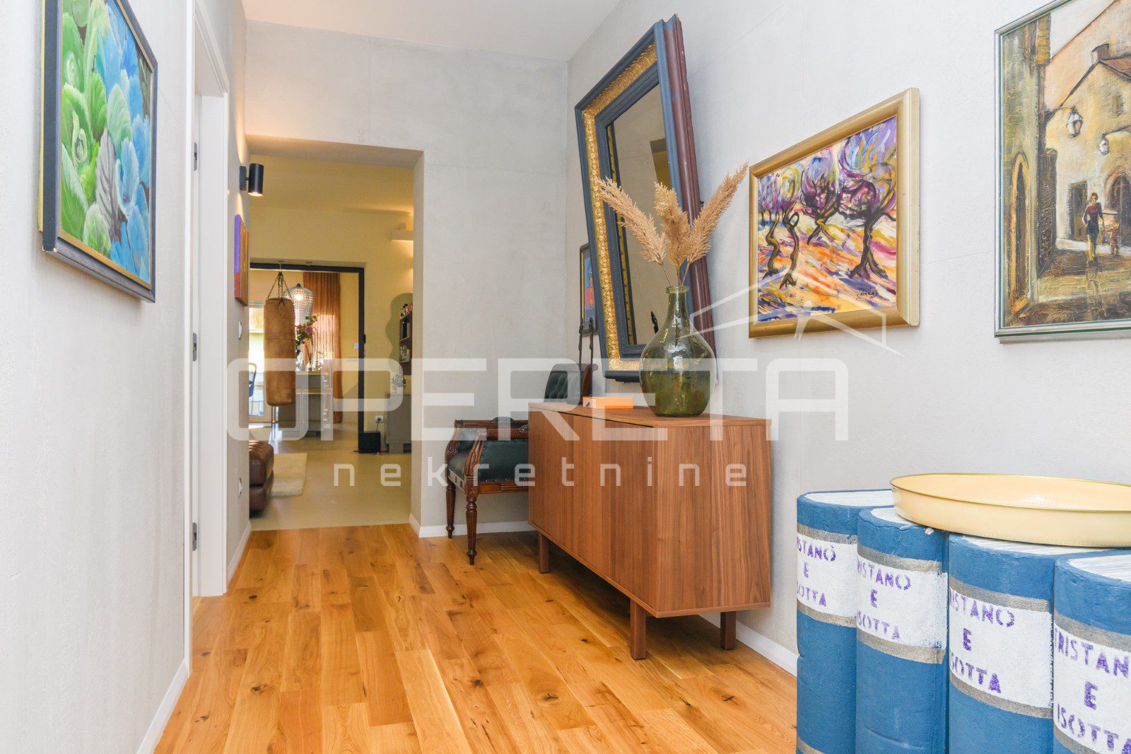 The apartment is located on the 1st floor and has two entrances. In the apartment, all water, heating, electricity installations, floors, ceilings and interior and exterior carpentry were changed, and the garage was renovated. An alarm system, cameras, electric shutter lifters and mosquito nets on all windows, as well as an infrared sauna and water filtration device, and a Bose sound system are installed. 4 Daikin air conditioners in all rooms, of different strengths. Weitzer parquet and beige microcement are installed on the floor, which is in the bathroom and toilet, as well as in the living room and kitchen. The external stairs and terrace are lined with travertine stone. There are 2 garages in the yard of the building. The apartment is for rent fully furnished.